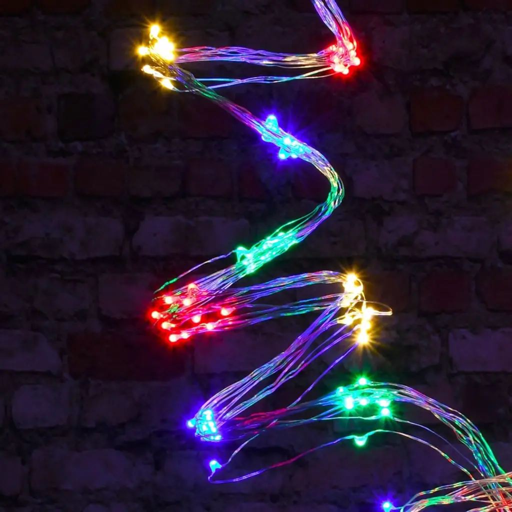 Battery-operated multi-strand fairy string lights will bring a magnificent ambience to a special event or your everyday home décor. The bendable lighted wire strands are connected to the battery pack. Bundle or separate the individual strings to create a mesmerizing display. The glowing micro LED lights look like a glimmering droplet of water clinging to a shiny wire. These weatherproof lights are perfect for illuminating floral arrangements, tabletop displays, mantels, centerpieces, and so much more. String lights require 3 AA batteries (not included).