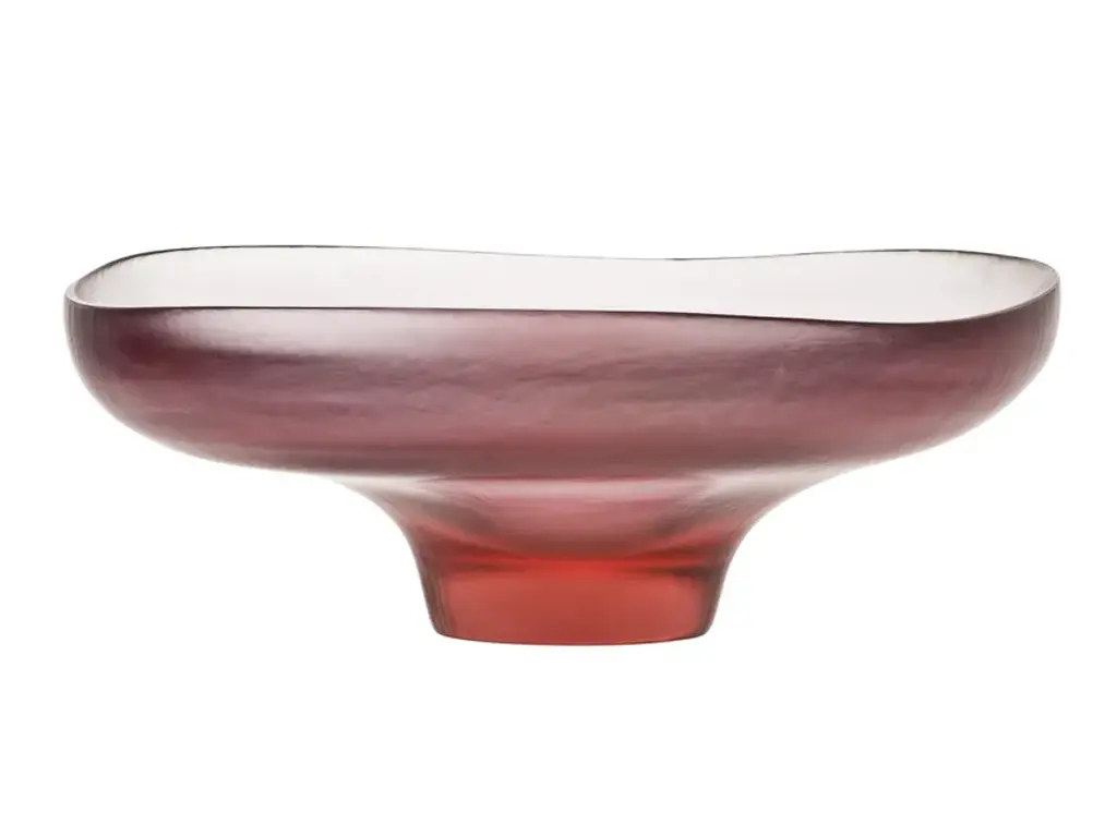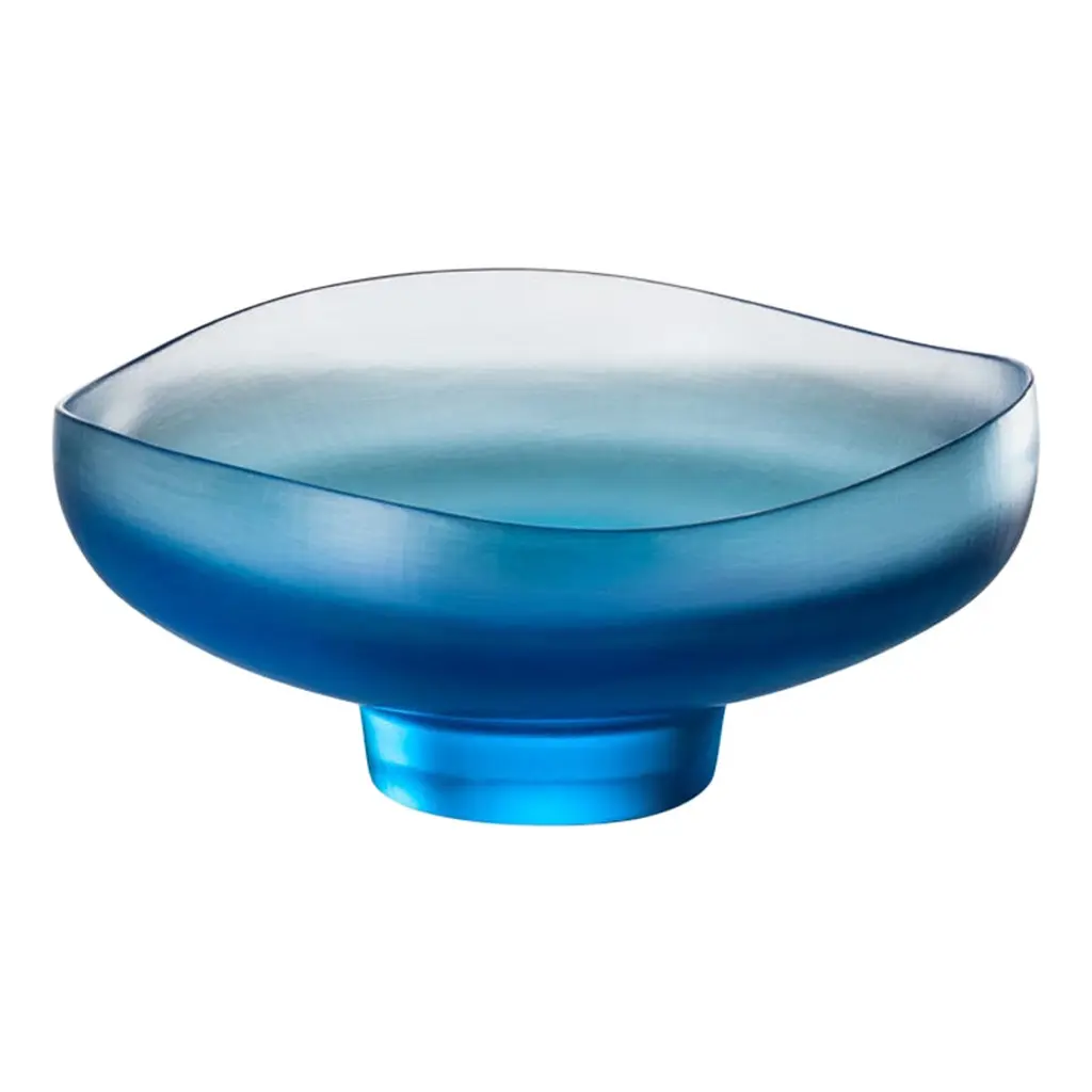 Battuti is a centerpiece made of blown, beaten glass. It reveals itself like a shell gaping open, in tones of Crystal, Aquamarine and shaded pink Alexandrite. Its translucent appearance is the result of the skill and hard work of the master glassblowers, who skillfully grind the glass to lend it a unique slightly slubbed texture.Colors: AquamarineOn request Crystal. PinkShapes with undulating edges stretch upwards from a solid blown glass base. The transparencies are given substance by the lines and marks of the grinding wheels used by Venini’s master glass makers.Edition numbered by year