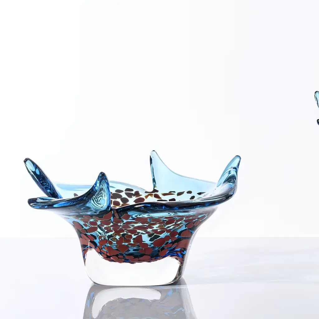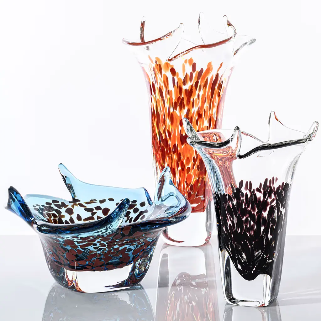 A collection of vases and centerpieces bearing Marco Piva's signature signifies sustainability and the revival of the practically eternal material—glass. The Bloom vase, guided by Marco Piva, is crafted by expert glassmakers in an exclusive blend of differently colored and granulated crystals and glass, forming a limited and numbered series. Each piece, unique in its form and decorative essence, stems from a meticulous fusion of selected materials reclaimed from prior works.