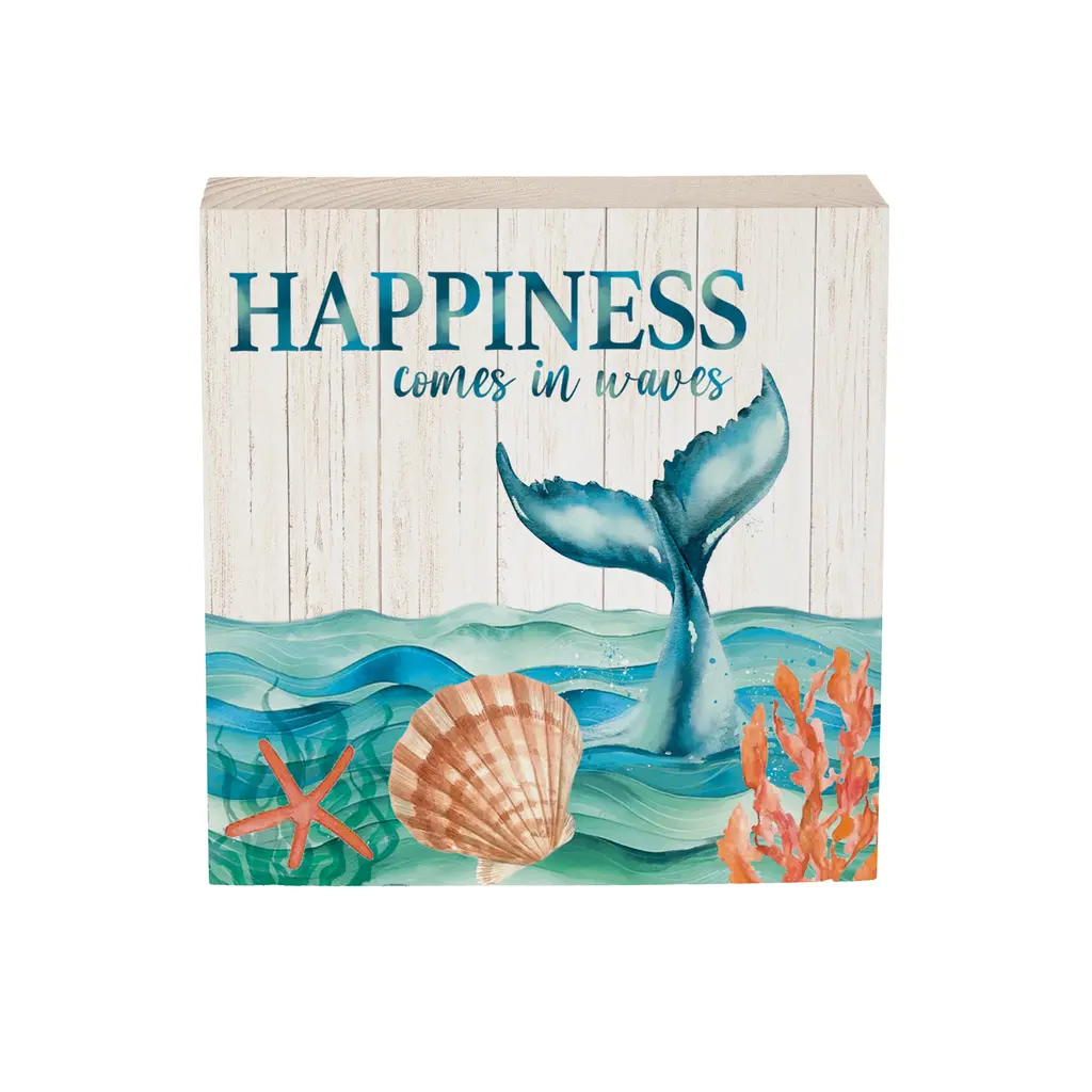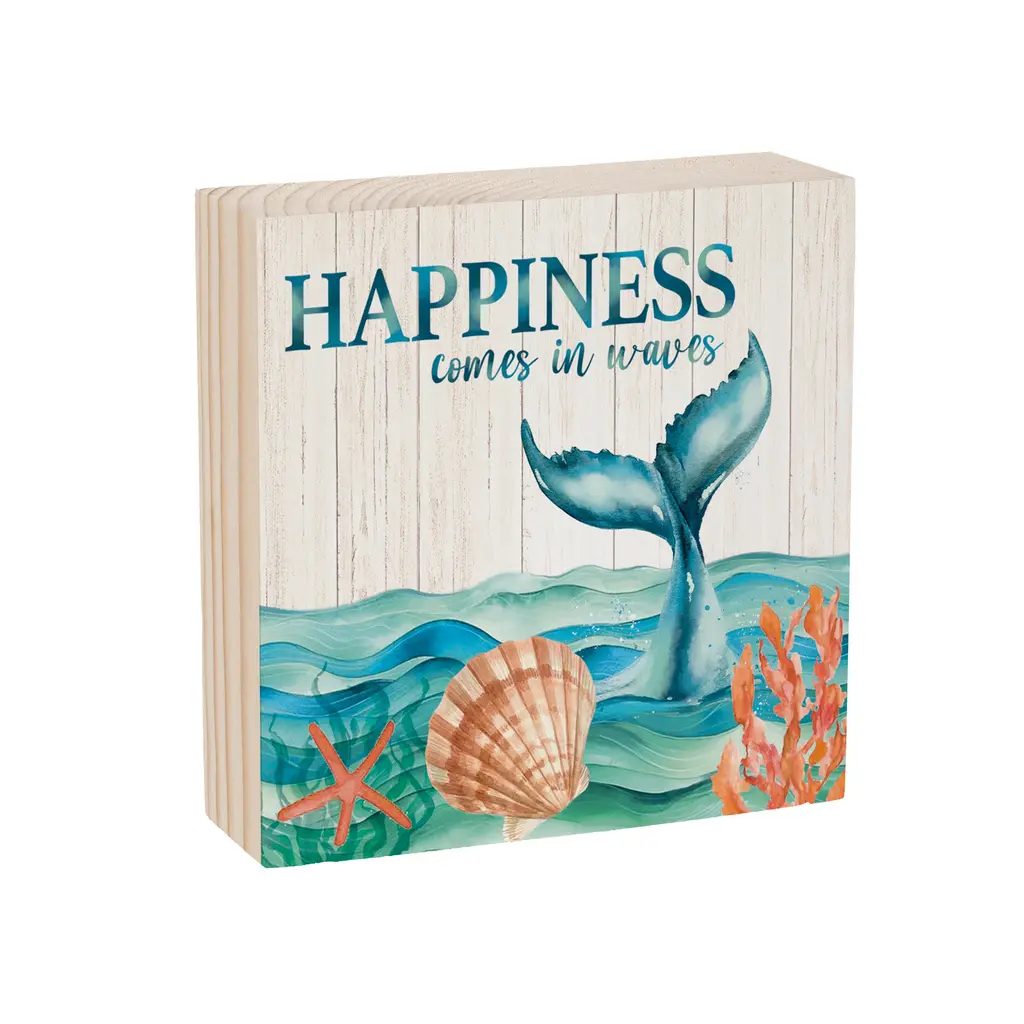 Blue Coastal Happiness Waves Sign Wood Block "Happiness", 6"x6"