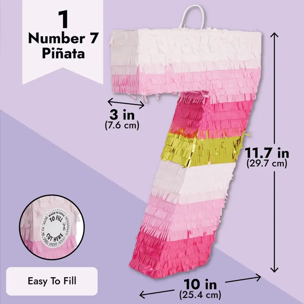 Add a fun and festive touch to your next celebration with our pink and gold foil pinata in the shape of a number 7. Whether you're celebrating a child's 7th birthday or a milestone anniversary, this pinata is the perfect addition to your 7th birthday decorations for girls. Measuring 11.7x10 inches, this pinata is the perfect size for hanging from a ladder, roof, railing, or tree. Simply use the included rope to hang it up and let the fun begin. Children and adults of all ages will love taking turns trying to break open the pinata to reveal the hidden treats inside, such as toys, chocolates, or confetti. The pink and gold foil tissue paper design adds an extra touch of style to your party decorations, making it a great addition to any 7 year old birthday celebration for girls. It's also versatile enough to use as a table centerpiece for an upcoming anniversary celebration. Overall, this pinata is a fun and interactive party game that is sure to be a hit with guests of all ages. So add it to your party supplies today and get ready for a fun-filled celebration!