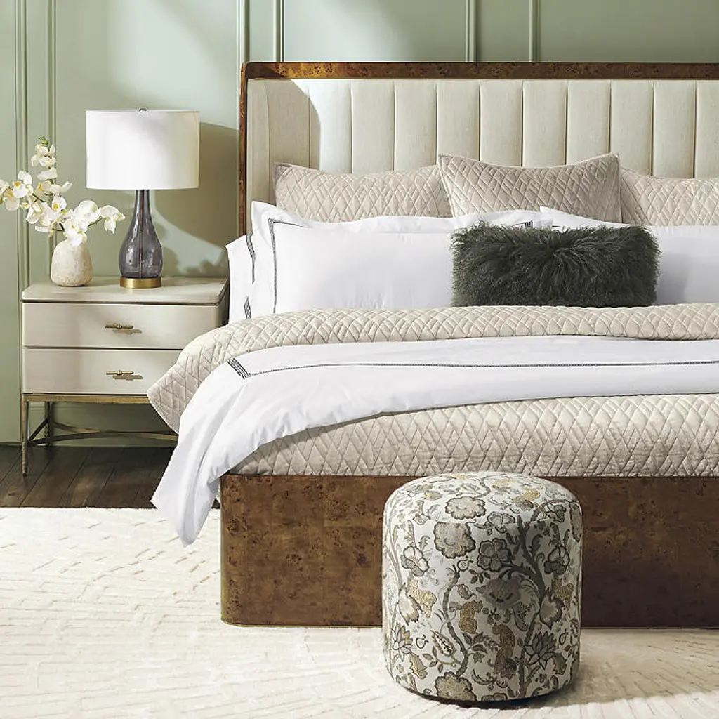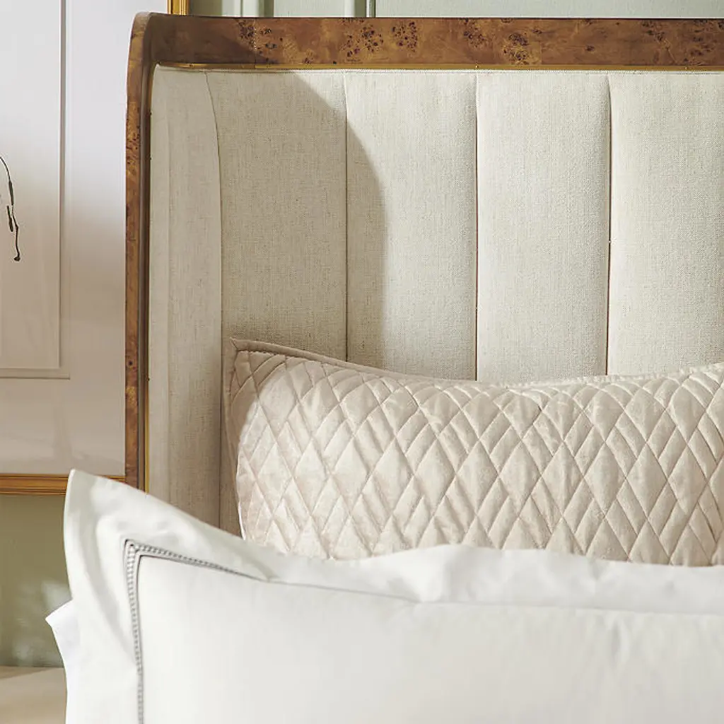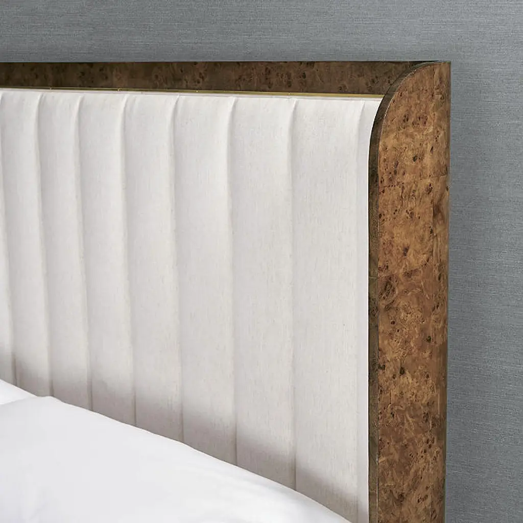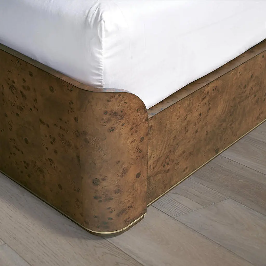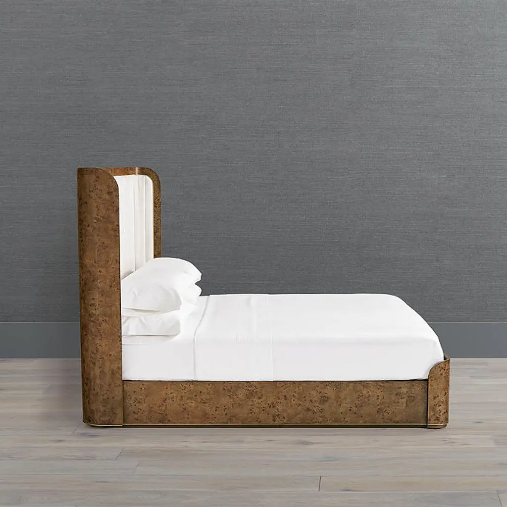 Beautifully designed from top to bottom, our Brando Bed will be the stunning centerpiece of your bedroom. Crafted of mahogany hardwood and engineered wood with Mappa burl veneer that allows the beautiful swirls of the burl to come through, this bed features an upholstered shelter-style headboard accented with vertical channeled tufting and brass trim. Crafted of mahogany hardwood and engineered wood with Mappa burl veneer Antiqued burnished brass-finished hardware Russet finish Plush Crypton high-performance fabric offers everyday stain, moisture and odor protection. To prevent injuries or damage to item, recommended team lift (two or more people) for furniture placement Designed to be used with a mattress; no box spring neededQueen Bed AssemblyKing Bed Assembly Coordinates with other items in the Brando Collection Imported A Frontgate exclusive. At Frontgate, our primary focus is quality. We guarantee that every product we sell will stand up to the supreme test – our customers' satisfaction. To learn more about our policies, visit our Shipping & Processing, Returns & Exchanges and Warranty & Price Guarantee pages.