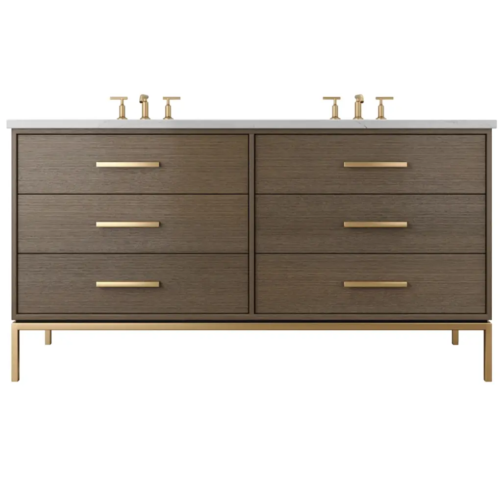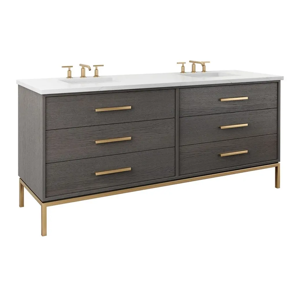 Introducing the Briar White Oak Double Drawer Bathroom Vanity, a masterpiece of Neo Modern design that promises to transform your bathroom into a sanctuary of elegance and functionality. Crafted with precision, this exquisite vanity is a testament to the beauty of oak wood, featuring a rift cut veneer that exudes sophistication. The design is not only visually stunning but also highly practical, with four functional drawers ingeniously crafted to clear plumbing, ensuring a seamless and clutter-free experience. The metal base adds a touch of contemporary flair, harmonizing beautifully with the natural allure of the wood. Available in various sizes and finish combinations, the Briar White Oak Double Drawer Bathroom Vanity is a versatile addition to any bathroom, offering both style and substance. Let this vanity be the centerpiece of your bathroom, where modern design meets timeless elegance, creating a space that is both inviting and inspiring.