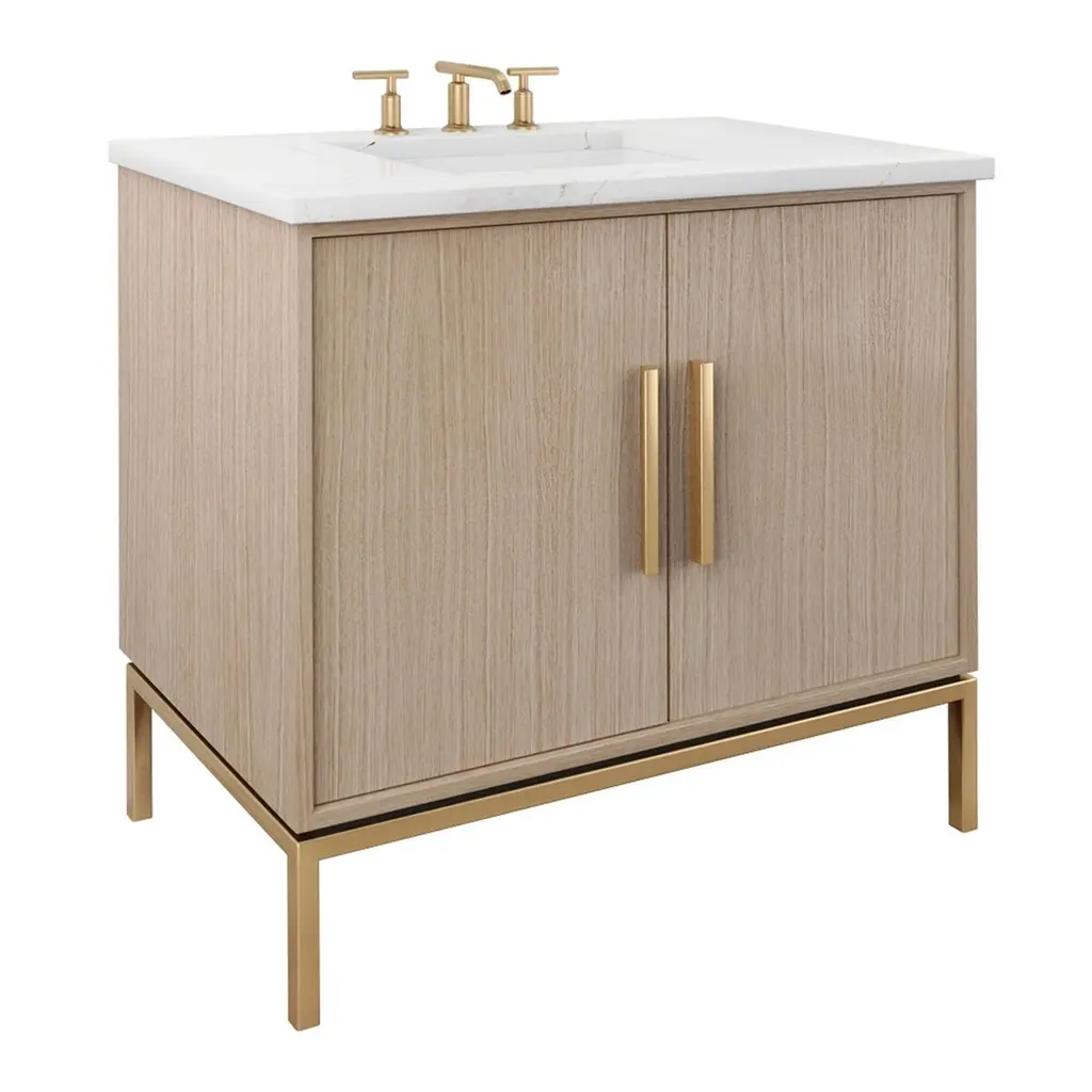 Introducing the Briar White Oak Single Bathroom Vanity, a masterpiece of Neo Modern design that promises to transform your bathroom into a sanctuary of elegance and style. This exquisite vanity is crafted from the finest oak wood, showcasing a rift cut white oak veneer that exudes sophistication and timeless beauty. With its sleek metal base, this vanity stands as a testament to the harmonious blend of natural materials and modern design. The Briar White Oak Single Bathroom Vanity features two elegantly designed doors, offering ample storage space while maintaining a clean and uncluttered look. Available in a variety of sizes, this vanity can seamlessly fit into any bathroom space, providing both functionality and a touch of luxury. The multiple wood and metal finish combinations allow you to customize the vanity to perfectly match your personal style and the aesthetic of your home. Let the Briar White Oak Single Bathroom Vanity be the centerpiece of your bathroom, where every detail speaks of quality and refined taste. Embrace the allure of modern elegance with this stunning piece that promises to elevate your daily routine into a moment of indulgence.