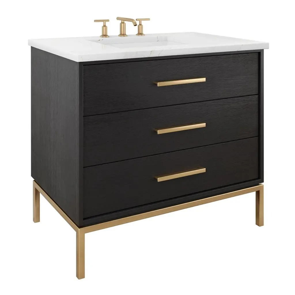 Introducing the Briar White Oak Three-Drawer Single Bathroom Vanity, a masterpiece of Neo Modern design that captures the essence of elegance and functionality. Crafted from exquisite oak wood, this single Bathroom Vanity is a testament to refined taste and sophisticated style. Its design features two functional drawers, thoughtfully engineered to accommodate plumbing, ensuring both practicality and aesthetic appeal. The rift cut white oak veneer exudes a timeless charm, while the sturdy metal base adds a touch of contemporary flair. Available in a variety of sizes and finish combinations, the Briar collection offers versatility to suit any space. Let this vanity be the centerpiece of your bathroom, where form meets function in perfect harmony, creating a sanctuary of beauty and tranquility.