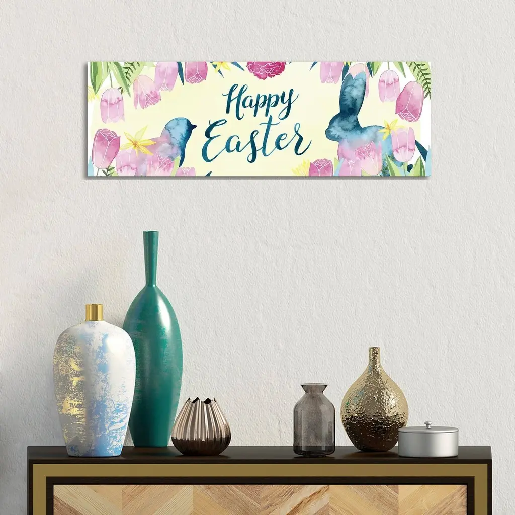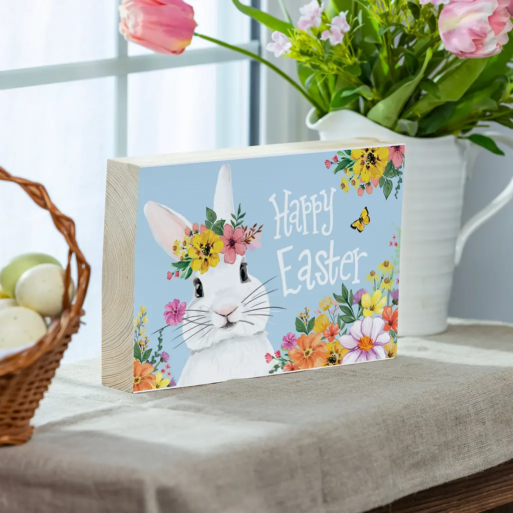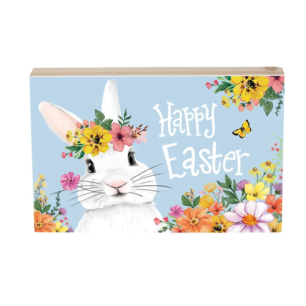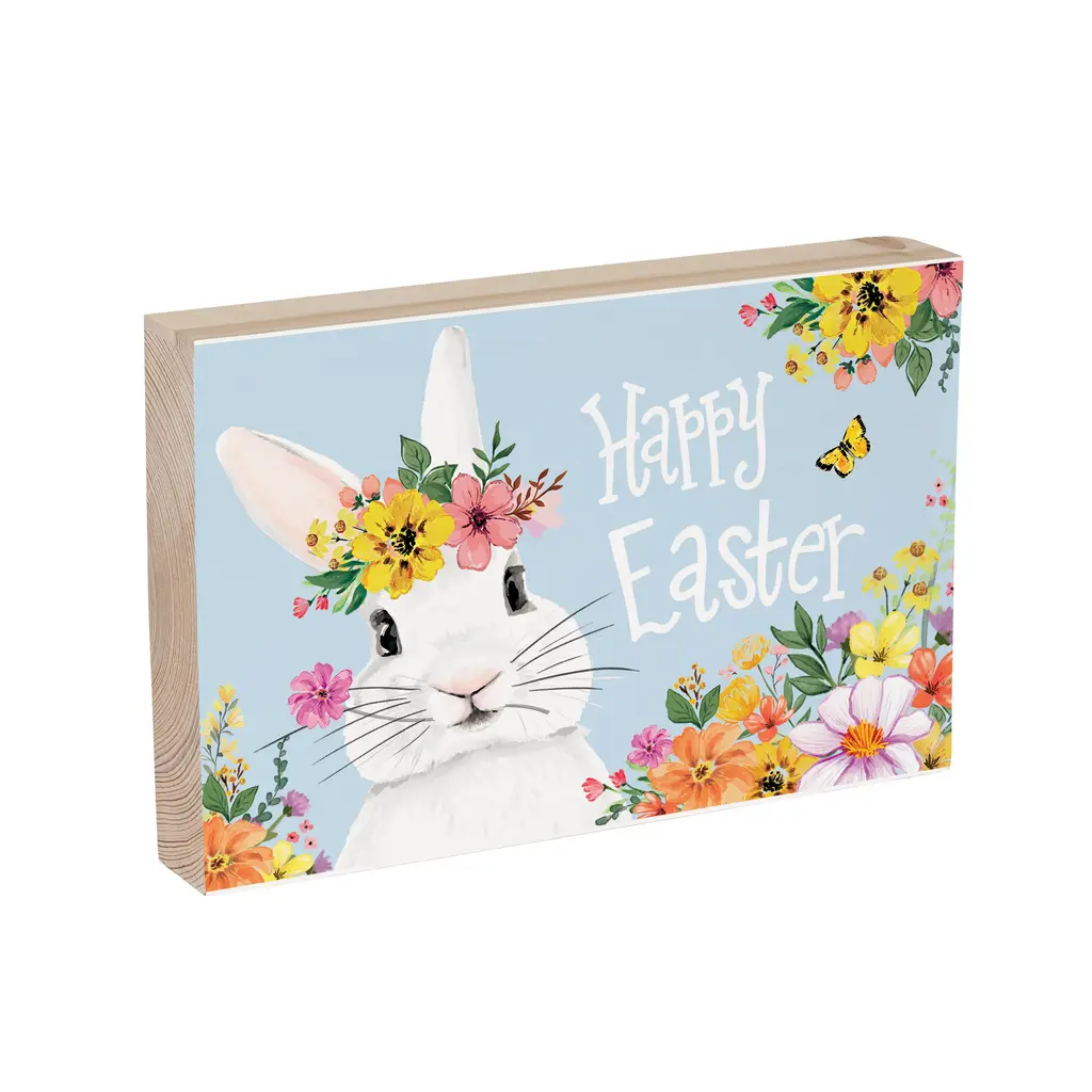 Bunny Blooms Sign Wood Block "Happy Easter", 12"l X 8"h