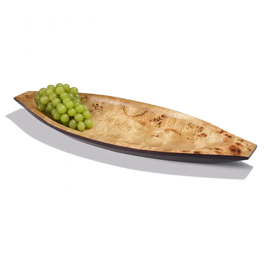 - Handcrafted oblong centerpiece made of wood and burl veneer from Colombia. - The understated warmth of burl veneer is accentuated by a high-gloss lacquer finish.