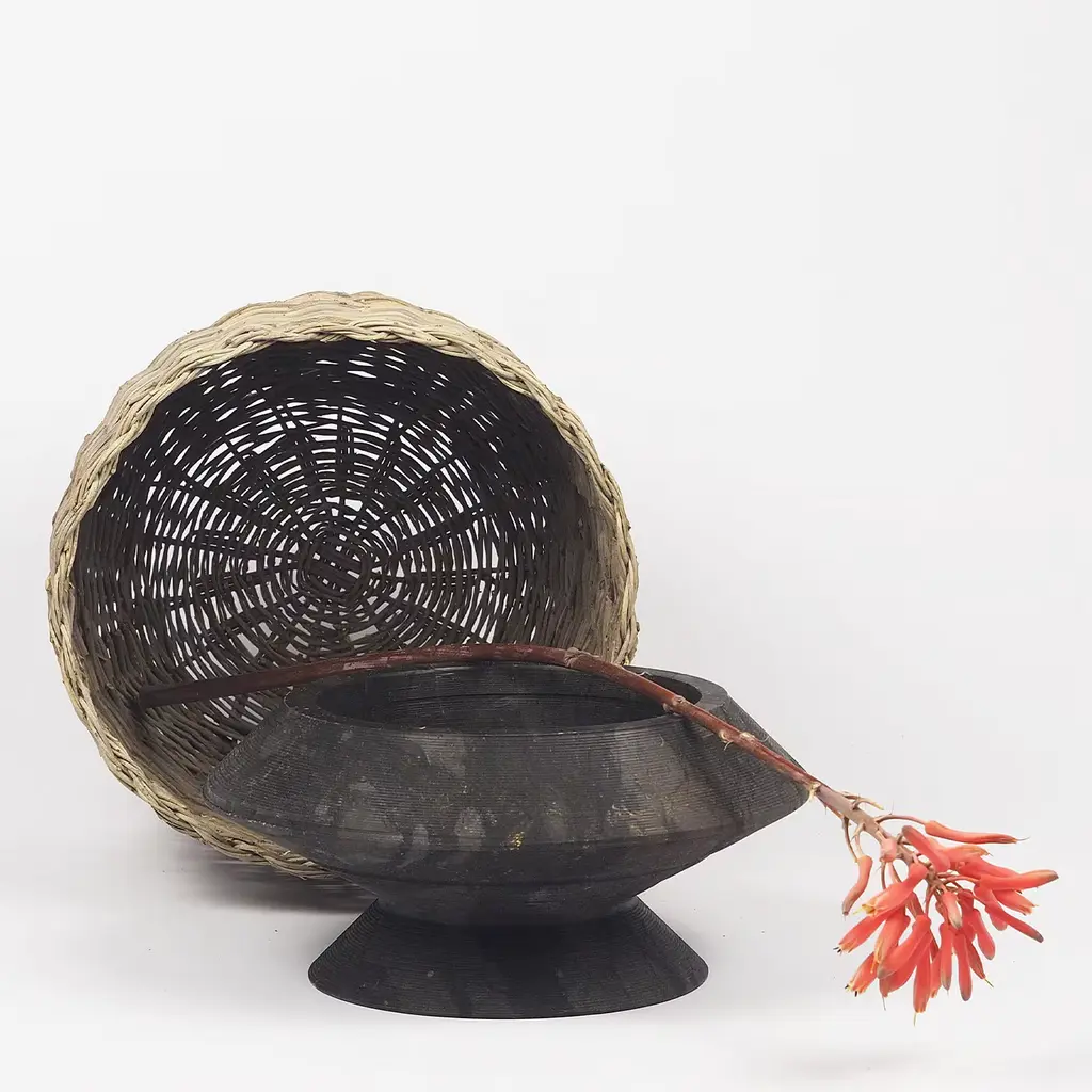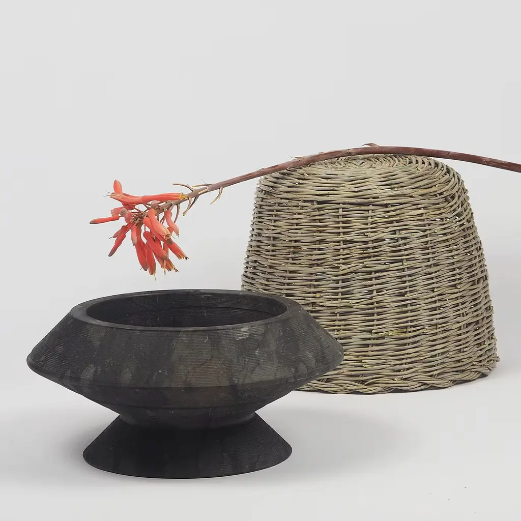 A collection of centerpieces and containers in Jerissa stone and intertwined olive branches that reflect the theme of the traditional basket, reinterpreted; recovered from a distant past, they are reviewed in a contemporary key. The stone bases are machined with numerical control, leaving the processing in an intermediate phase, the braided component is, on the contrary, worked by hand with great patience and attention.