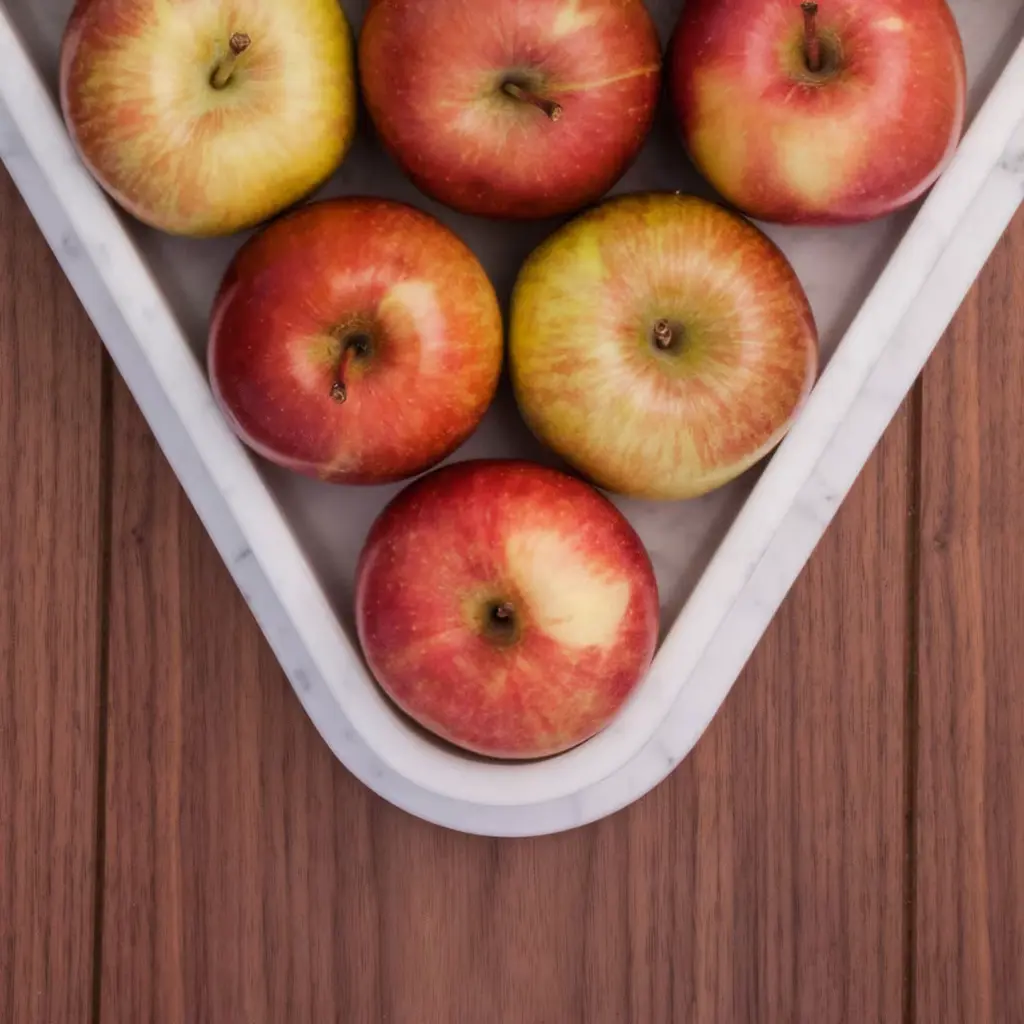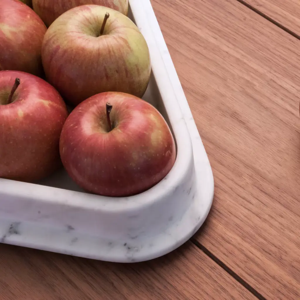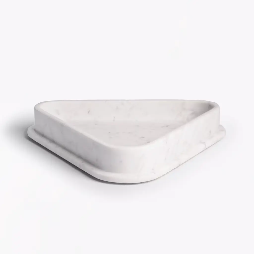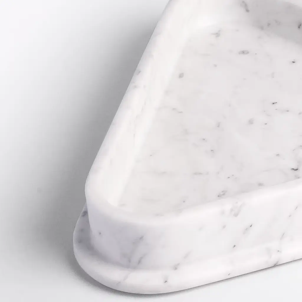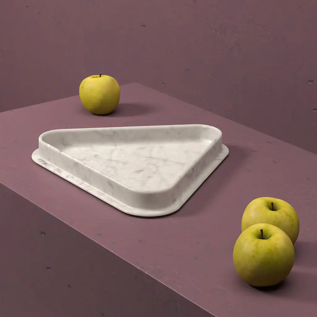 Minimalist and sophisticated, this centerpiece will complement any decor with its geometric silhouette fashioned of white Carrara marble. The name of the piece is a reference to the red object ball of the billiard games, and in fact this centerpiece is shaped like a rack (or triangle) used to place billiard balls in their starting positions at the beginning of a pocket billiards game. A playful and refined accent in any interior, this centerpiece can be used to display fruit arrangements on a kitchen counter or dining table and will be a perfect housewarming gift for billiard lovers.