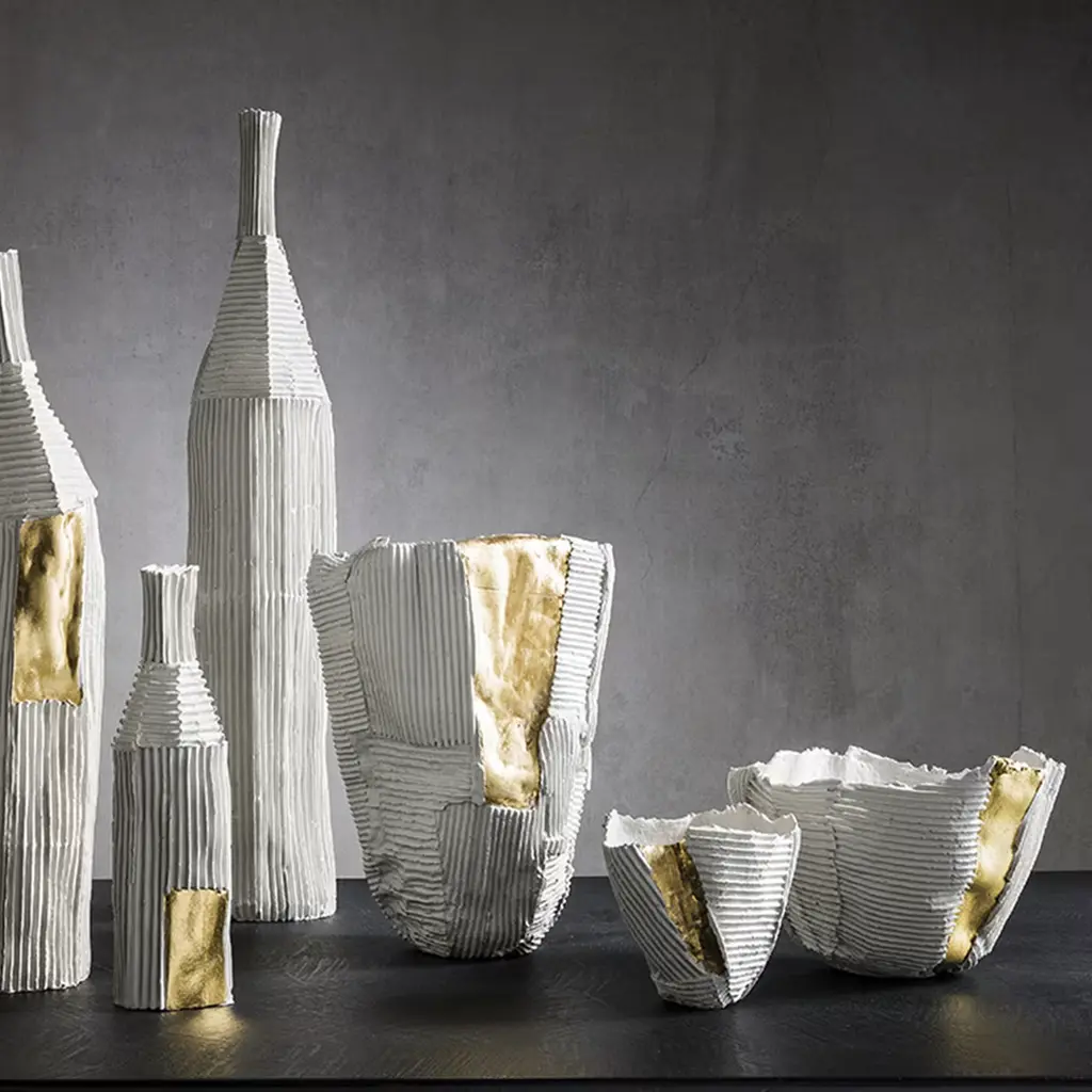 Striking and stately, this bowl features dynamic horizontal and vertical ridges and a distinctive panel insert in gold, whose vibrant color and smooth surface elegantly contrast with the expressive white for a striking visual impact. Taking on an irregular shape, this bowl is handmade of paper clay, an innovative material in which paper pulp and natural fibers are mixed into the clay to achieve a distinctive textural and aesthetic quality. Placed as a centerpiece on a table or console, this bowl will enliven any decor. Every one of Paola Paronetto’s creations is unique. Slight variations in shape, colour and size are to be considered a guarantee of authenticity and value. They are finished with non-toxic satin-finish enamels. Although very rarely, it is possible for them to leak after long periods of exposure to water. It is therefore advisable to test their water resistance before using them on delicate surfaces. They should not be used as dining utensils. The white pieces can be washed with water or sanitizing products, whereas the coloured pieces must be treated more gently and cleaned with a feather duster or a soft cloth, dry or moistened very slightly with water.