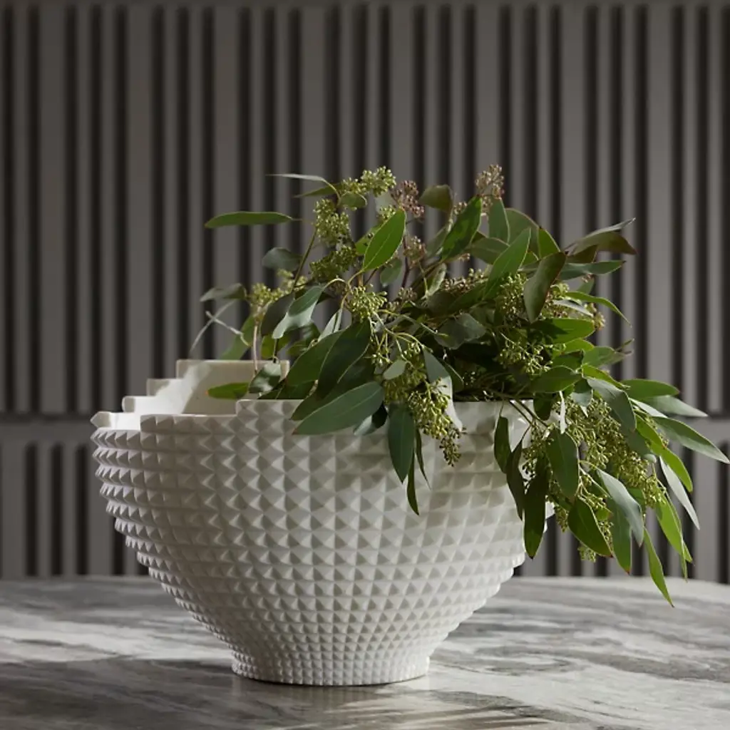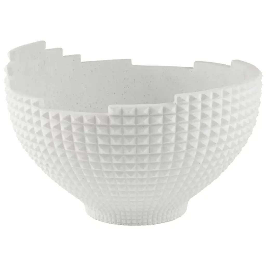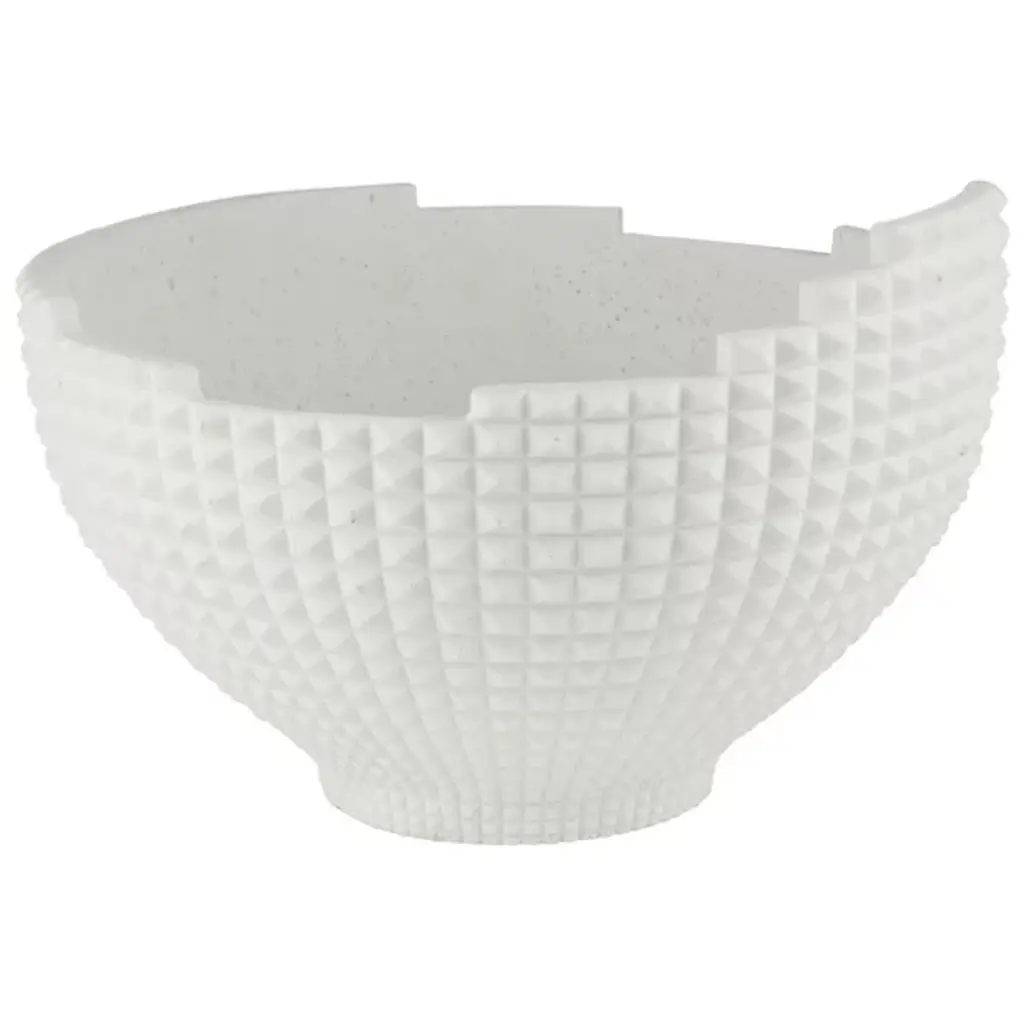 Inspired by the iconic Roman Coliseum, the Caruso Centerpiece from Arteriors echoes the allure of ancient ruins with a museum-worthy presence. Crafted from ivory ricestone composite, its outer surface features a textured stairstep effect adorned with studs, adding depth and tactile appeal. Each piece boasts a unique finish, ensuring a distinctive addition to your decor that captures timeless architectural charm.