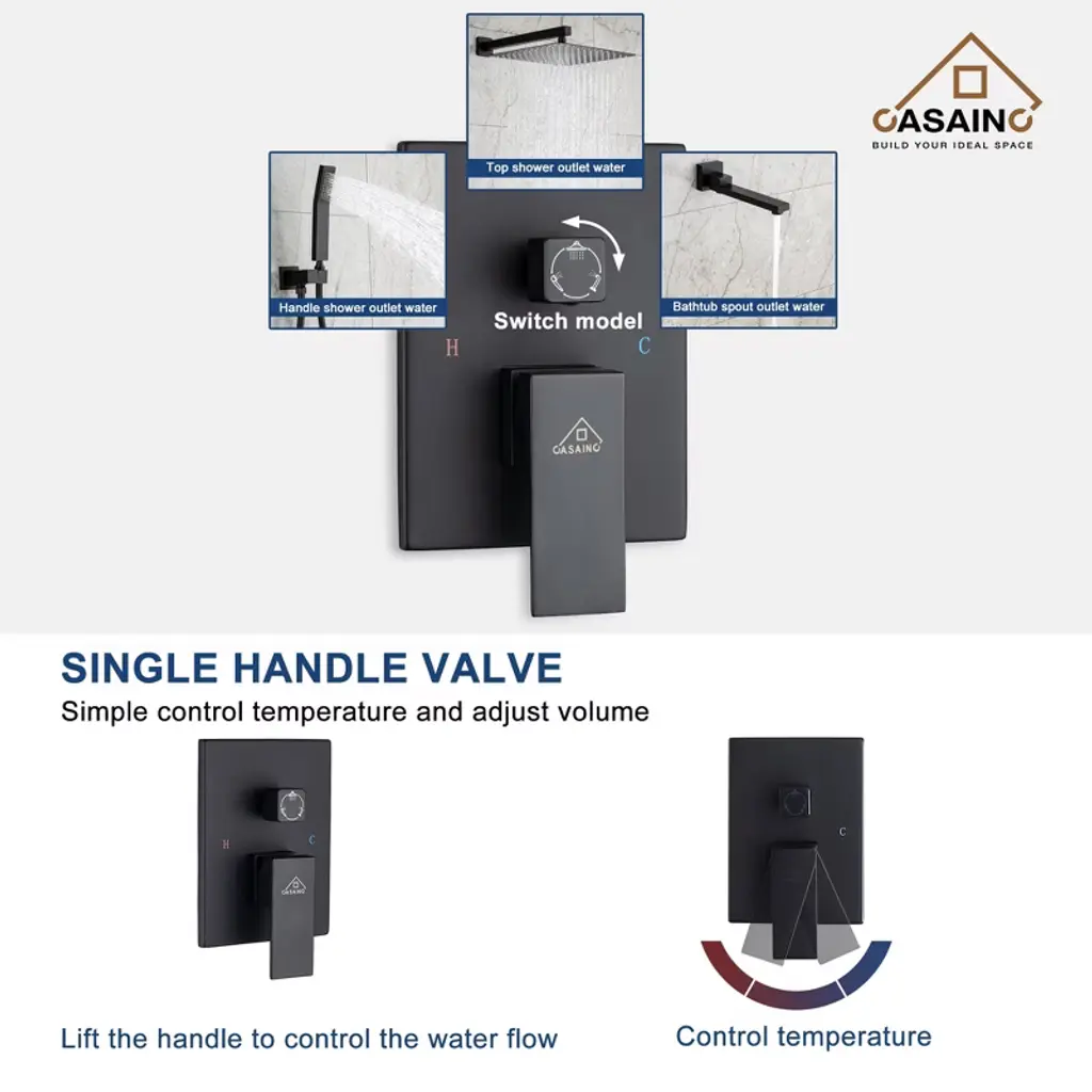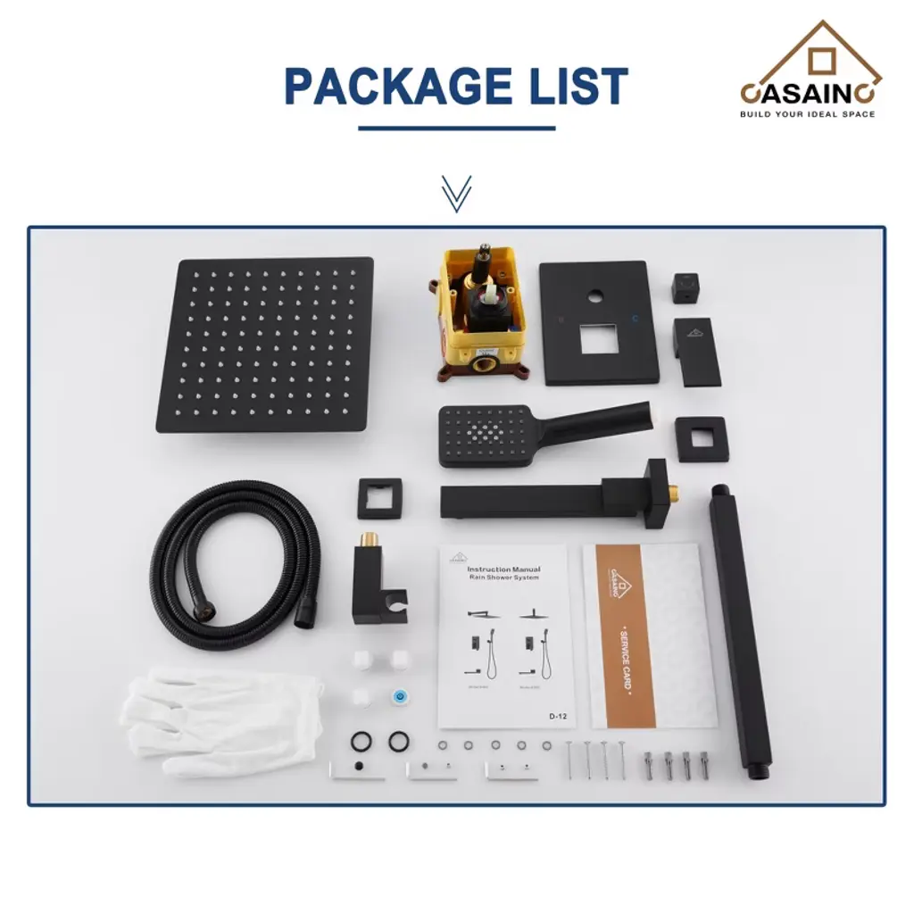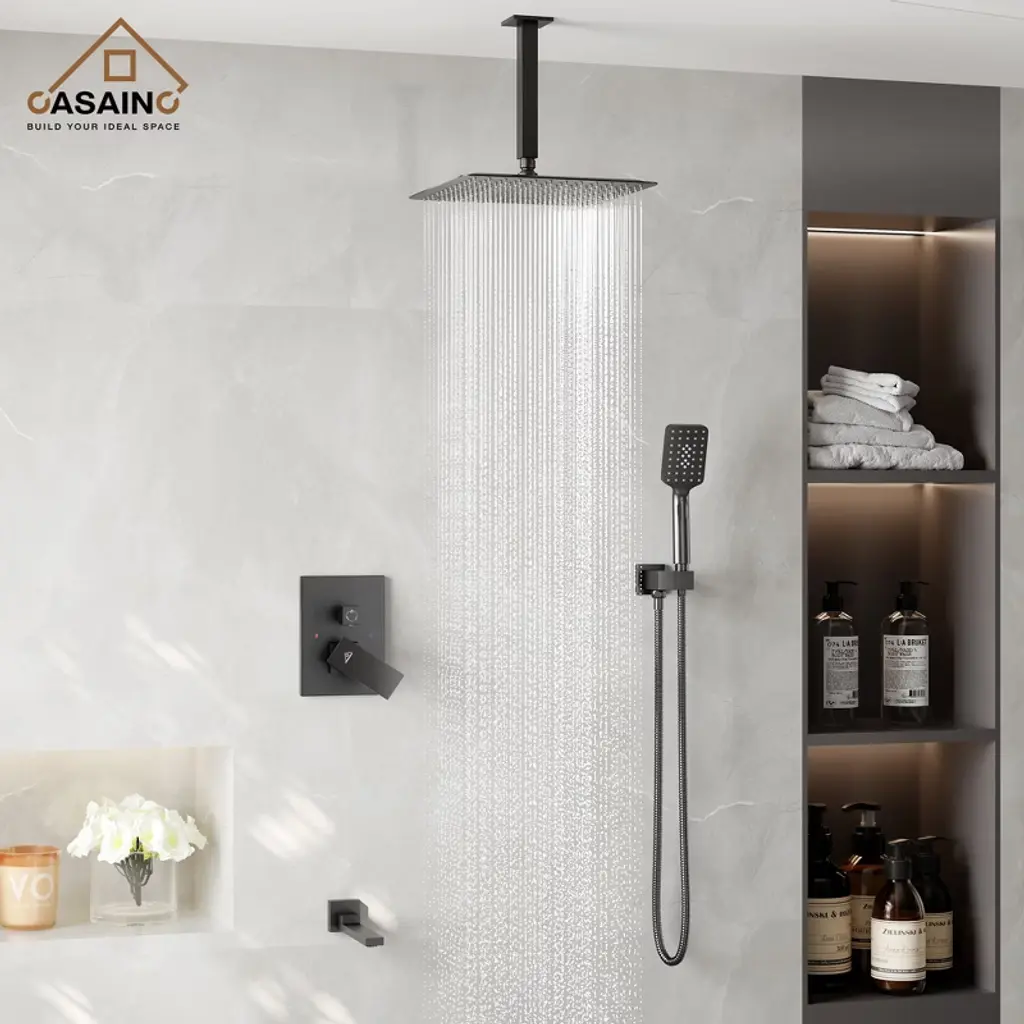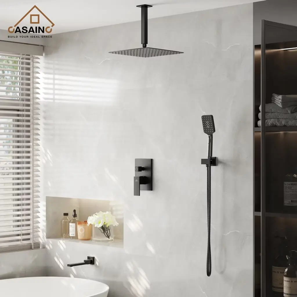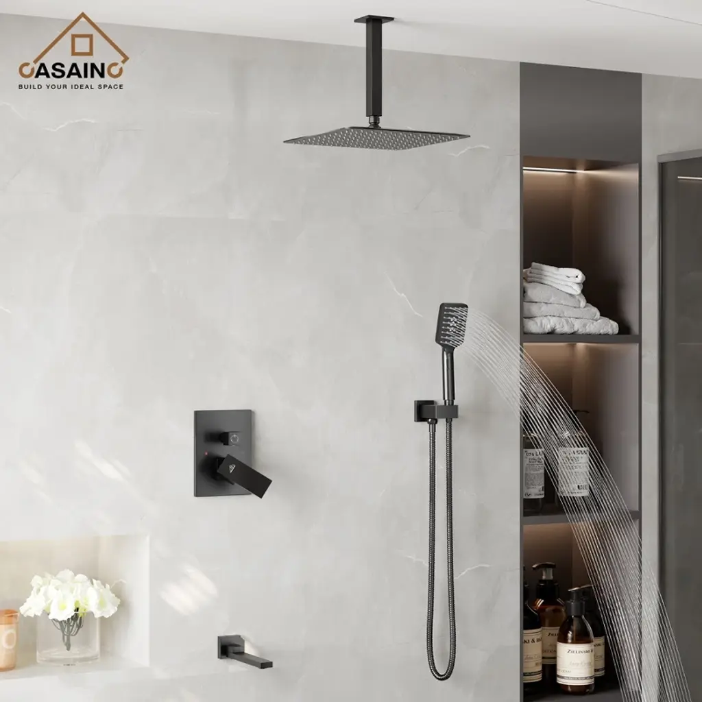 Casainc 12" Ceiling Mounted Square Shower System With Handheld Spray And Tub Spout, Black