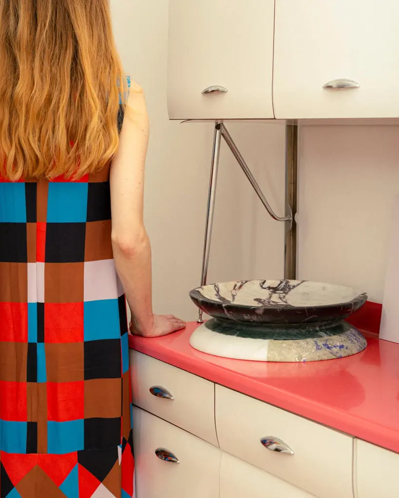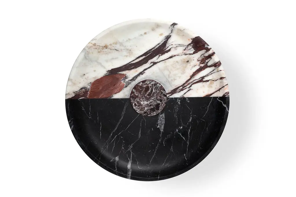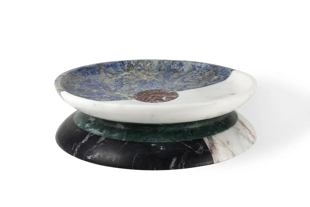 Centerpiece in Nero Marquinia, Rosso Levanto, Bianco Michelangelo, Arabescato Vagli Filo Rosso, Verde Guatemala and Blu Sodalite marbles.Size: 36 x 12 cm 14.2 x 4.7 in, smooth finishing. Commercial name: Aldo, Masters Collection by the Austrian designer Arthur Arbesser. Made in Italy, hand finished.Color is the fashionArbesser, a designer in the worlds of art, architecture and fashion alike – understands marble, breaking it up and reassembling it, glimpsing its strength and brilliant color. He is also familiar with its complexity, which led to the creation of Aldo, a fruit basket that’s solid yet light, polychrome yet exquisitely balanced. The perfect centrepiece, the ideal companion for places that don’t fear color.