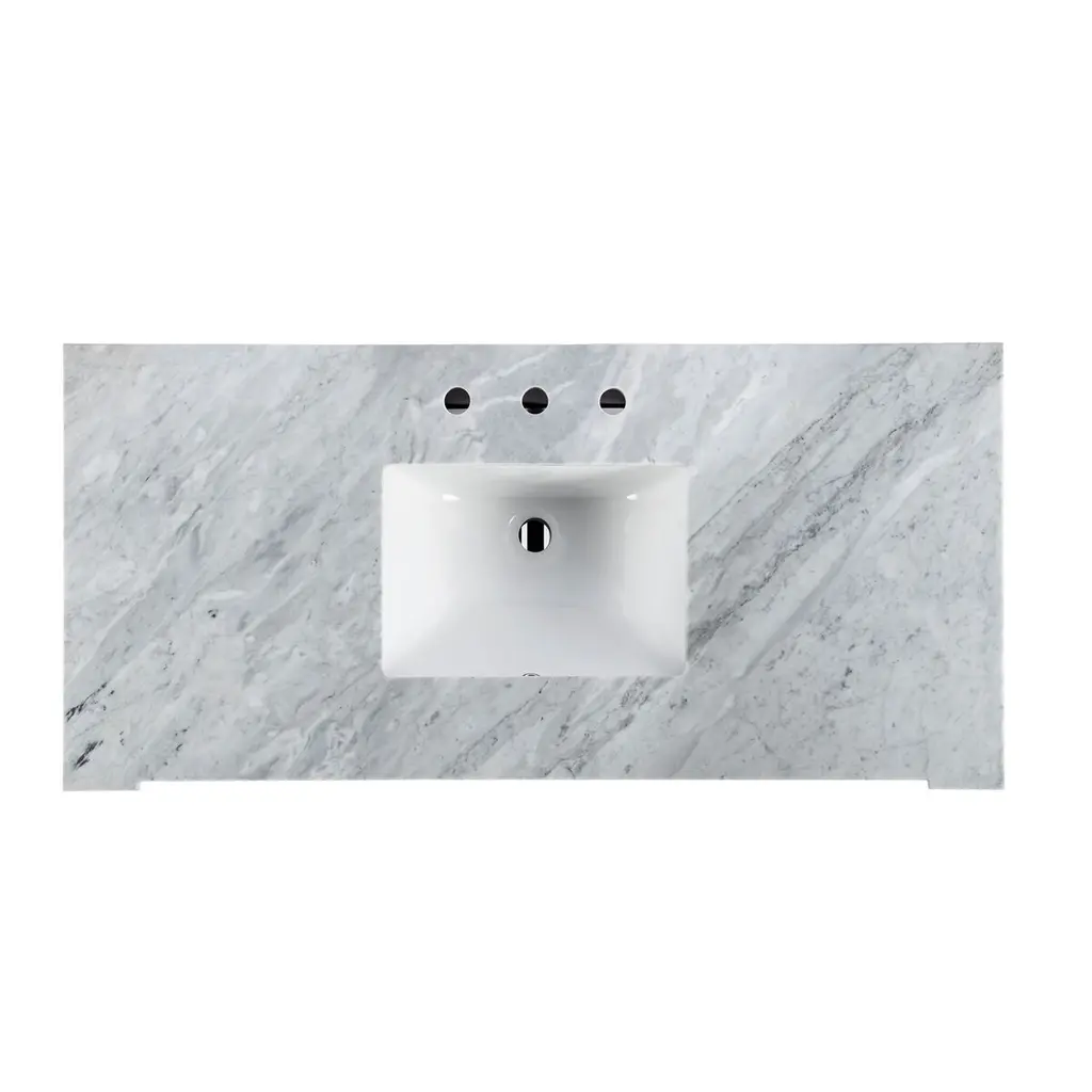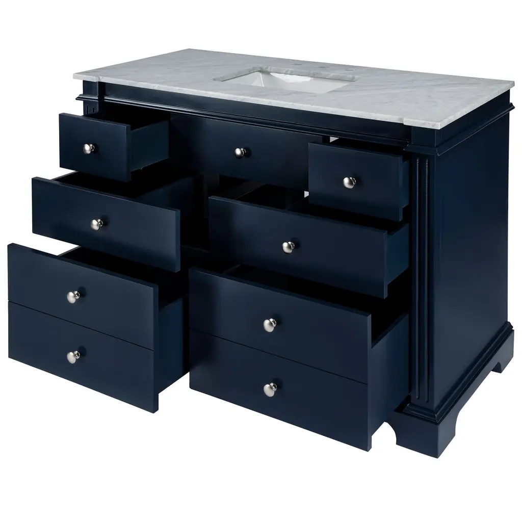 Transform your bathroom into a sanctuary of elegance with this exquisite 48" Single Vanity set. A masterpiece of craftsmanship, it is meticulously constructed from solid acacia and manufactured wood, showcasing intricate crown molding and a charming fluted leg design. These classic details effortlessly blend with any decor style, from traditional to coastal or modern farmhouse. The centerpiece is a pristine white rectangular ceramic under-mount sink, gracefully nestled within a stunning carrera marble top, ready to accommodate your choice of faucet with its three pre-drilled holes. Beyond its beauty, this vanity offers ample storage with six functional drawers, ensuring your space remains as organized as it is beautiful. Let this vanity be the heart of your bathroom, where style meets functionality in perfect harmony.