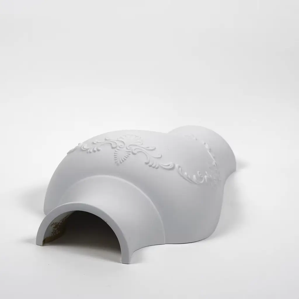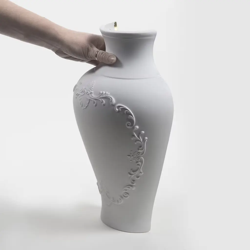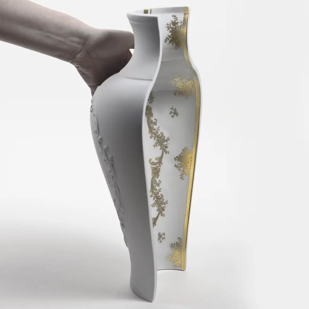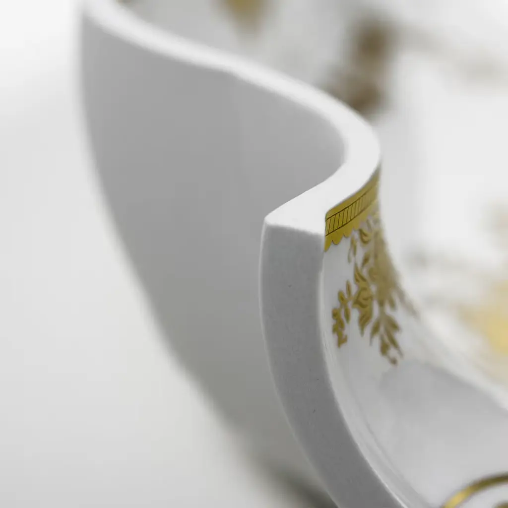 Part of the Cocci Cantori series, this exquisite centerpiece in porcelain was created by a legendary company in Tuscany, Mangani Porcellane, which carries its knowledge and tradition through to each of its pieces. The classic shape and elegant decoration of this elongated bowl are the product of turning inside-out and reinterpreting in a contemporary way a vase that was cut in half and placed on one side, wearing its decorations on the inside. Modern and classic allure mix in this timeless piece that will enrich any decor.