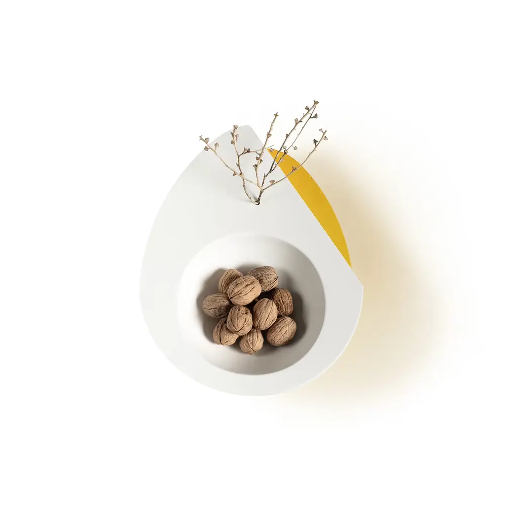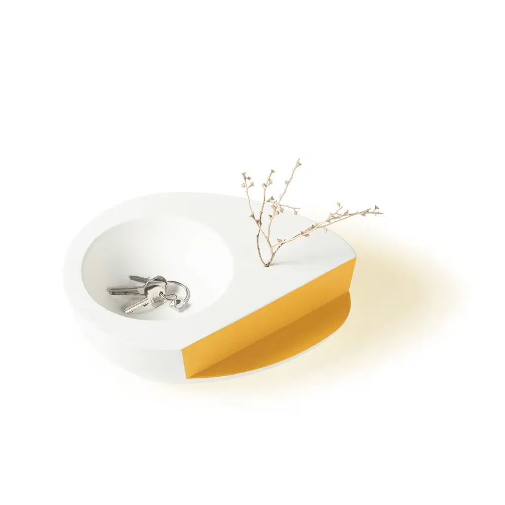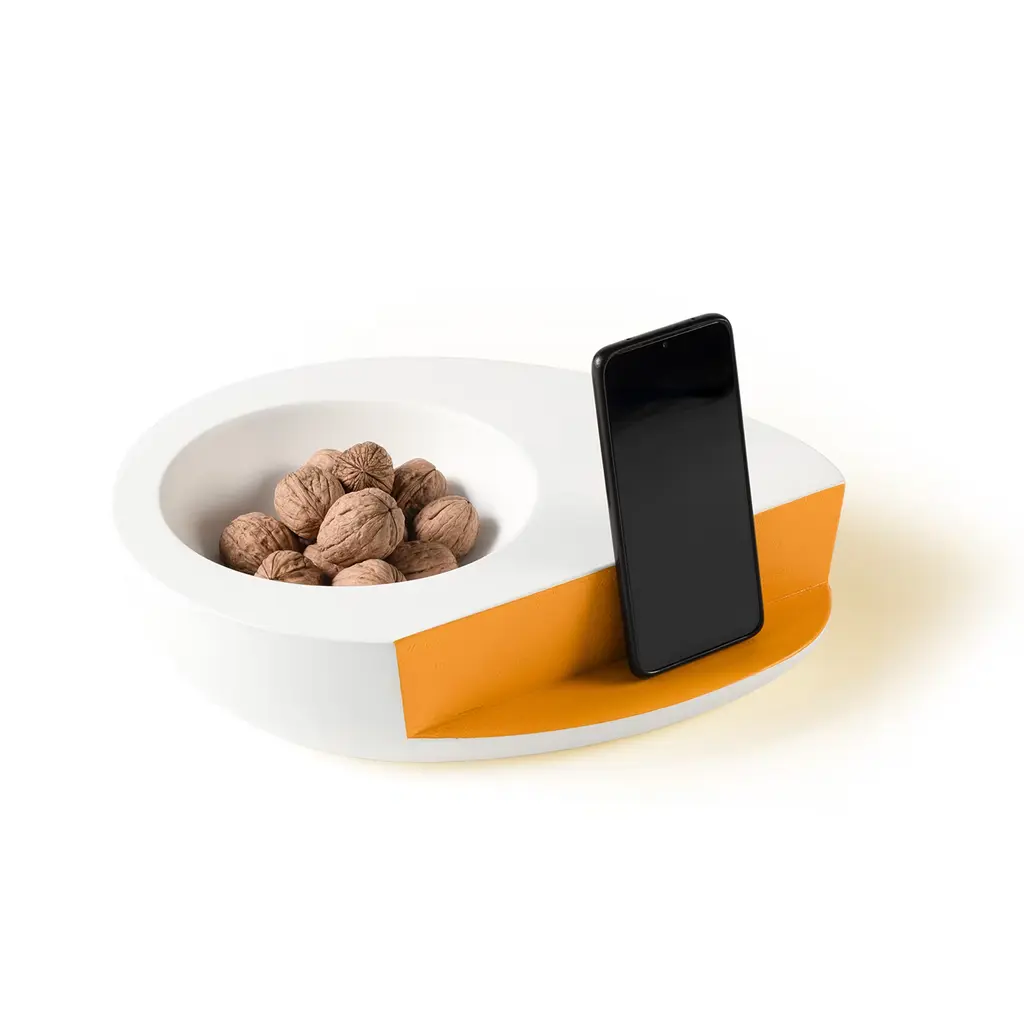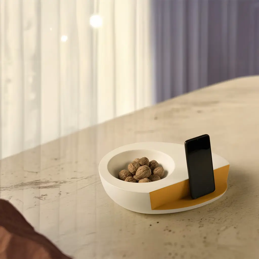 An "egg of Columbus" is an intuitive solution, an immediate answer to a question found by taking an alternative path that has always been in plain sight yet never considered. The egg, a cosmogonic shape, acts as a natural nesting doll. Made of solid wood, the ovoid features an 18° cut cavity, smooth edge, and small hole. These elements make it adaptable for multiple uses: an unconventional dish, a catch-all tray, a desk container with a cellphone holder, or a kitchen and bathroom organizer.