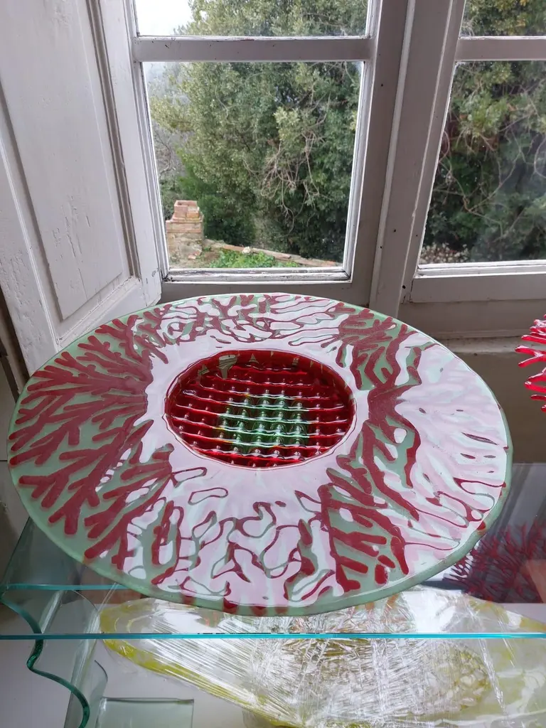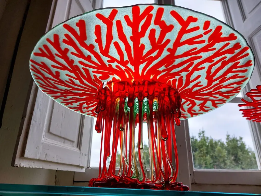 The jellyfish is the main element of the Mosche Bianche's "Medusa" Collection: fluid, delicate but also dangerous and deadly. It represents the water, the circle of life. Glass fusing basically means building a new solid-state glass, assembling different pieces that, in contact with heat, varying from 800 ° C to 850 ° C, become so fluid that they join together deeply and irreversibly.The cooling is very slow in order to allow the total reorganization and recovery of the molecular stability that the material possessedbefore being heated. Glass fusing allows, using colored compounds (enamels, oxides) to produce polychromeobjects.The work of the artist uses two main tools: heat and the force of gravity. The result depends on the degree of communication between the artist, the glass and the oven he uses.This handmade masterpiece is a unique piece, made in Italy.
