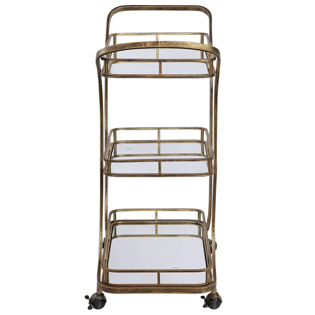 Indulge in the timeless elegance of the Cosima Serving Cart, a masterpiece of craftsmanship and design. Hand forged in solid iron, this exquisite bar cart is a testament to the art of transitional style. Its three tray-style mirrored shelves, finished in a luxurious antiqued gold, offer a perfect blend of functionality and sophistication. The rolling casters ensure effortless mobility, allowing you to serve your guests with grace and ease. Let the Cosima Serving Cart be the centerpiece of your gatherings, a symbol of refined taste and enduring beauty.