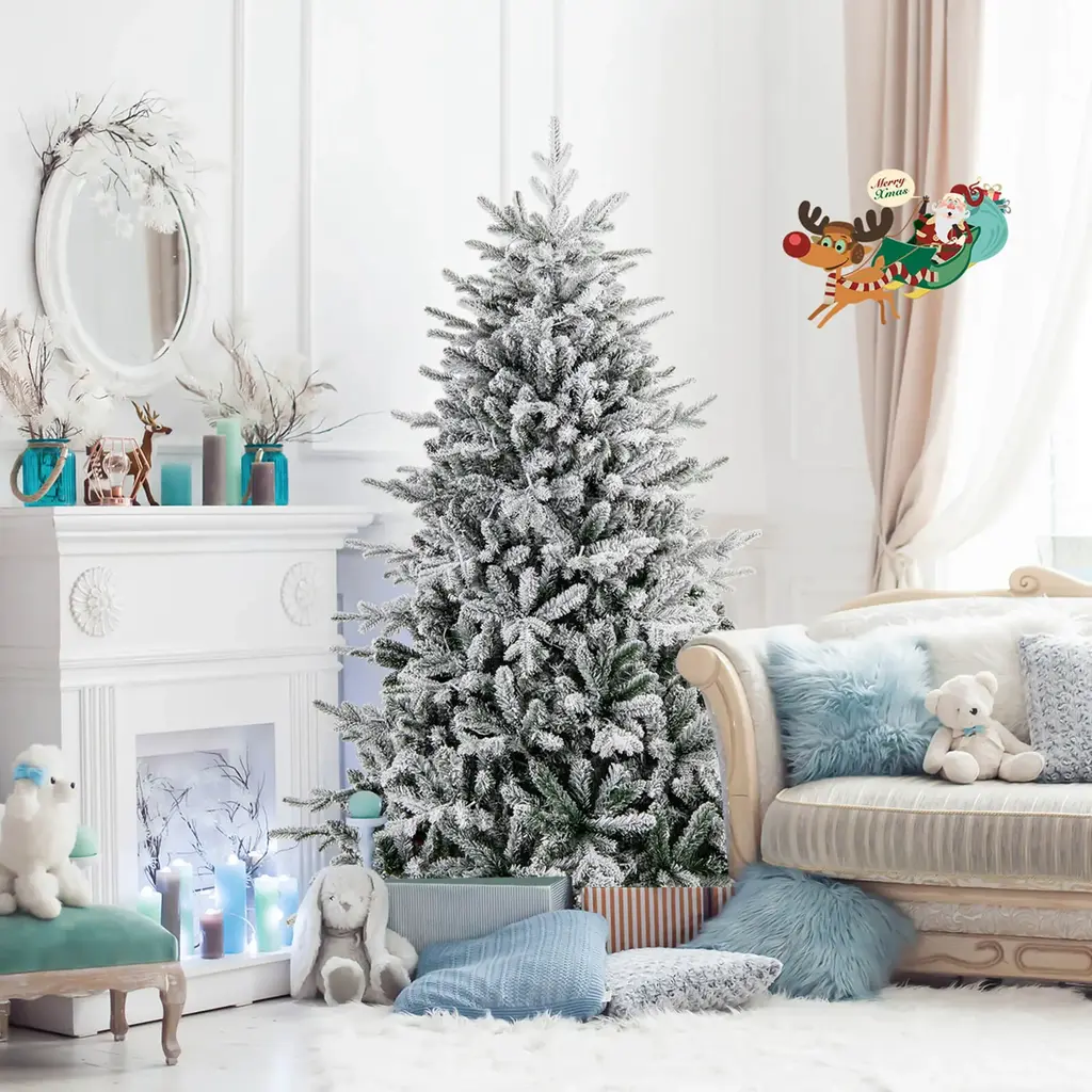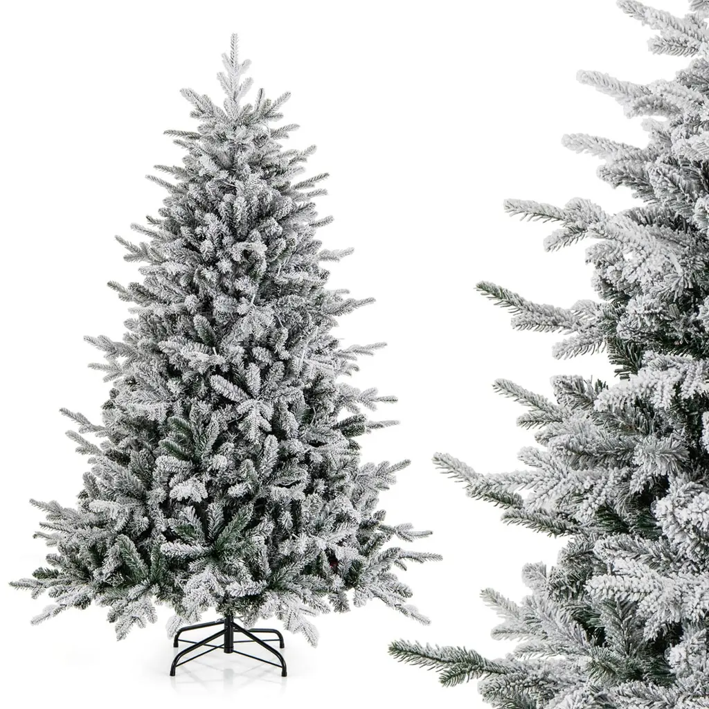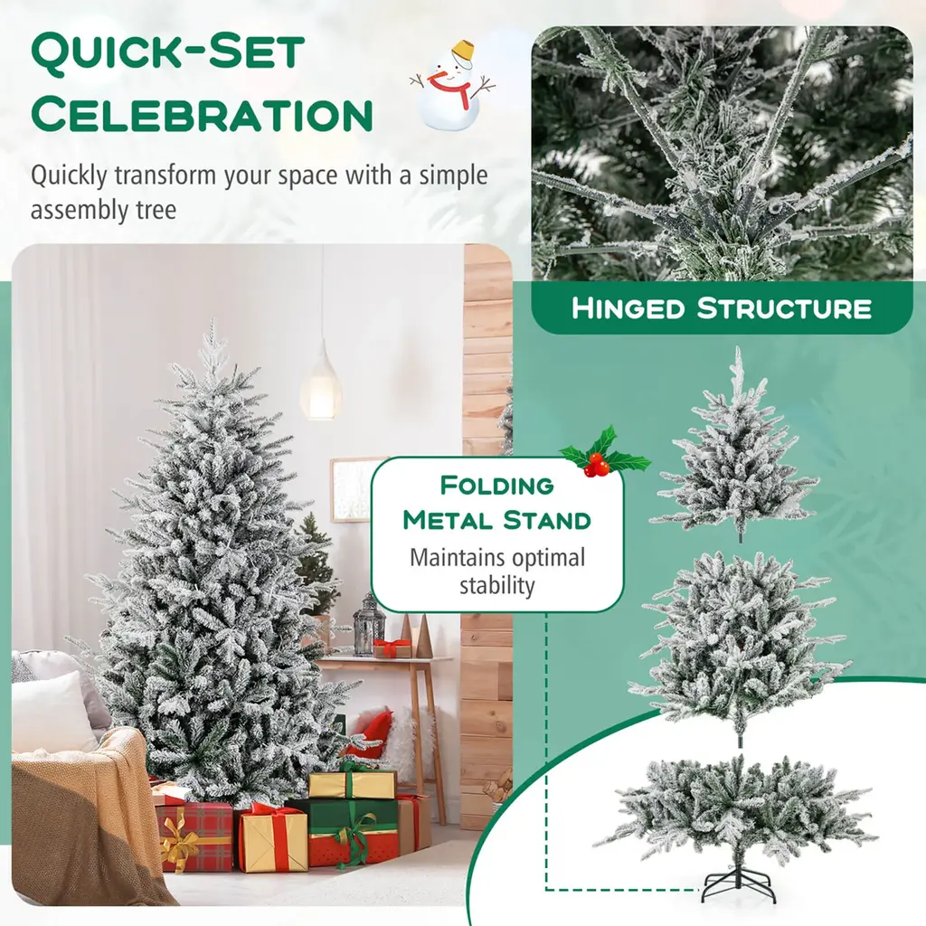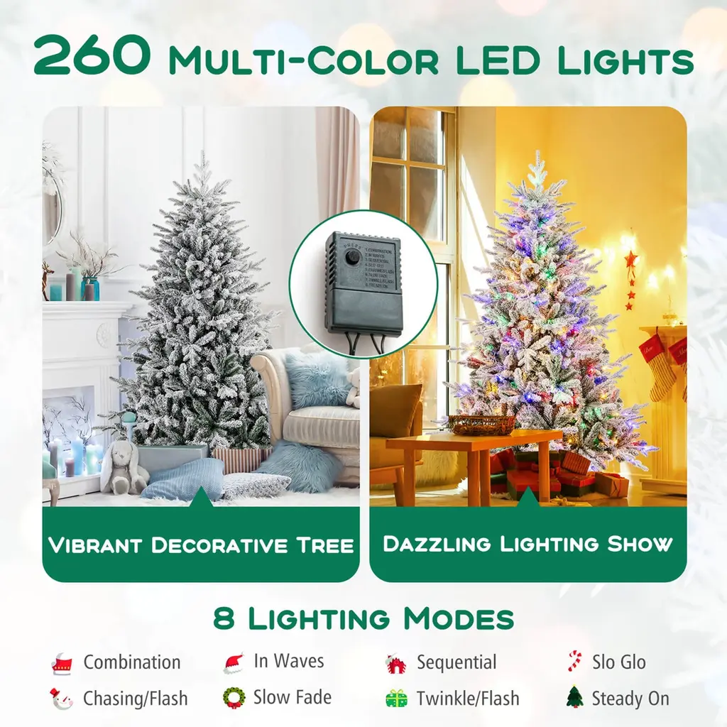 Create a festive atmosphere with the 4.5 ft Xmas tree, featuring 160 LED lights and a flocked design. Enjoy 8 lighting modes to match any occasion, including chasing/flash, slow fade, twinkle/flash, steady on, and more. Crafted from premium PVC and PE materials, this 2-section Christmas tree is fireproof, non-allergic, anti-fading, and smell-free. With 436 branch tips, it exudes a lush and inviting look that suits any setting. Quickly transform your space with a simple assembly tree, thanks to its hinged structure and foldable stand. Trust in its safety with the UL-certified adaptor, making it a worry-free centerpiece for your holiday decoration. A Christmas tree designed for seamless integration and holiday harmony. Merry Christmas!Feature160/260/350 multi-color LED lights provide a dazzling lighting show The vibrant decorative tree features 8 lighting modes 436/820/1164 lush branch tips are made of premium PVC and PE Flocked design is perfect for the snow-kissed season Hinged structure allows for a quick-set celebration Folding metal stand maintains optimal stability Practical choice for home, office, shop, school, and more Safe adaptor with the UL certification for high security Compact storage thanks to the 2-section structureSpecificationColor: Green & White Material: PE, PVC, Metal Tree Height:4.5/6/7 ft Tree Width: 3.1/3.9/4.4 ft Diameter of Stand:16"/18"/20" Number of Branch Tips: 436/820/1164 Number of LED Lights: 160/260/350 Number of Sections: 2 Net Weight: 10/19/28 lbs Package Includes: 1 x Christmas Tree 1 x User Guide