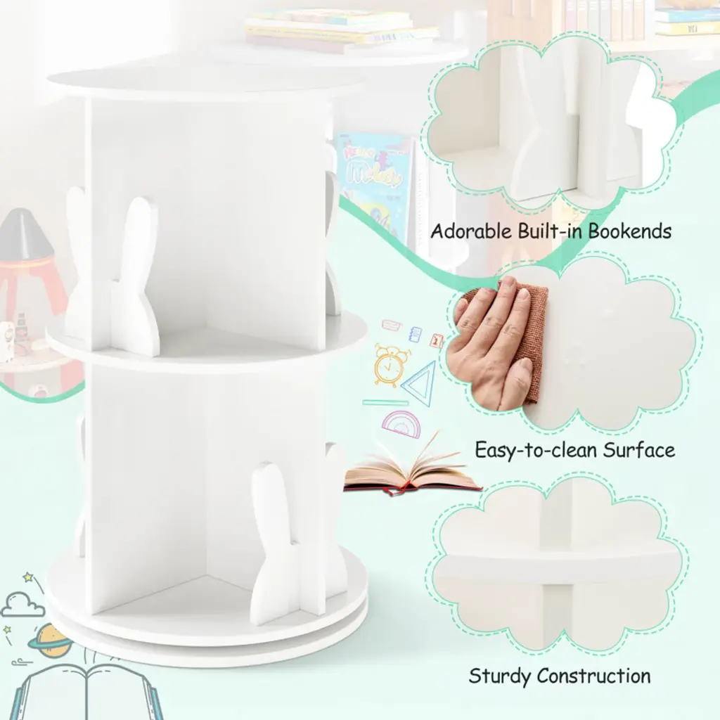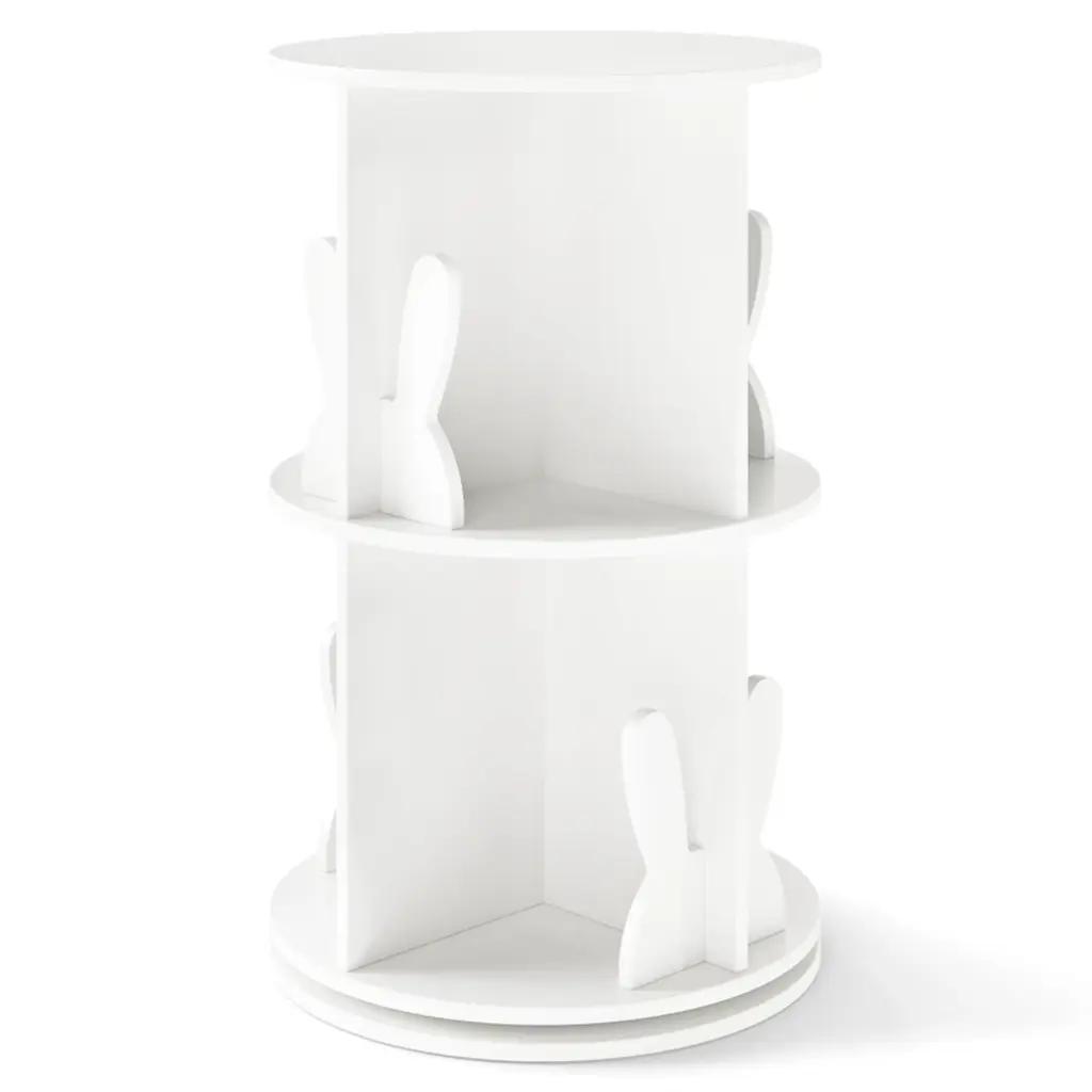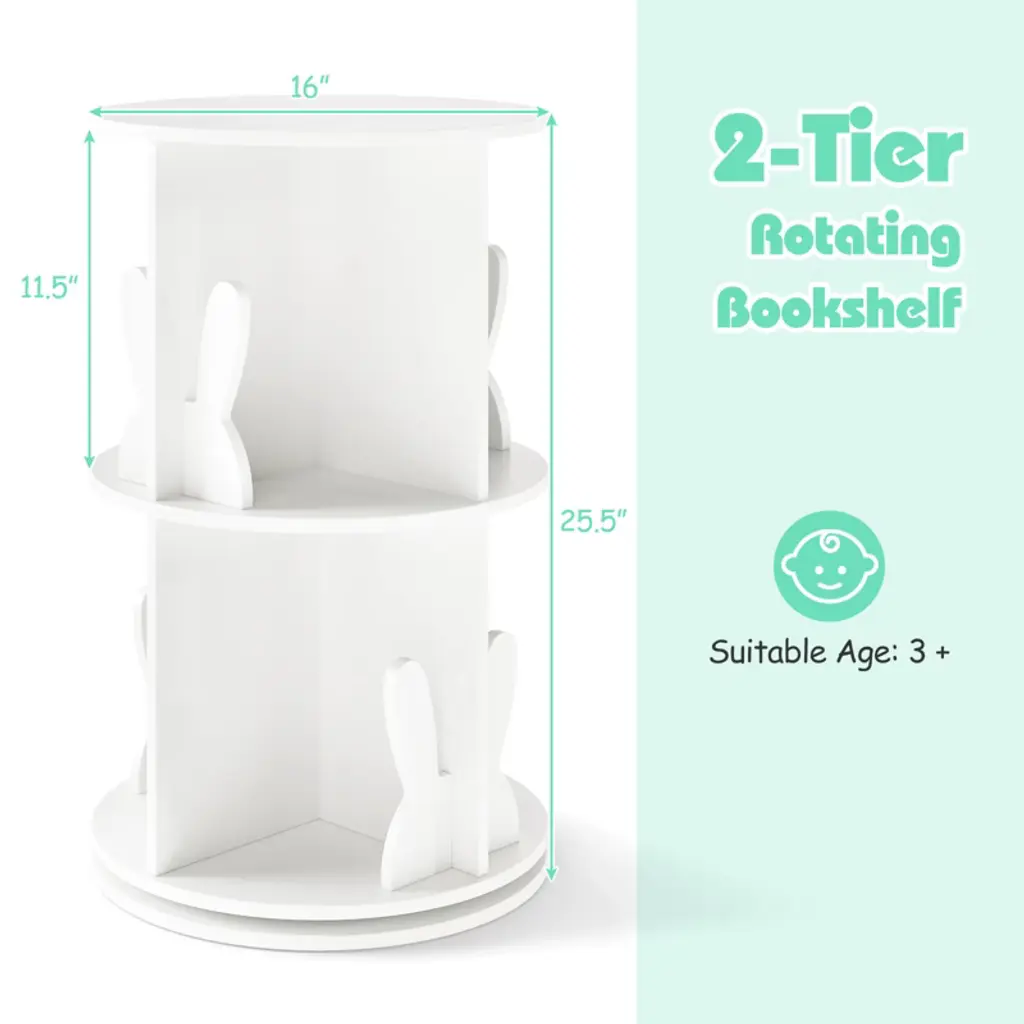 Delight your child with a gift that keeps their space organized and their cherished stories within easy reach! Engineered to optimize space and enhance convenience, this 2-tier freestanding bookshelf boasts a 360° revolving design for easy access from any angle. Each compartment features a delightful bunny baffle that adds a playful touch while helping keep books and toys orderly. Designed to fit seamlessly into small or awkward spaces, this round spinning bookshelf becomes an instant centerpiece in any child’s bedroom, playroom, or family living area. Additionally, the inclusion of anti-slip foot pads provides added stability and floor protection. FeaturesShowcase and retrieve books easily with the 360° rotating design Round top for placing decorations or often-used items 8 compartments with baffles for storing various items Non-slip foot pads protect floors from scratching Ideal for the playroom, living room, bedroom, etc Premium turntable for smooth swivel Easy-to-clean surface saves time and effort Assembly neededColor: White/Pink Material: MDF Overall Dimensions: 16" x 25.5" (Dia. x H) Dimensions of Each Compartment: 7.5" x 5.5" x 11.5" (L x W x H) Net Weight: 22 lbs Weight Capacity: 33 lbs Package Includes: 1 x Kids Rotating Bookshelf 1 x Instruction