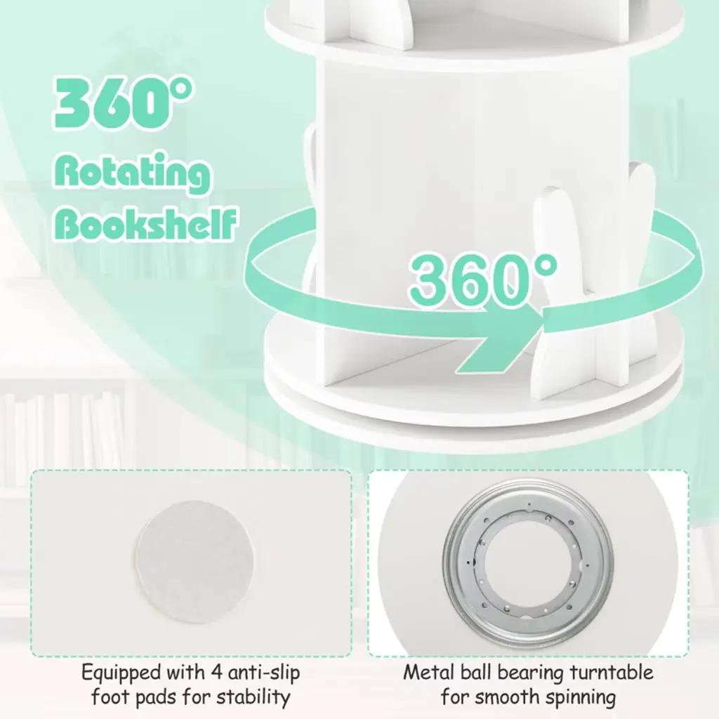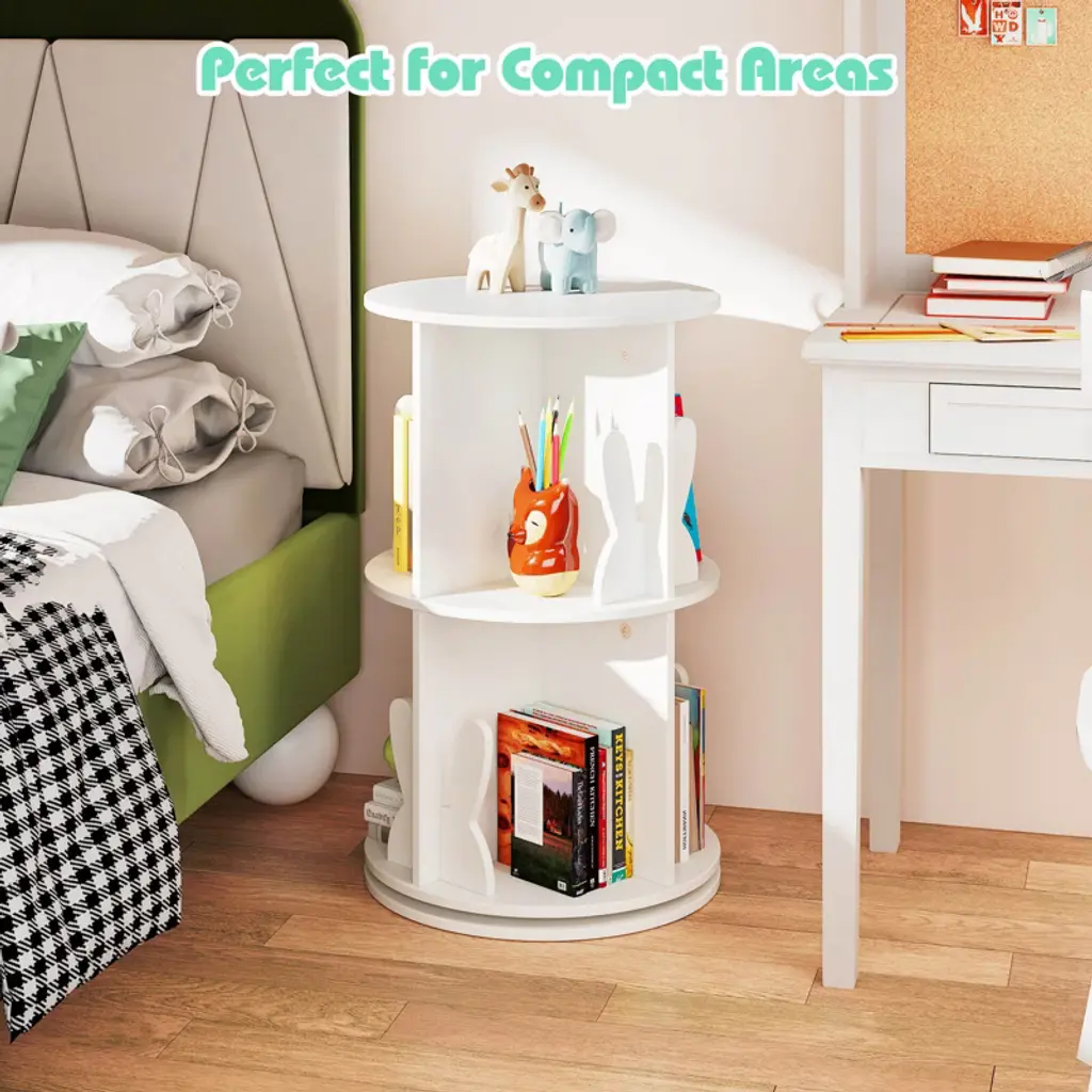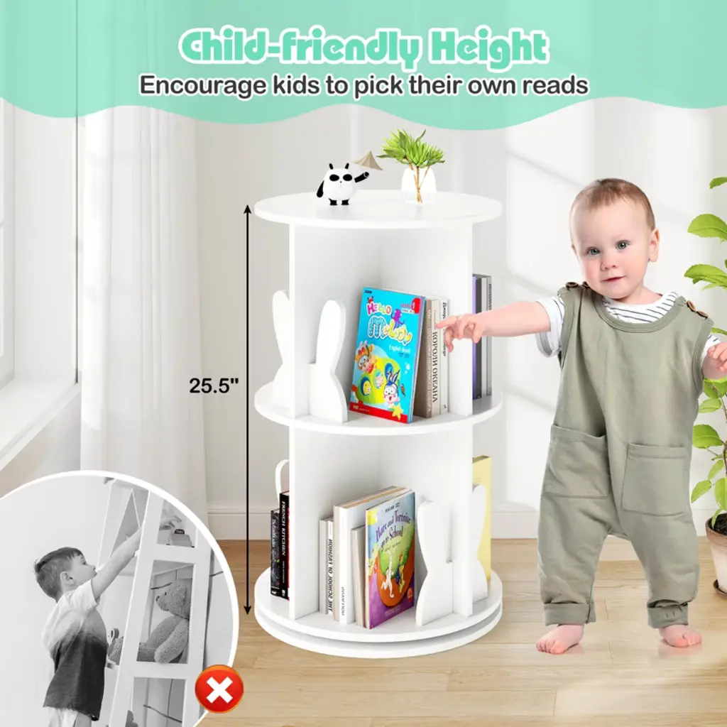 Delight your child with a gift that keeps their space organized and their cherished stories within easy reach! Engineered to optimize space and enhance convenience, this 2-tier freestanding bookshelf boasts a 360° revolving design for easy access from any angle. Each compartment features a delightful bunny baffle that adds a playful touch while helping keep books and toys orderly. Designed to fit seamlessly into small or awkward spaces, this round spinning bookshelf becomes an instant centerpiece in any child’s bedroom, playroom, or family living area. Additionally, the inclusion of anti-slip foot pads provides added stability and floor protection. FeaturesShowcase and retrieve books easily with the 360° rotating design Round top for placing decorations or often-used items 8 compartments with baffles for storing various items Non-slip foot pads protect floors from scratching Ideal for the playroom, living room, bedroom, etc Premium turntable for smooth swivel Easy-to-clean surface saves time and effort Assembly neededColor: White/Pink Material: MDF Overall Dimensions: 16" x 25.5" (Dia. x H) Dimensions of Each Compartment: 7.5" x 5.5" x 11.5" (L x W x H) Net Weight: 22 lbs Weight Capacity: 33 lbs Package Includes: 1 x Kids Rotating Bookshelf 1 x Instruction