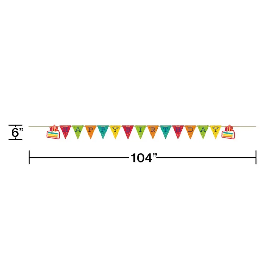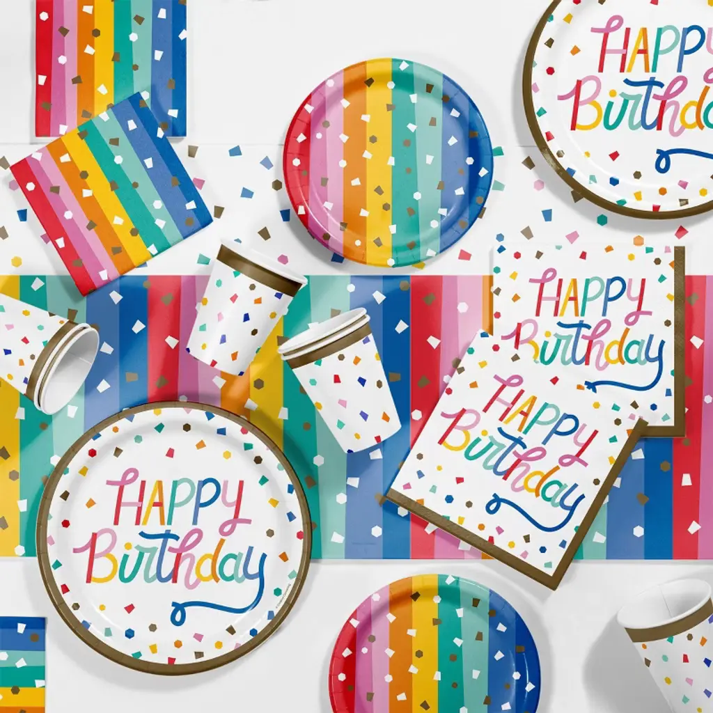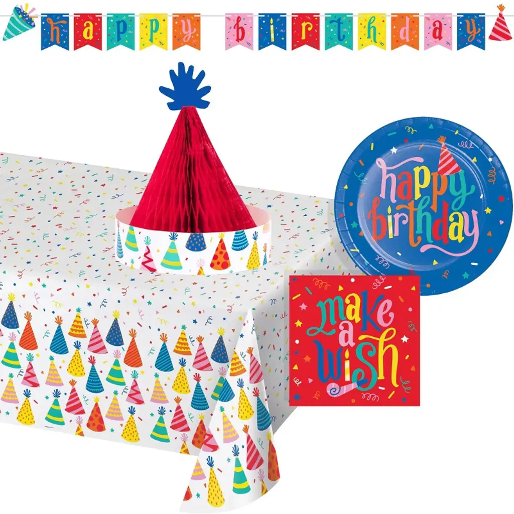 Each Festive Cake Party Kit contains: 8 Festive Cake Happy Birthday Paper Plates (9"), 16 Festive Cake Make a Wish Napkins (6.5"), 1 Festive Cake Happy Birthday Paper Tablecloth (54" x 102"), 1 Festive Cake Happy Birthday Centerpiece (9" x 12"), and 1 Festive Cake Happy Birthday Banner (6" x 104"). Hear the cheers from your guests as they gleefully toast to a spectacular birthday party when you use the Festive Cake Party Kit. The kit has all the paper plates and napkins you need to serve a meal to a gathering of 8 people. The party supplies feature birthday cakes, candles, and the words "Happy Birthday" with a green, blue, red, and yellow theme. Throw a fantastic birthday party with this kit!