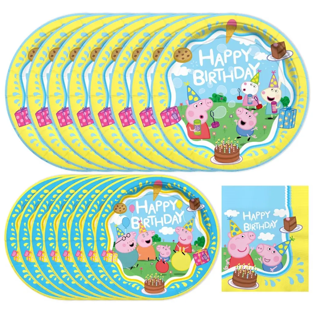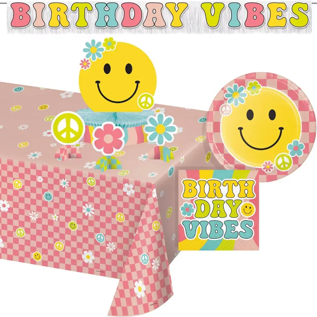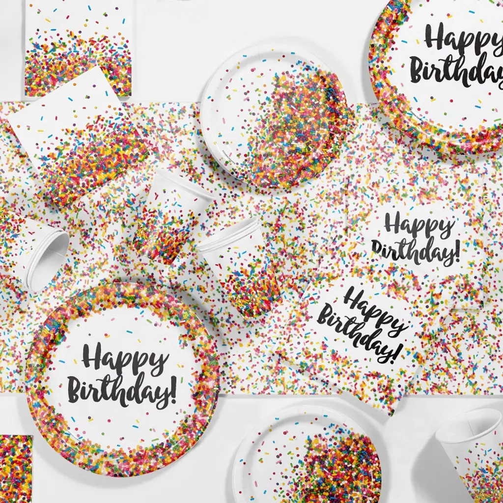 Each Festive Cake Party Kit contains: 8 Festive Cake Happy Birthday Paper Plates (9"), 16 Festive Cake Make a Wish Napkins (6.5"), 1 Festive Cake Happy Birthday Paper Tablecloth (54" x 102"), 1 Festive Cake Happy Birthday Centerpiece (9" x 12"), and 1 Festive Cake Happy Birthday Banner (6" x 104"). Hear the cheers from your guests as they gleefully toast to a spectacular birthday party when you use the Festive Cake Party Kit. The kit has all the paper plates and napkins you need to serve a meal to a gathering of 8 people. The party supplies feature birthday cakes, candles, and the words "Happy Birthday" with a green, blue, red, and yellow theme. Throw a fantastic birthday party with this kit!