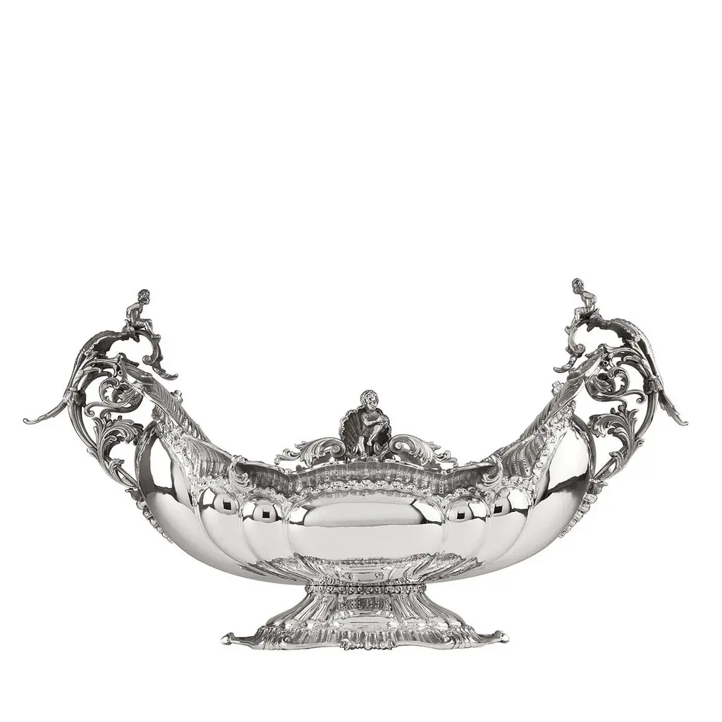 This splendid silver centrepiece has the unique and magnificent shape of a trophy, whose symmetrical shape is sinuous and luxurious. Its surface is smooth and is adorned throughout the base and at the top edge of the cup with an elaborate decoration of leaves and curls. The two handles are topped with two cherubs each riding a tempestuous wave, while the centre repeats the marine theme with a cherub resting in a half shell. This object will produce an arresting effect in any environment.