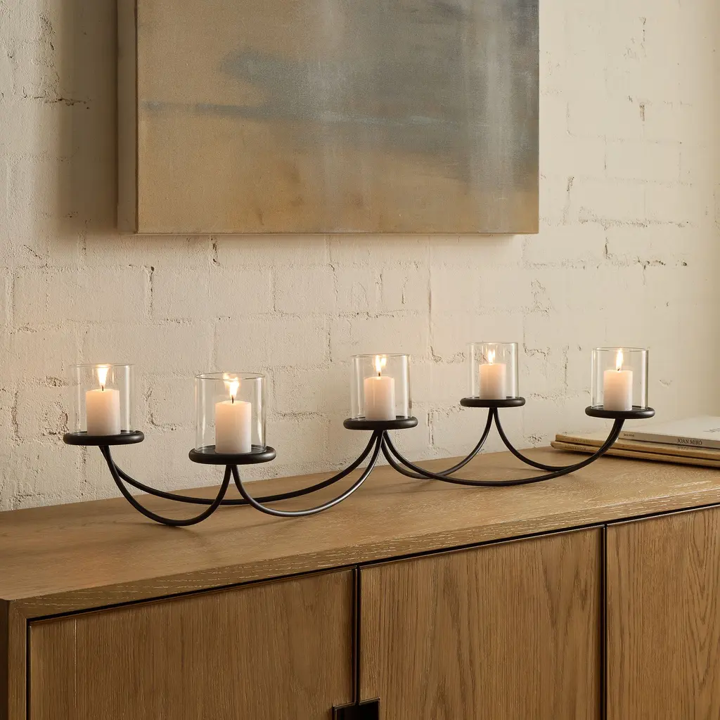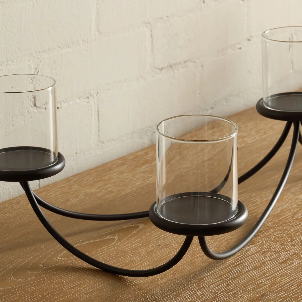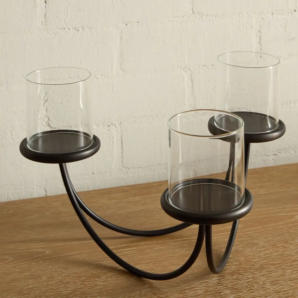 The thin metal frame curves to create a bold, "floating" design. A statement-making display. Keeps votive candles secure and in place when lit. Looks great on mantels, tabletops and desks.