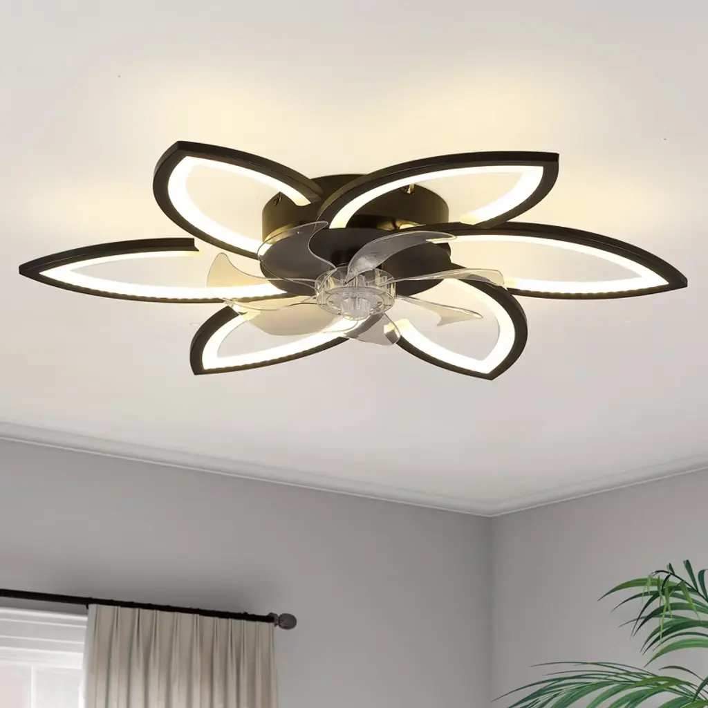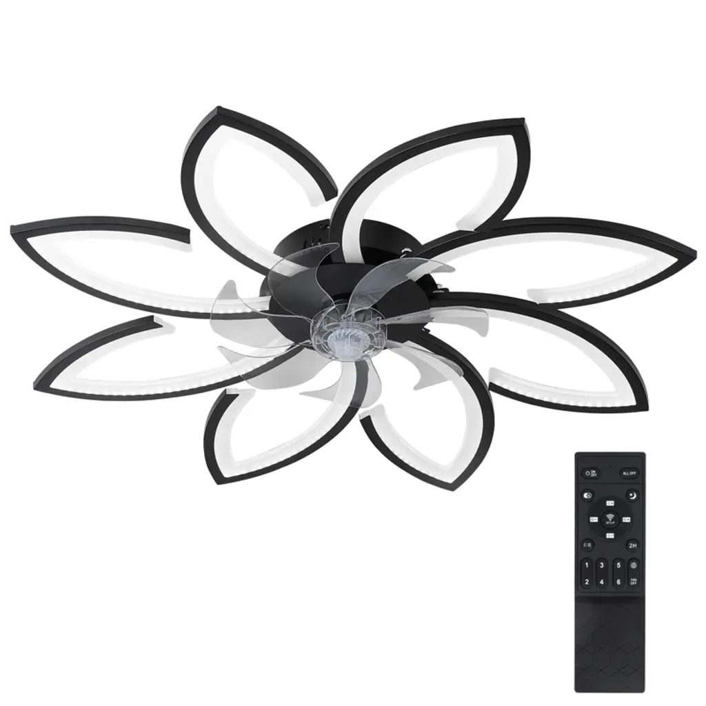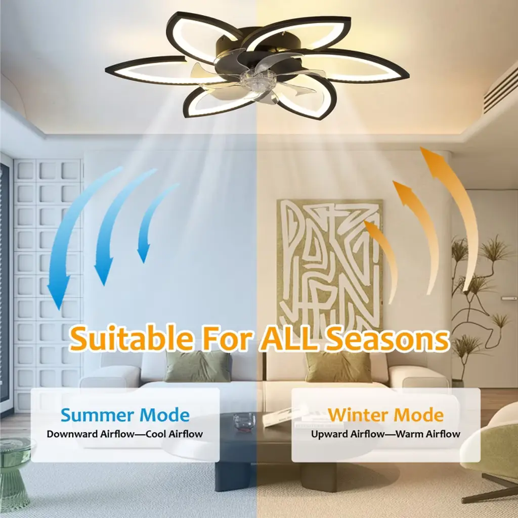 Experience elegance and innovation with this illuminated indoor ceiling fan with light, designed to shine like a radiant star in your home. Combining durable metal with lightweight plastic, its modern recessed design resembles a blooming flower¡ªgraceful, stylish, and eye-catching. The sturdy metal frame ensures stability, while the sleek plastic components add a touch of airy sophistication. When switched on, the integrated LED light emits a soft, ambient glow that is both eco-friendly and energy-efficient. Whether installed in a bedroom, living room, or dining space, this Multi-Kinetic Ceiling Fan Light offers both functionality and visual appeal, making it a captivating centerpiece that brings comfort, cooling, and charm to any room. Features: Perfect Fit for Any Room: This ceiling fan light is ideal for small to medium-sized indoor areas such as bedrooms, living rooms, dining spaces, offices, or even sheltered outdoor areas like covered porches or patios. Independent Dual Functions: The lighting and fan functions operate separately to suit various needs. Use the light for reading or the fan alone for sleeping¡ªit's adaptable for any situation. Six-speed Adjustment: With 6 adjustable wind speeds (low 1 - 2, medium 3 - 4, high 5 - 6), you can precisely adjust the wind power according to different environments and personal feelings. Winter and Summer Mode Switching: Two rotation modes in winter and summer create an indoor environment for you in all seasons. Positive rotation in summer brings coolness, accelerates air flow and cools down quickly; reverse rotation in winter promotes indoor air circulation and makes the indoor temperature more even and comfortable. Smart Dimming System: Choose from three color temperatures¡ªwarm, natural, and cool light¡ªwith brightness adjustable from 0% to 100%. Whether you're setting the mood for a cozy evening or need bright light for work, this system adapts to your environment. Auto Timer Shut-Off: Set the fan to turn off automatically after 1, 2, or 4 hours (2 hours via remote; 1/2/4 hours via app). Conserve energy and enjoy peace of mind without needing to remember to power down. Intelligent Control Options: Operate your ceiling fan light using the included 2.4G remote control or through the exclusive mobile app. The app provides additional features and personalization, allowing you to manage your indoor climate from anywhere, anytime. Assembly Note: This product comes as part of an assembly series. While it includes multiple components, the electronic manual simplifies the process. Assembly can be a rewarding DIY project, but if you're not comfortable with it, we suggest hiring a professional electrician.