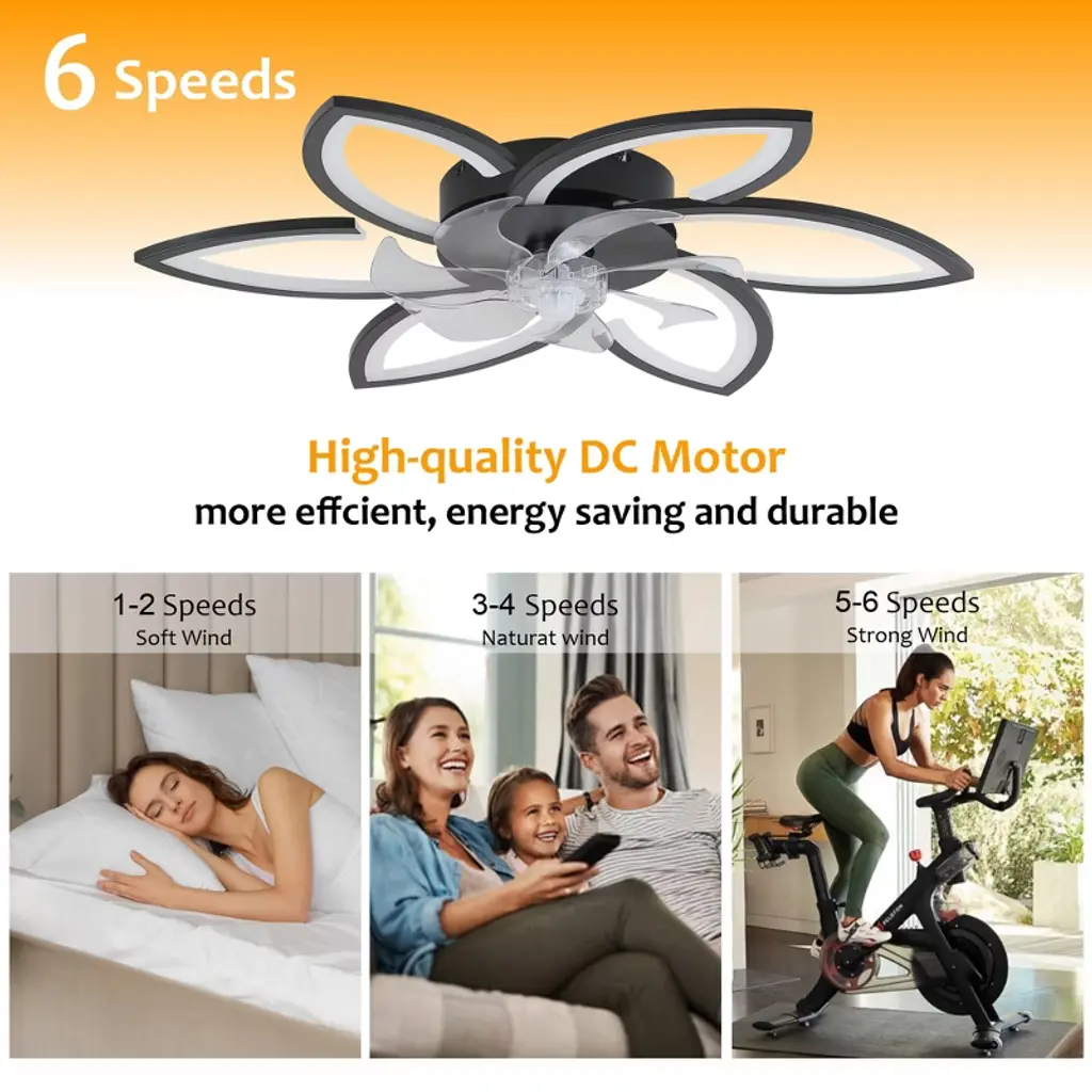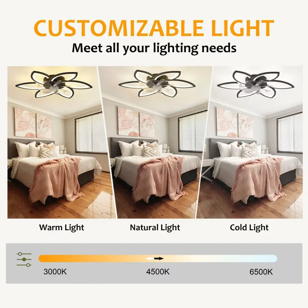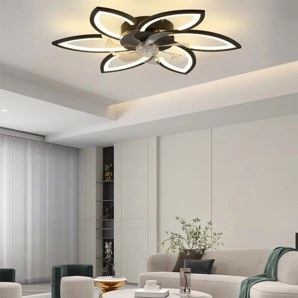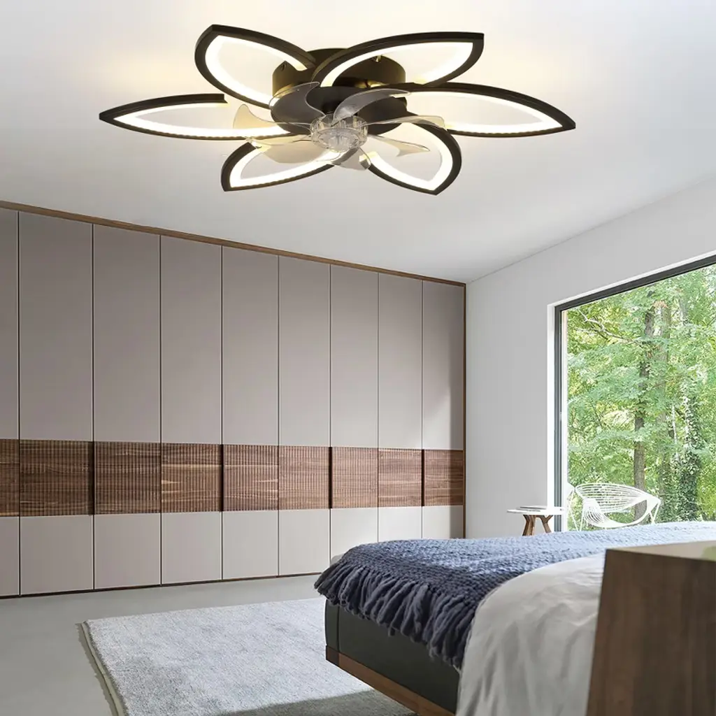 Experience elegance and innovation with this illuminated indoor ceiling fan with light, designed to shine like a radiant star in your home. Combining durable metal with lightweight plastic, its modern recessed design resembles a blooming flower¡ªgraceful, stylish, and eye-catching. The sturdy metal frame ensures stability, while the sleek plastic components add a touch of airy sophistication. When switched on, the integrated LED light emits a soft, ambient glow that is both eco-friendly and energy-efficient. Whether installed in a bedroom, living room, or dining space, this Multi-Kinetic Ceiling Fan Light offers both functionality and visual appeal, making it a captivating centerpiece that brings comfort, cooling, and charm to any room. Features: Perfect Fit for Any Room: This ceiling fan light is ideal for small to medium-sized indoor areas such as bedrooms, living rooms, dining spaces, offices, or even sheltered outdoor areas like covered porches or patios. Independent Dual Functions: The lighting and fan functions operate separately to suit various needs. Use the light for reading or the fan alone for sleeping¡ªit's adaptable for any situation. Six-speed Adjustment: With 6 adjustable wind speeds (low 1 - 2, medium 3 - 4, high 5 - 6), you can precisely adjust the wind power according to different environments and personal feelings. Winter and Summer Mode Switching: Two rotation modes in winter and summer create an indoor environment for you in all seasons. Positive rotation in summer brings coolness, accelerates air flow and cools down quickly; reverse rotation in winter promotes indoor air circulation and makes the indoor temperature more even and comfortable. Smart Dimming System: Choose from three color temperatures¡ªwarm, natural, and cool light¡ªwith brightness adjustable from 0% to 100%. Whether you're setting the mood for a cozy evening or need bright light for work, this system adapts to your environment. Auto Timer Shut-Off: Set the fan to turn off automatically after 1, 2, or 4 hours (2 hours via remote; 1/2/4 hours via app). Conserve energy and enjoy peace of mind without needing to remember to power down. Intelligent Control Options: Operate your ceiling fan light using the included 2.4G remote control or through the exclusive mobile app. The app provides additional features and personalization, allowing you to manage your indoor climate from anywhere, anytime. Assembly Note: This product comes as part of an assembly series. While it includes multiple components, the electronic manual simplifies the process. Assembly can be a rewarding DIY project, but if you're not comfortable with it, we suggest hiring a professional electrician.