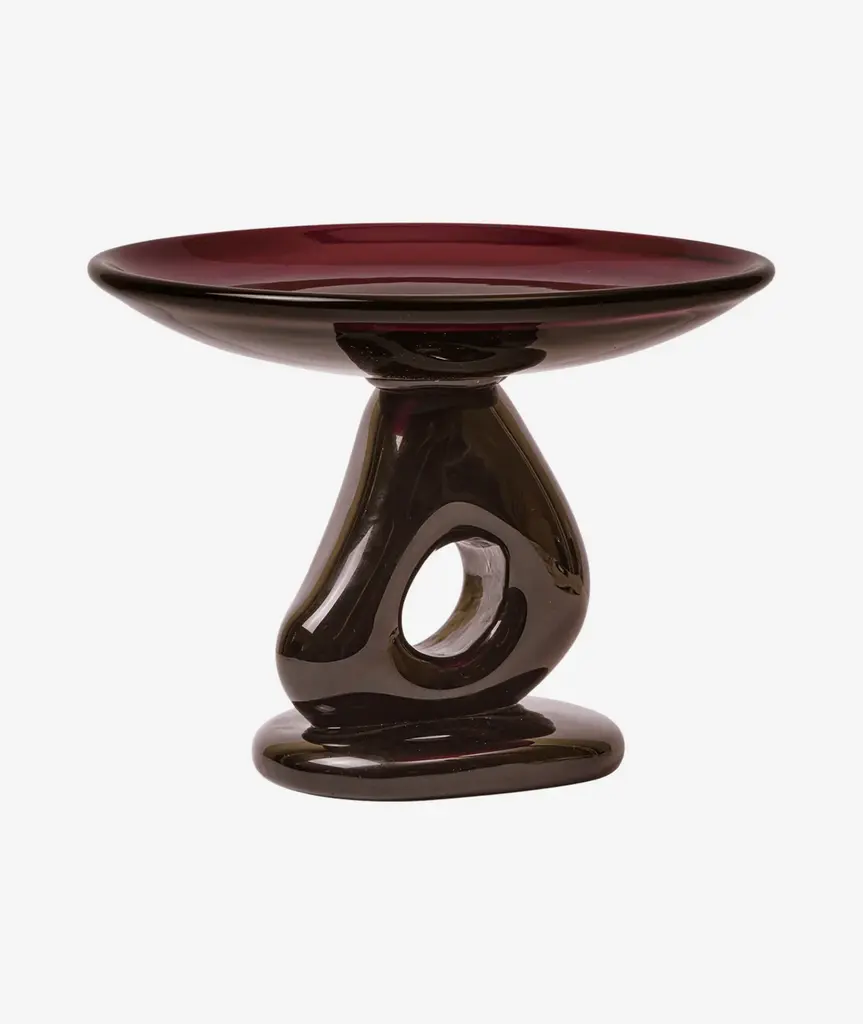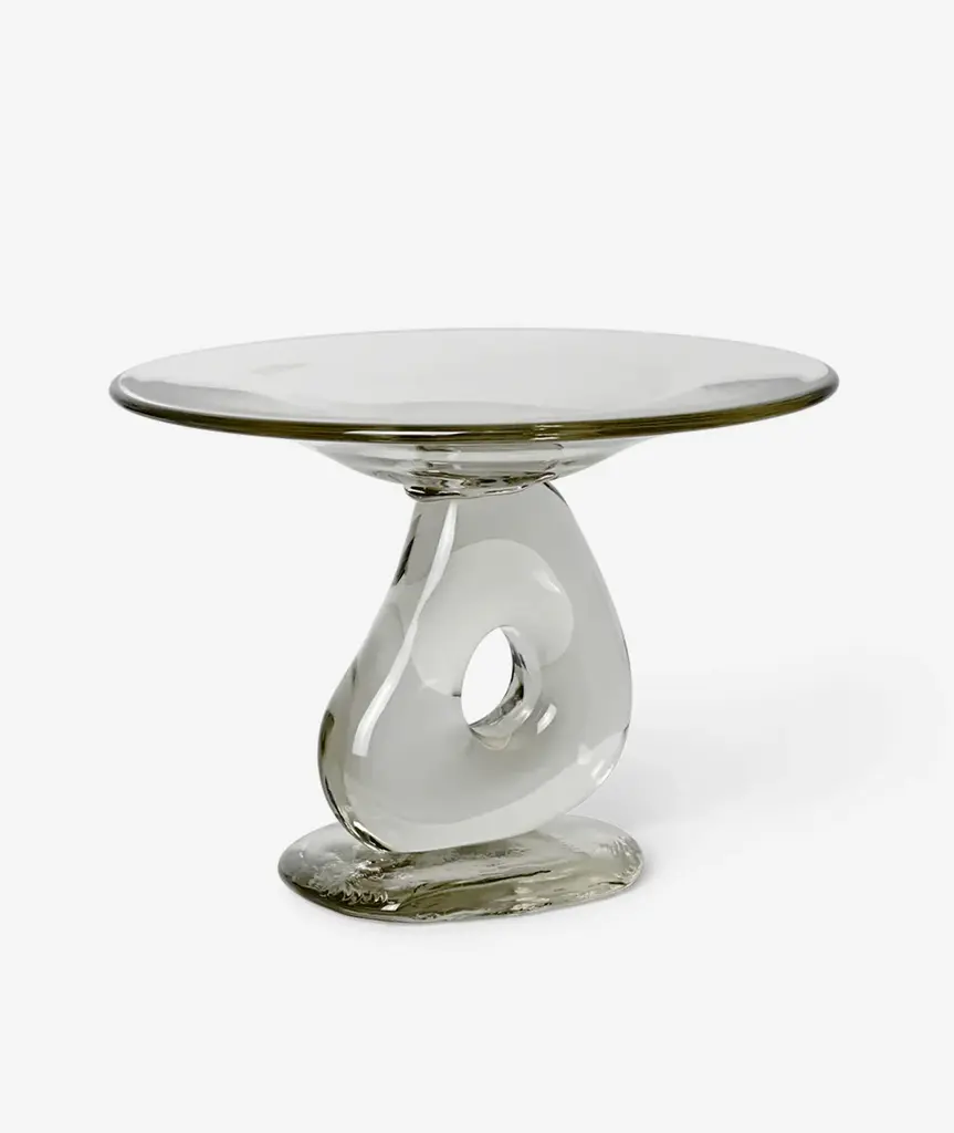 The Damo Glass Centrepiece embodies fluid elegance in a compact form. As the smaller counterpart to the larger Damo Centrepiece, it offers the same sculptural presence in a more refined scale. Crafted entirely from glass, its sculptural base and gently curved top create a light, floating presence, like water captured in motion. Named after Damona, the Celtic goddess of sacred waters, each handmade piece is uniquely shaped. Ideal for serving small treats or displaying objects, it adds a refined, sculptural touch to any setting. This is a handcrafted piece. Variation in shape may occur.