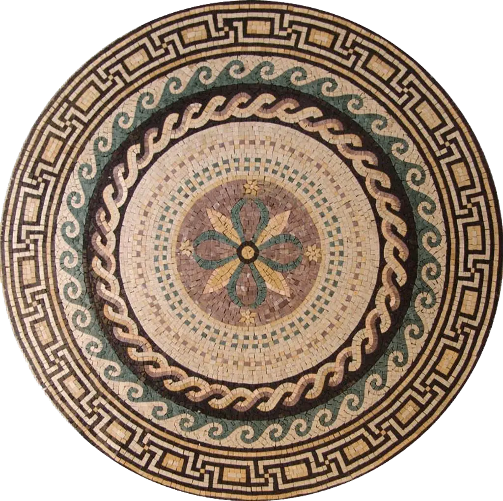 Introducing the Delialah - Greco-Roman Mosaic Medallion, a breathtaking work of art that seamlessly combines history, craftsmanship, and elegance. This exquisite piece is designed to captivate and inspire, making it the perfect centerpiece for your home, office, or gallery. The Delialah medallion showcases a harmonious blend of geometric and nautical patterns that pay homage to the ancient Greco-Roman era. With its intricate details and thoughtfully arranged motifs, this medallion draws the eye, inviting viewers to explore the mesmerizing craftsmanship and artistry that it embodies. At the center, a beautifully designed flower motif serves as a symbol of beauty and resilience, reinforcing the timeless nature of this exquisite decor item.Crafted with the utmost care, the Delialah medallion is made from high-quality materials that ensure its longevity and durability. Whether used as a decorative piece on a wall or as a captivating accent on a table or shelf, its presence is sure to elevate the aesthetic of any space. The rich textures and vibrant colors bring a touch of sophistication and charm, perfectly complementing both modern and traditional interiors.Transform your living space with the elegance of the Delialah - Greco-Roman Mosaic Medallion. Ideal for those who appreciate the arts and wish to bring a historical touch into their home, this medallion serves not just as decor but as a conversation starter and a reflection of your unique taste. Embrace the beauty of ancient artistry and make an enduring statement with the Delialah medallion—where timeless design meets contemporary elegance.