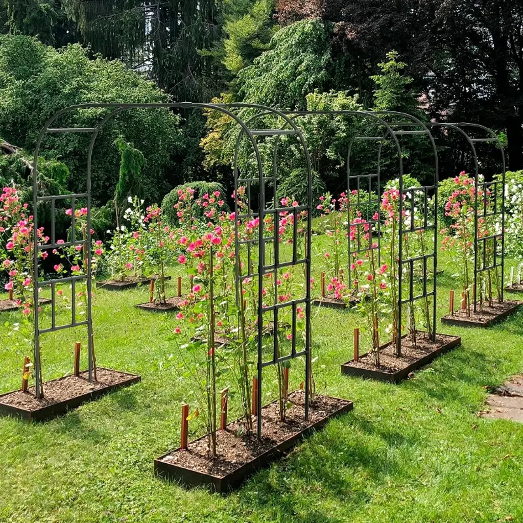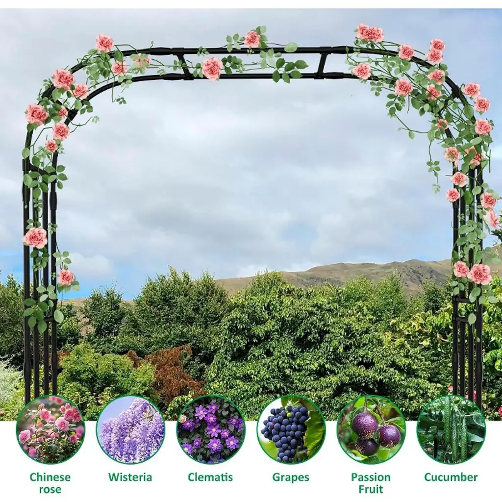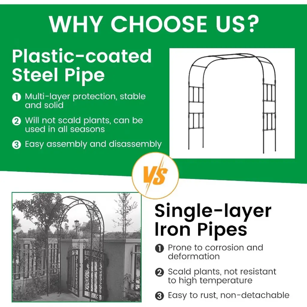 This tall, sturdy arch trellis elevates your garden or outdoor space with its decorative structure, perfect for framing walkways, entry points, or event venues. Its spacious overhead design allows climbing plants like roses, grapes, and cucumbers to thrive while creating a stunning visual centerpiece. Optimize garden space with this vertical arch trellis, designed to support climbing plants like peas, melons, and flowering vines. The generous height allows easy walking and harvesting underneath while adding lush greenery or shade to your yard. Built with a robust polyethylene-coated steel frame, this trellis resists rust, UV damage, and seasonal wear. Its weatherproof design ensures long-lasting durability, maintaining beauty and strength through years of outdoor use. Beyond plant support, transform this arch trellis into a decorative focal point for weddings, parties, or holidays. Adorn it with lights, banners, or tulle to create a magical atmosphere for any occasion, blending practicality with creativity. Effortlessly set up the trellis in minutes using included step-by-step instructions. Accessible installation videos are provided for added convenience(on the product page), letting you focus on gardening or decorating sooner.