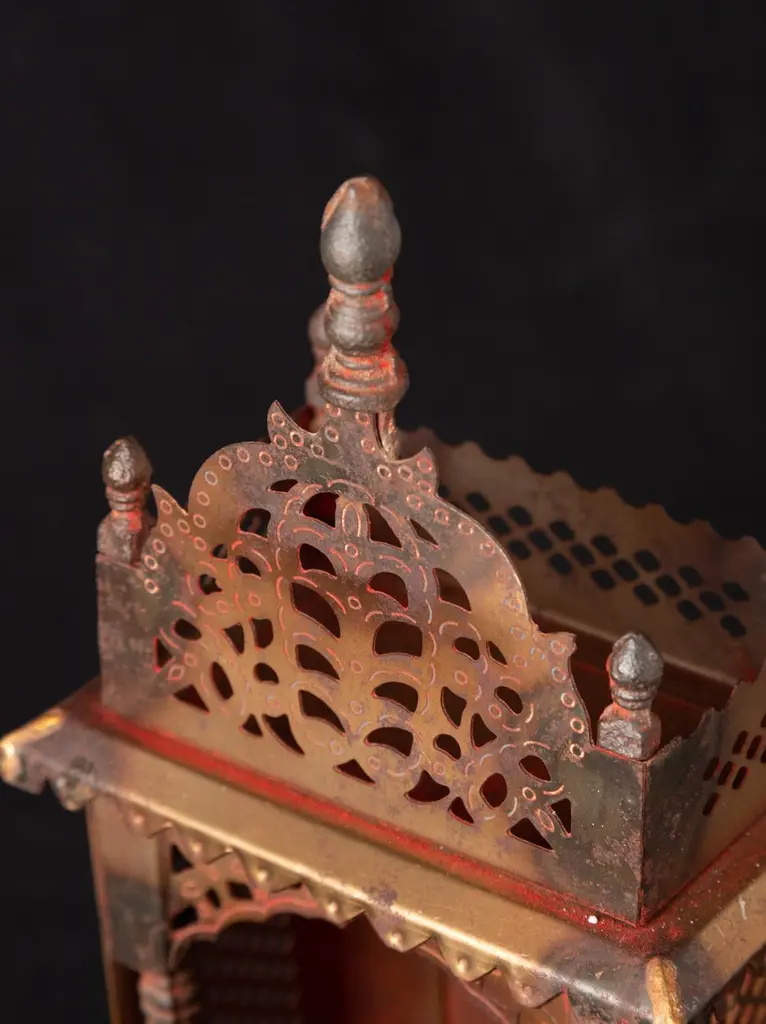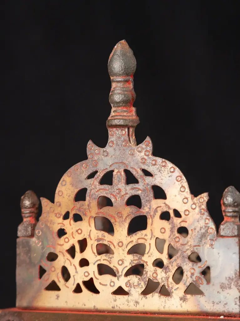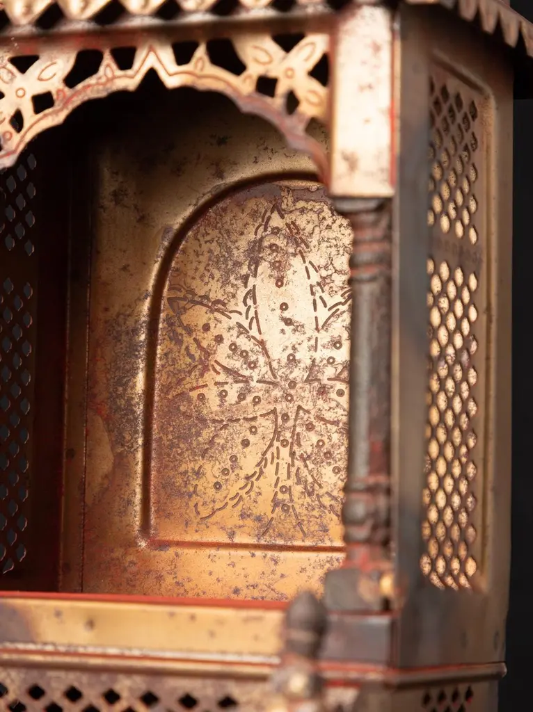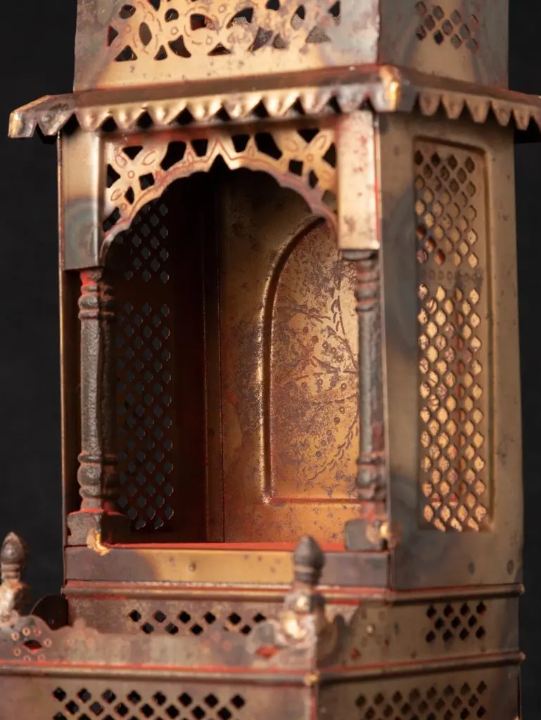 This old metal Buddhist shrine, originating from Nepal, is a fine example of spiritual craftsmanship, reflecting the rich cultural and religious traditions of the region. Made entirely of durable metal, the shrine stands at an elegant height of 37 cm, with dimensions of 14.9 cm in width and 14.1 cm in depth, making it compact yet visually striking. Weighing 1 kg, its size and weight make it suitable for use in personal meditation spaces or as a decorative centerpiece. Dating back to the late 20th or early 21st century, this piece embodies both historical significance and timeless design, serving as a beautiful representation of Buddhist devotion and artistic heritage.Old metal Buddhist shrineMaterial: Metal37 cm high14,9 cm wide and 14,1 cm deepLate 20th / early 21st centuryWeight: 1 kgsOriginating from Nepal