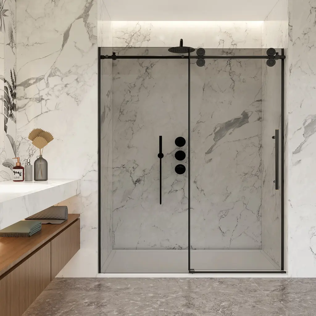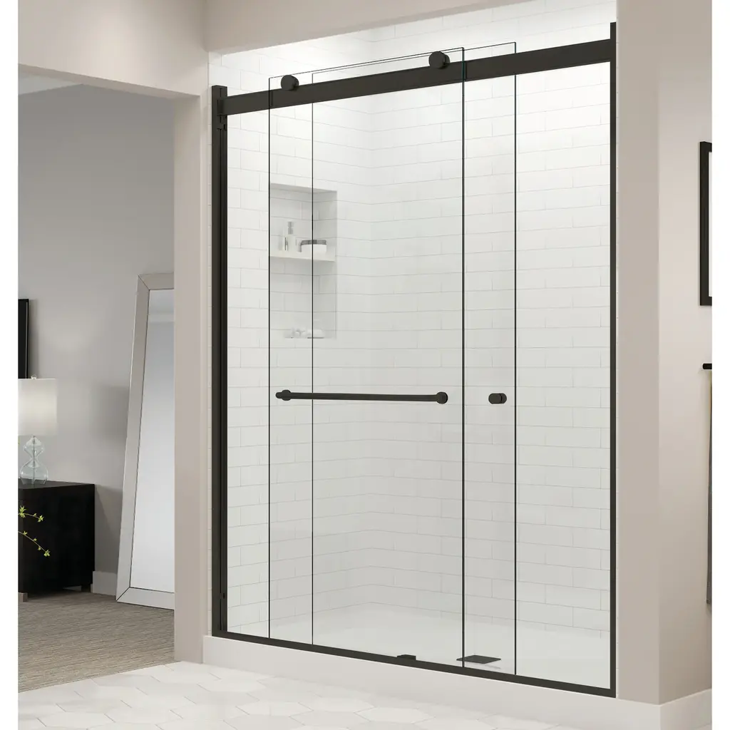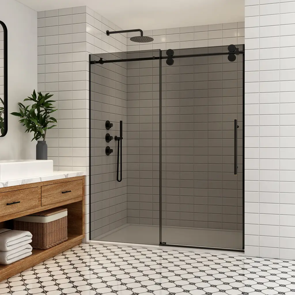 Turn your walk-in shower into a showstopping centerpiece with our Echarri Series Shower Door—a model of refined design. Constructed from premium stainless steel and resilient, high-quality glass, this door is a sublime fusion of style, strength, and sophistication. Meticulous engineering ensures smooth, noise-free gliding performance, while the specially coated glass makes cleaning a breeze.Features ▪ Single sliding door provides a sleek and seamless look to any shower stall. ▪ 10mm tinted glass features a double-side, easy-clean coating on glass for hassle-free maintenance and long-lasting clarity.▪ Hardware available in Matte Black finish to complement any style of bathroom décor.▪ Stainless steel components resist rust and corrosion and deliver superior durability (Φ70mm wheels, Φ25mm support bar, drum-like door stopper, glass holder, wall bracket/wall fittings, handle, guide block, braces).▪ Stainless steel roller ensures consistently smooth opening/closing.▪ Strong, tempered glass with SGCC/ANSI Z97.1-2015 certificate offers exceptional safety and peace of mind.▪ Soft plastic receiver holds shower door glass securely in place.▪ Easy to assemble and install, with detailed instructions provided. Included: Installation instructions, mounting bracket, and hardware.