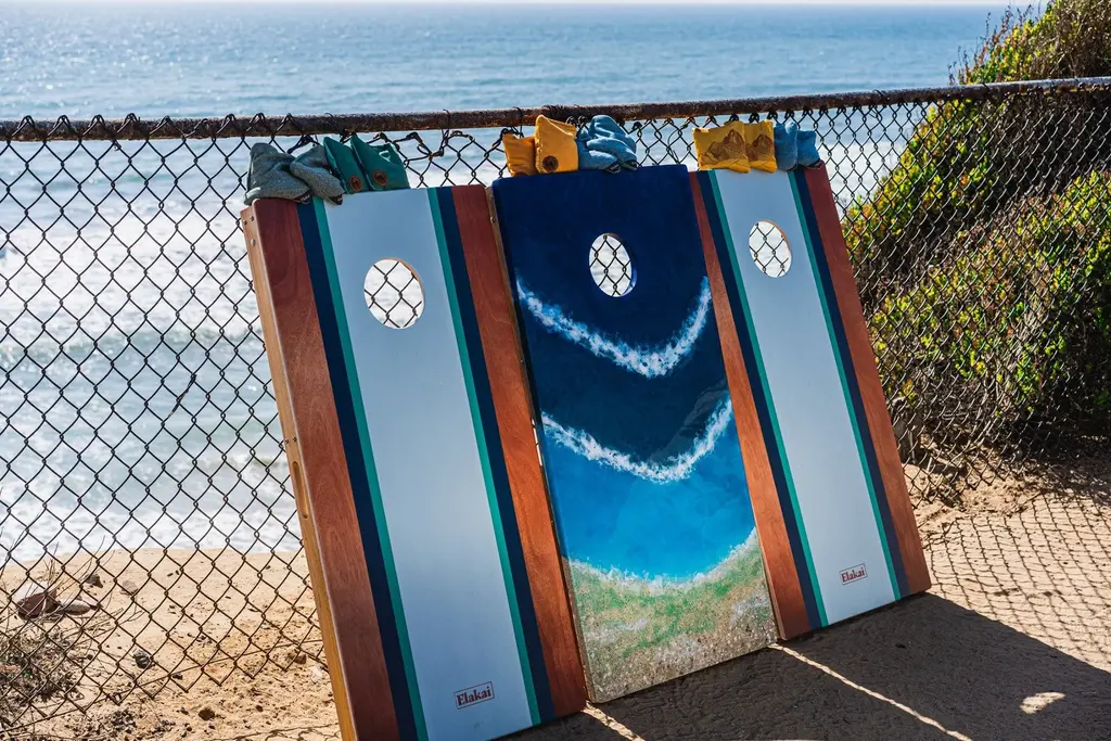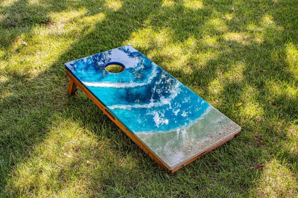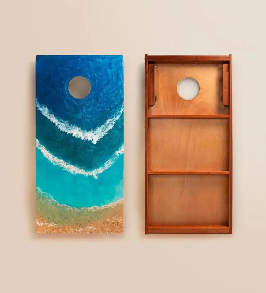 Handmade from live-edge solid wood and epoxy resin, this heirloom-quality, two-by-four-foot regulation cornhole board set serves as a centerpiece of fun and unforgettable artistry for your home. Each outdoor-inspired resin design is created using traditional artisan processes and becomes a piece that is one of a kind.Proud partners of the National Forest Foundation and 1% for the Planet, Elakai is dedicated to protecting the environment as well as investing in social experiences. Their games are handmade from carefully-selected premium materials. Processed in small batches to the highest standards, each piece is unique and durable. Enjoy the outdoors with Elakai.Note: When not in use, this product needs to be stored indoors.
