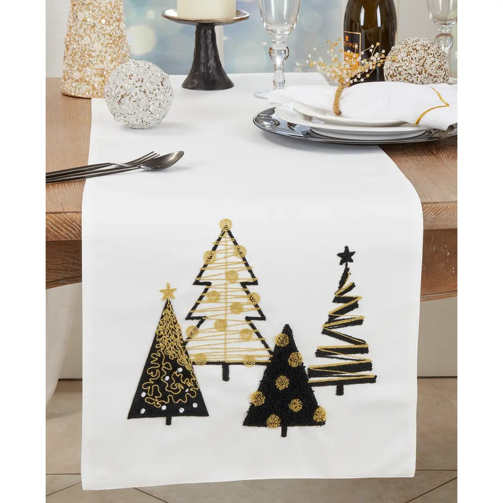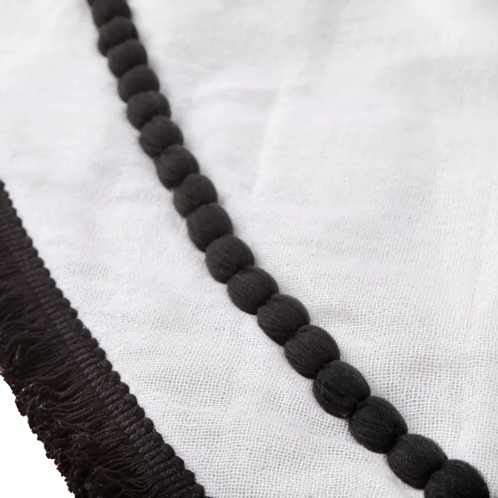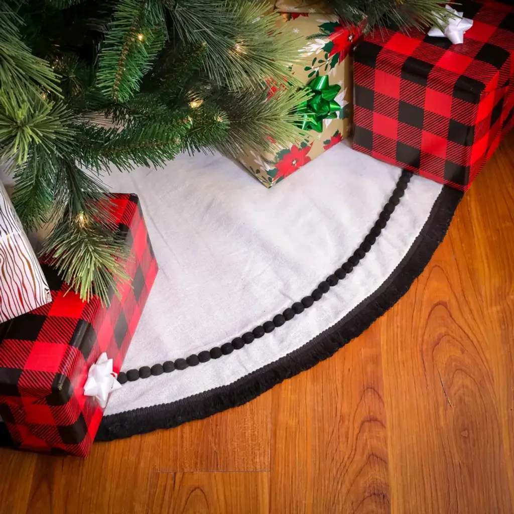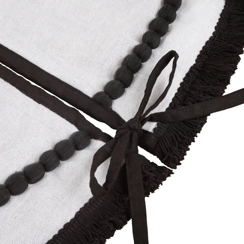 Add a clean and contemporary finishing touch to the base of your Christmas centerpiece with this bright white tree skirt. Made with a mixture of cotton and polyester materials, it is neatly trimmed with a ring of contrasting black mini pom poms and a black fringe edging. The split seam design allows for easy placement with three ties included to close and secure the seam.