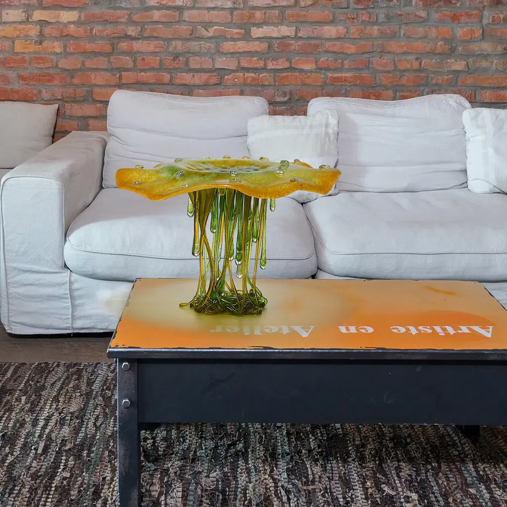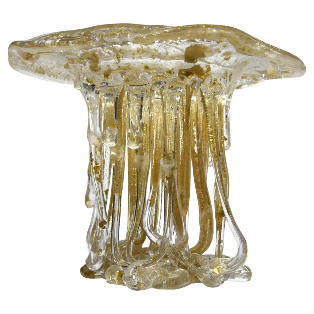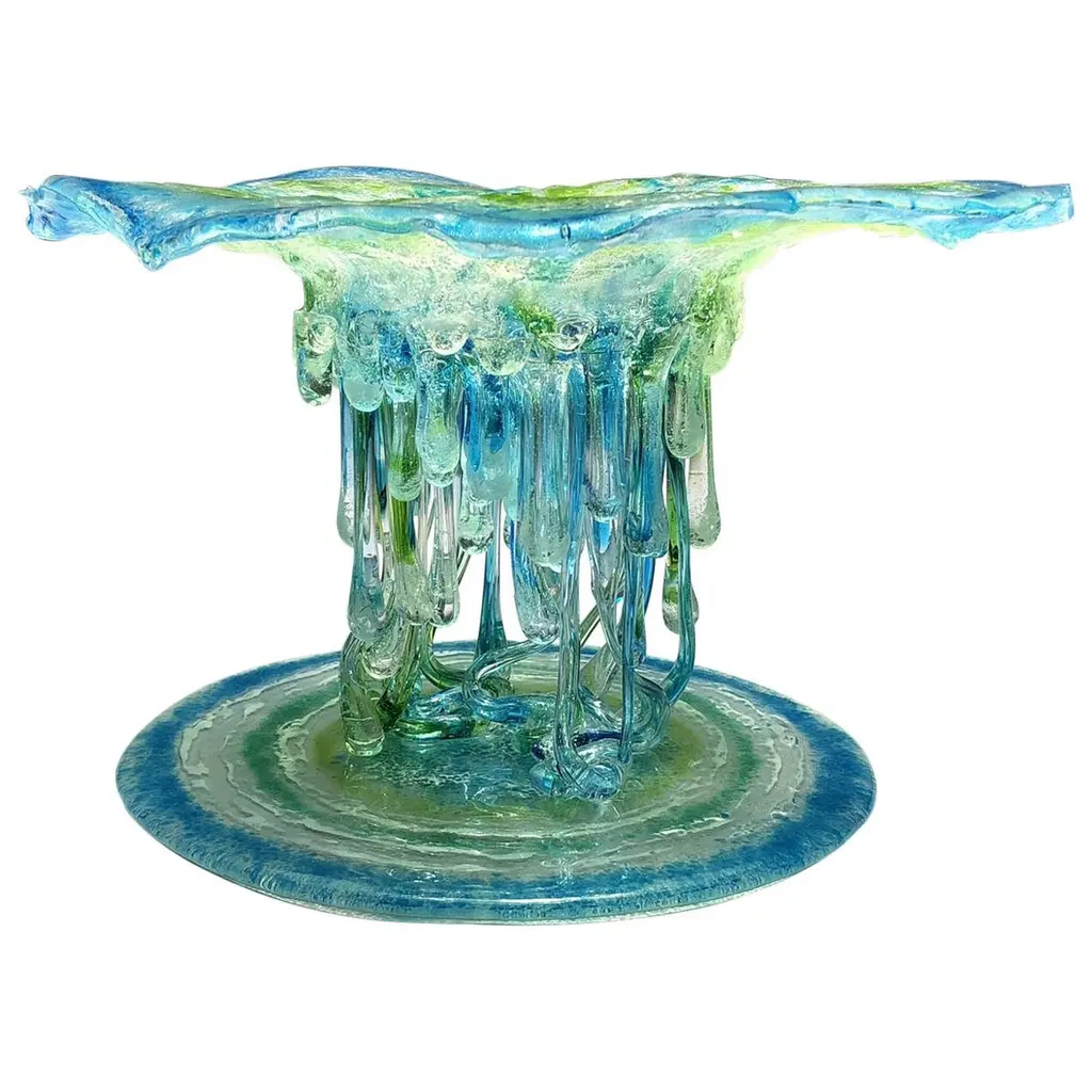 This sculptural centerpiece is part of the "Meduse" series and it is entirely hand-made in one singular process with the vetrofusione technique. The flowing, open top of the sculpture and the dripping, coiled section underneath is reminiscent of a flowing jellyfish and its tentacles.