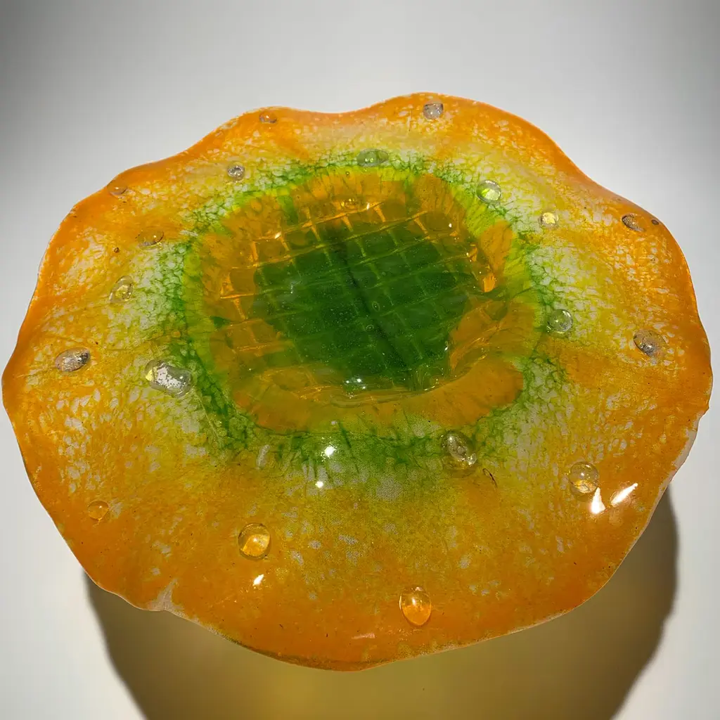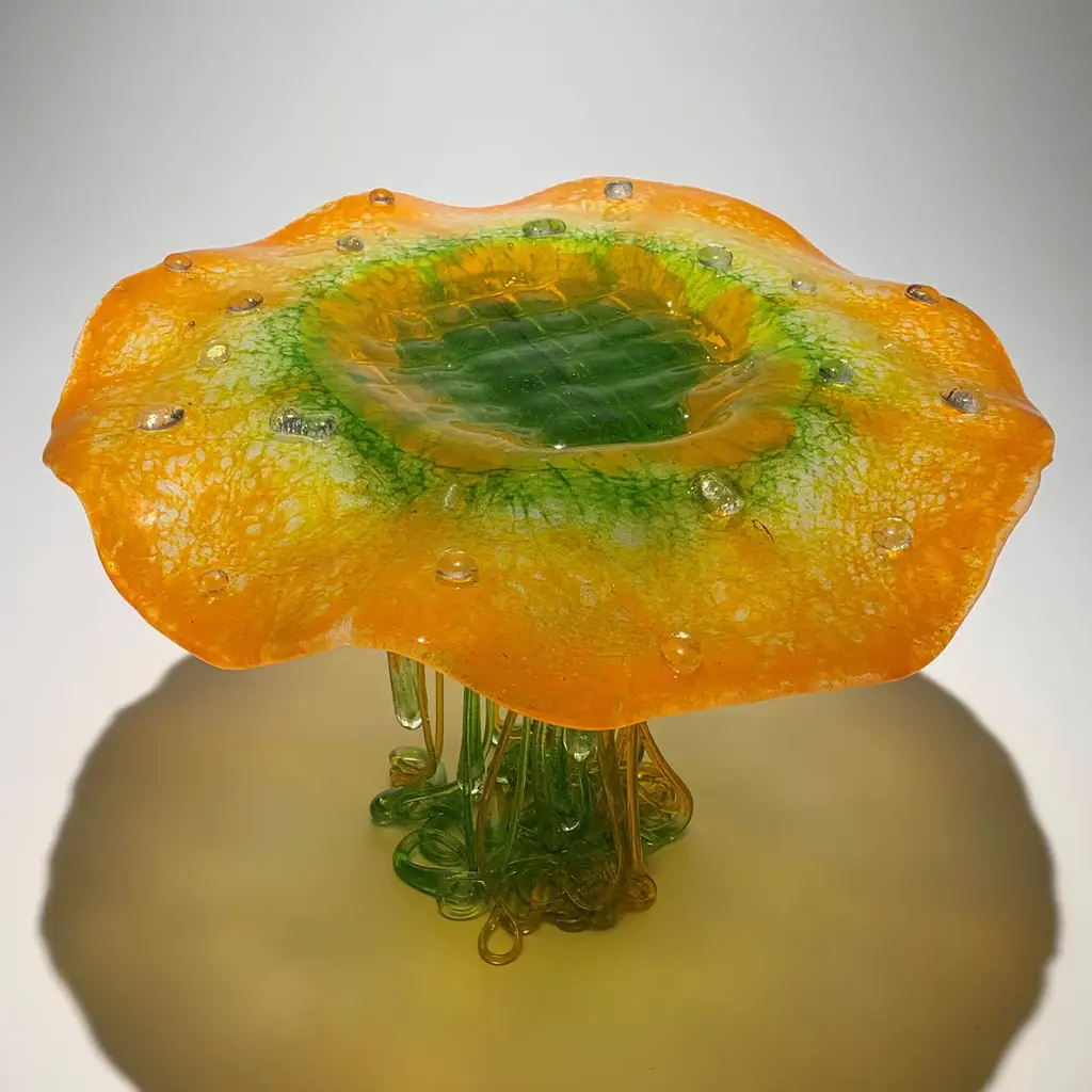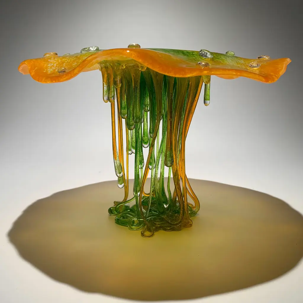 This sculptural centerpiece is part of the "Meduse" series and it is entirely hand-made in one singular process with the vetrofusione technique. The flowing, open top of the sculpture and the dripping, coiled section underneath is reminiscent of a flowing jellyfish and its tentacles.