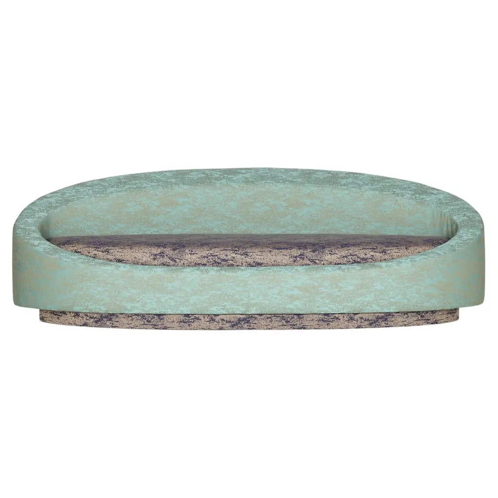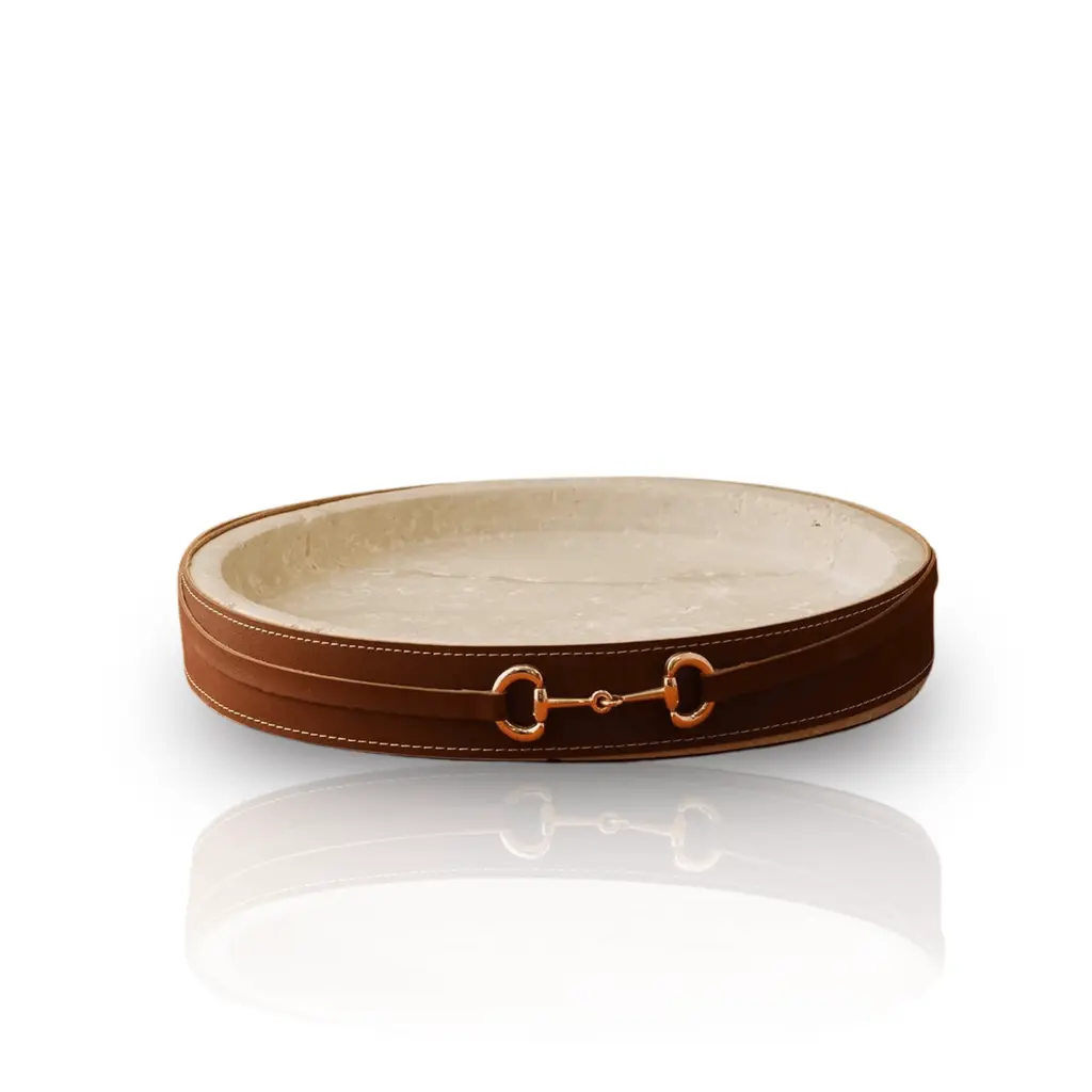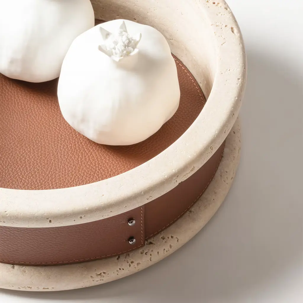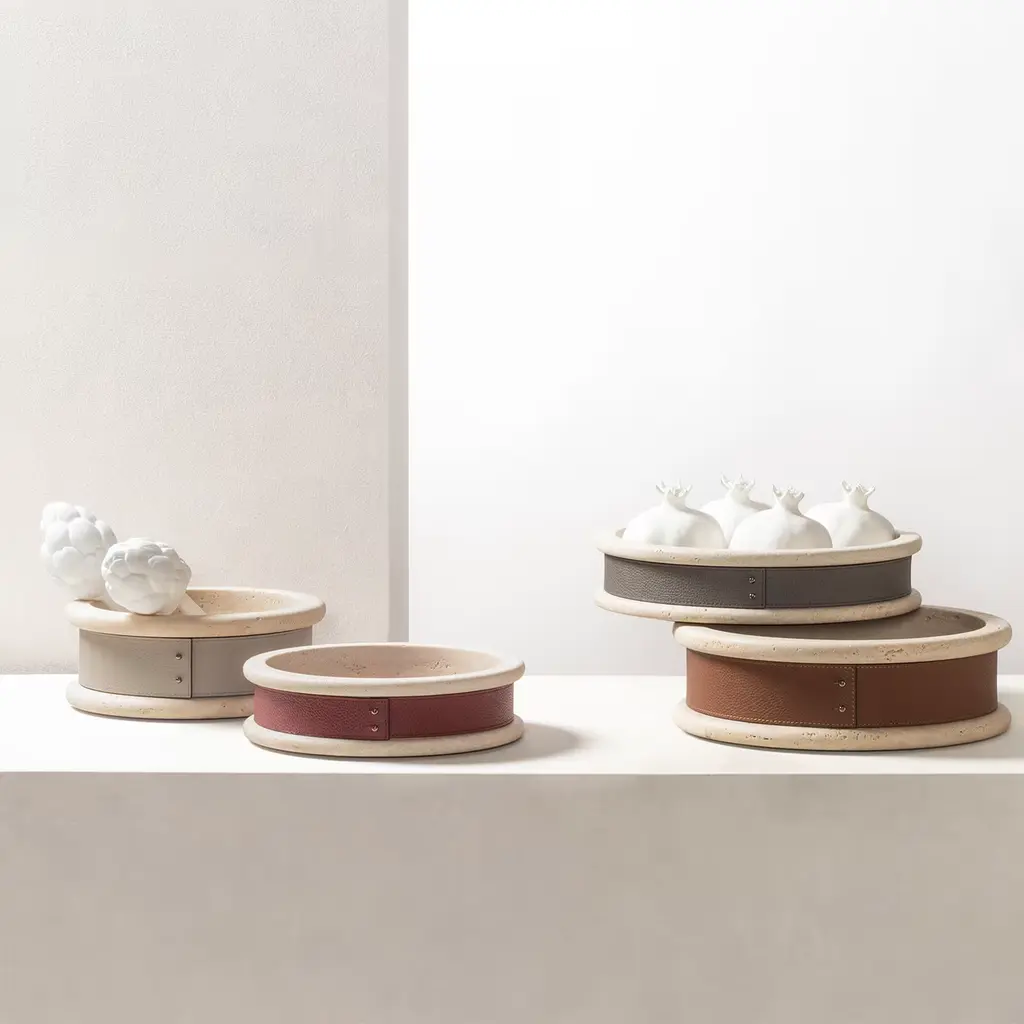 Marble structure with removable leather inner placemat and outer insert provided with chrome-plated buttons.