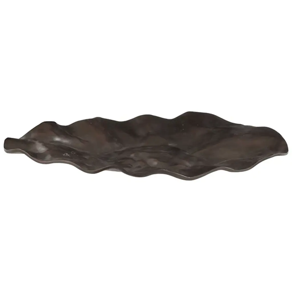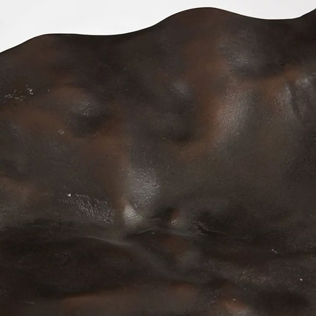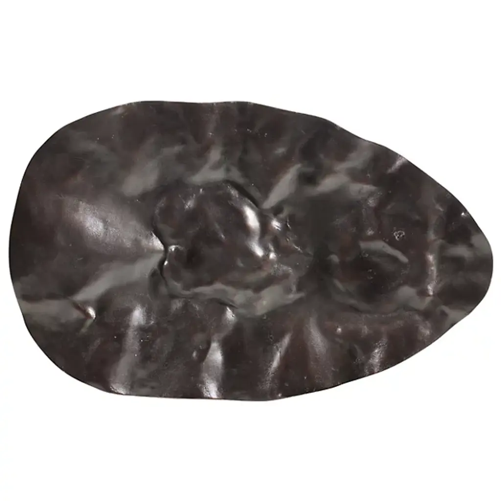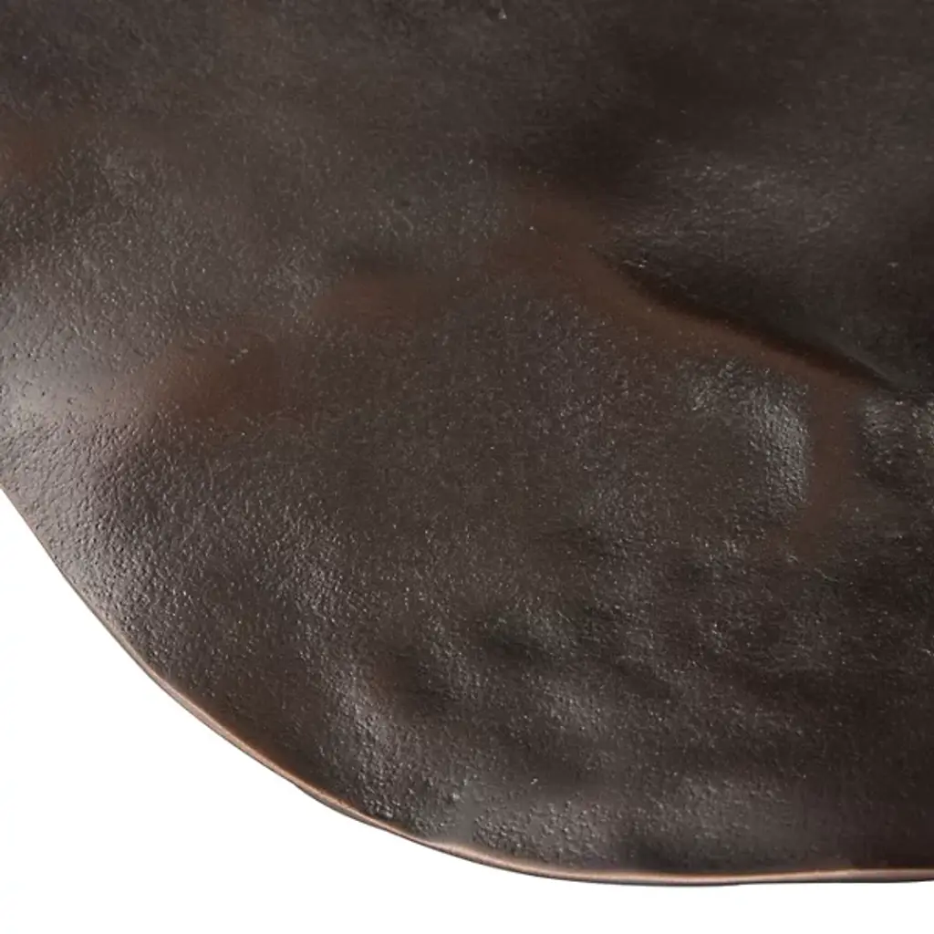 The Essex Centerpiece from Arteriors, crafted from cast aluminum, features a distinctive freeform hammered texture reminiscent of a crushed shield. Its oversized design adds a dramatic touch to any space, while the antique copper finish enhances its textural appeal. Each piece is unique, with variations in the finish adding charm and character. Perfect for making a bold statement in your home decor.