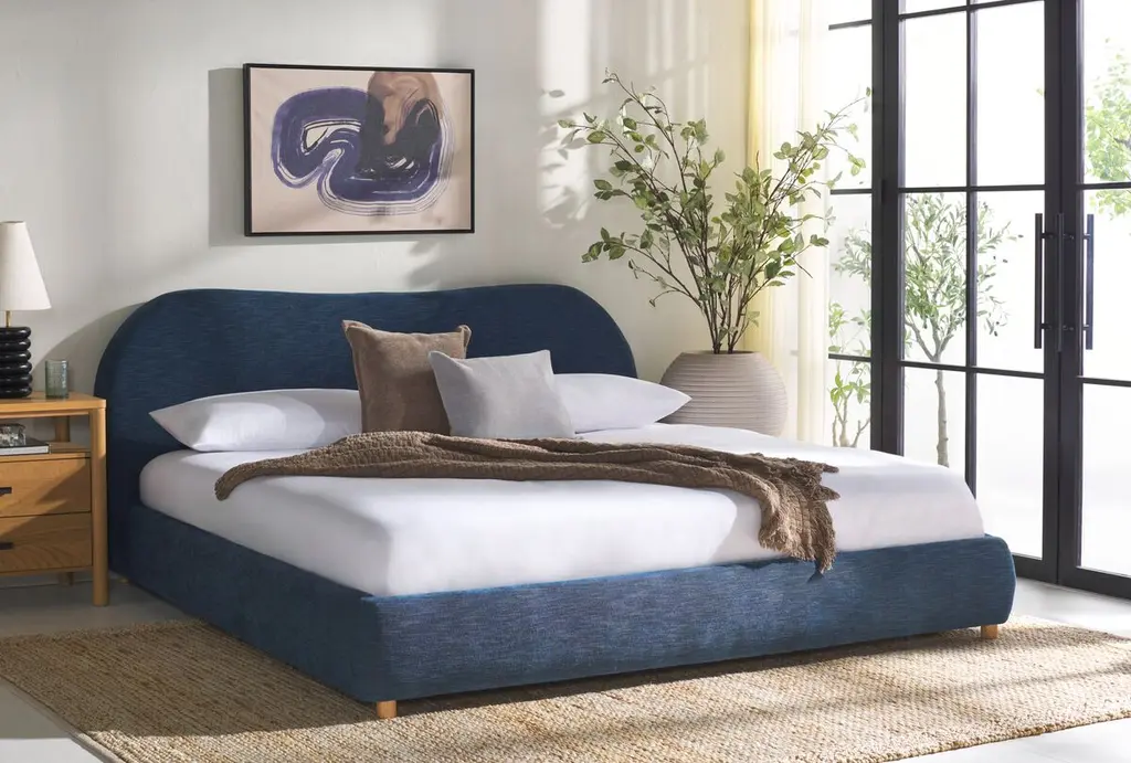 Embrace a cozy and sophisticated centerpiece for your bedroom with our Ezrena bed. Achieving the perfect balance between clean lines and plush curves, our bed vouches for a modern and inviting appeal. Its rails and headboard receive the perfect finishing touch with rounded cylindrical posts. Fully upholstered in the rich textures of boucle, our bed adds a touch of softness to your modern or contemporary bedroom. It includes a tall and plush headboard to invite reading, lounging, and a comfy sleep at night.