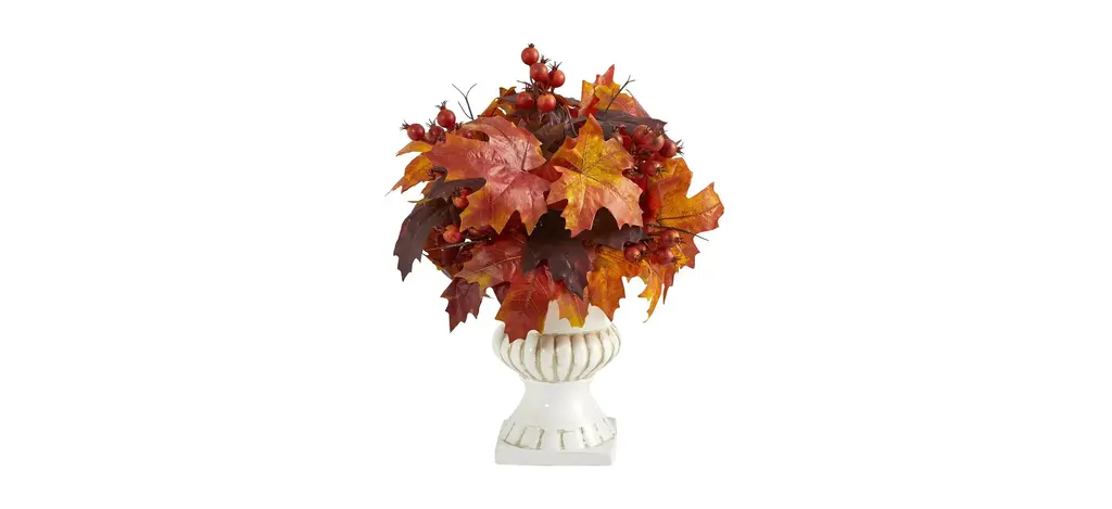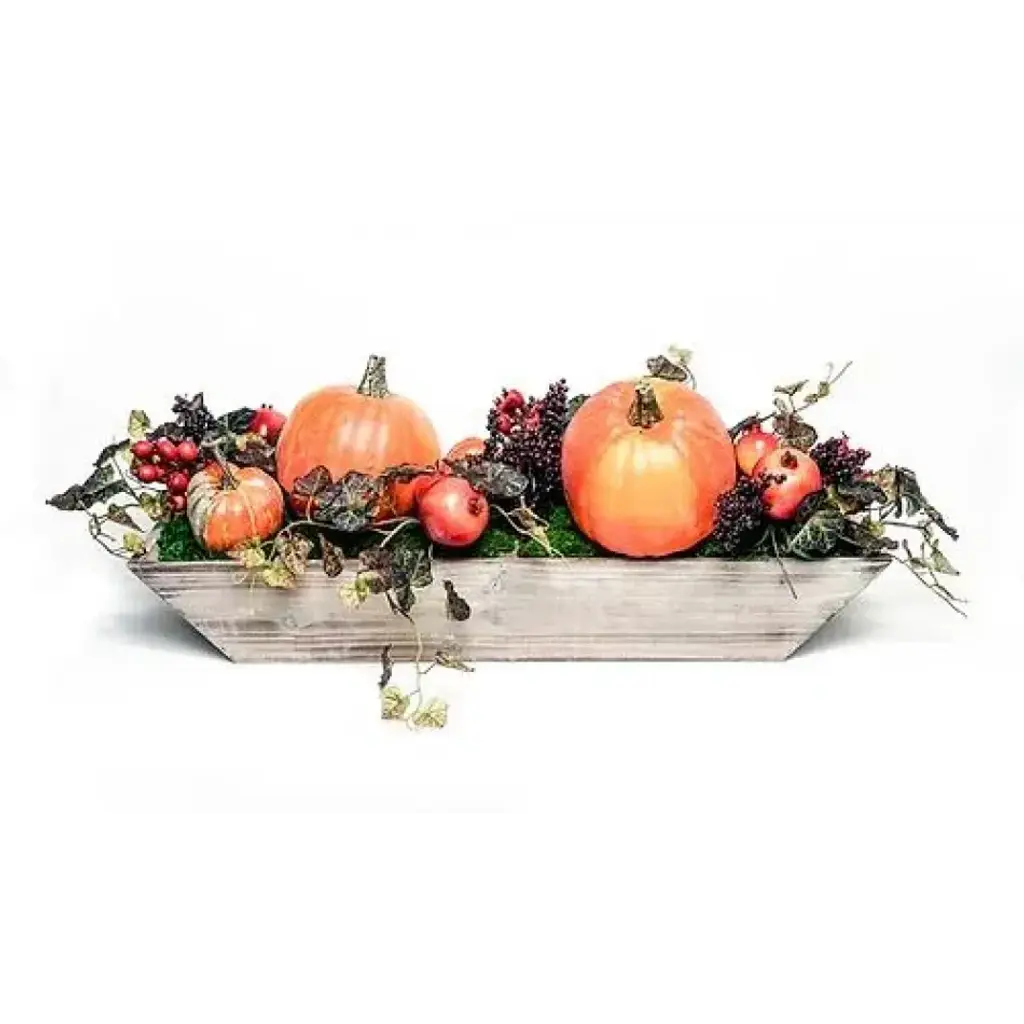 This brilliant medley of textures and colors is fit for a fall celebration. Measuring 32 inches long, our Fall Pumpkin Centerpiece Arrangement is expertly curated with lifelike foliage. Orange magnolia leaves, fans, Queen Anne's lace and pumpkins combine with tan hydrangea blooms and cream protea in a traditional wood dough bowl to create a dimensional accent from any angle. Lifelike foliage Brown wood dough bowl (26"L x 12"W X 4"H) Fluff and shape greenery after unpacking Wipe with soft, dry cloth or duster For indoor use Made in USA A Frontgate exclusive. At Frontgate, our primary focus is quality. We guarantee that every product we sell will stand up to the supreme test – our customers' satisfaction. To learn more about our policies, visit our Shipping & Processing, Returns & Exchanges and Warranty & Price Guarantee pages.
