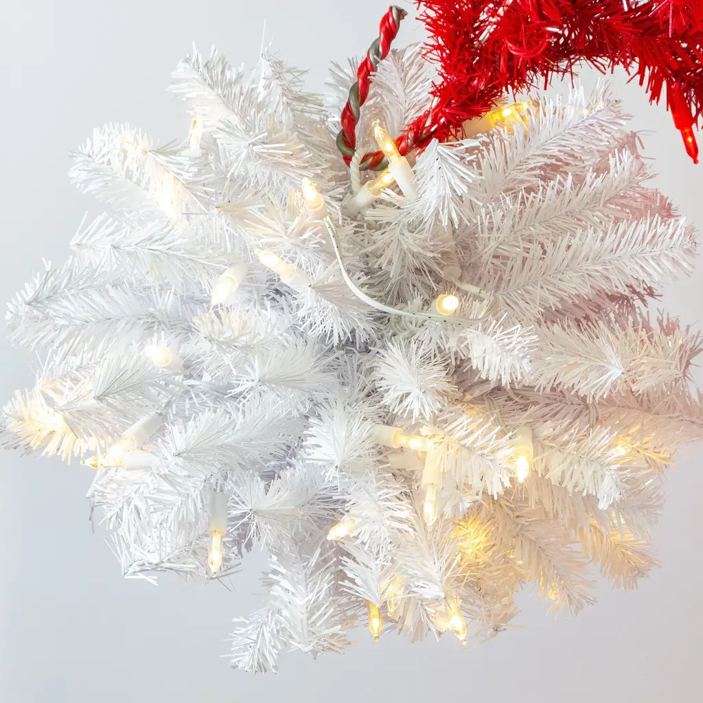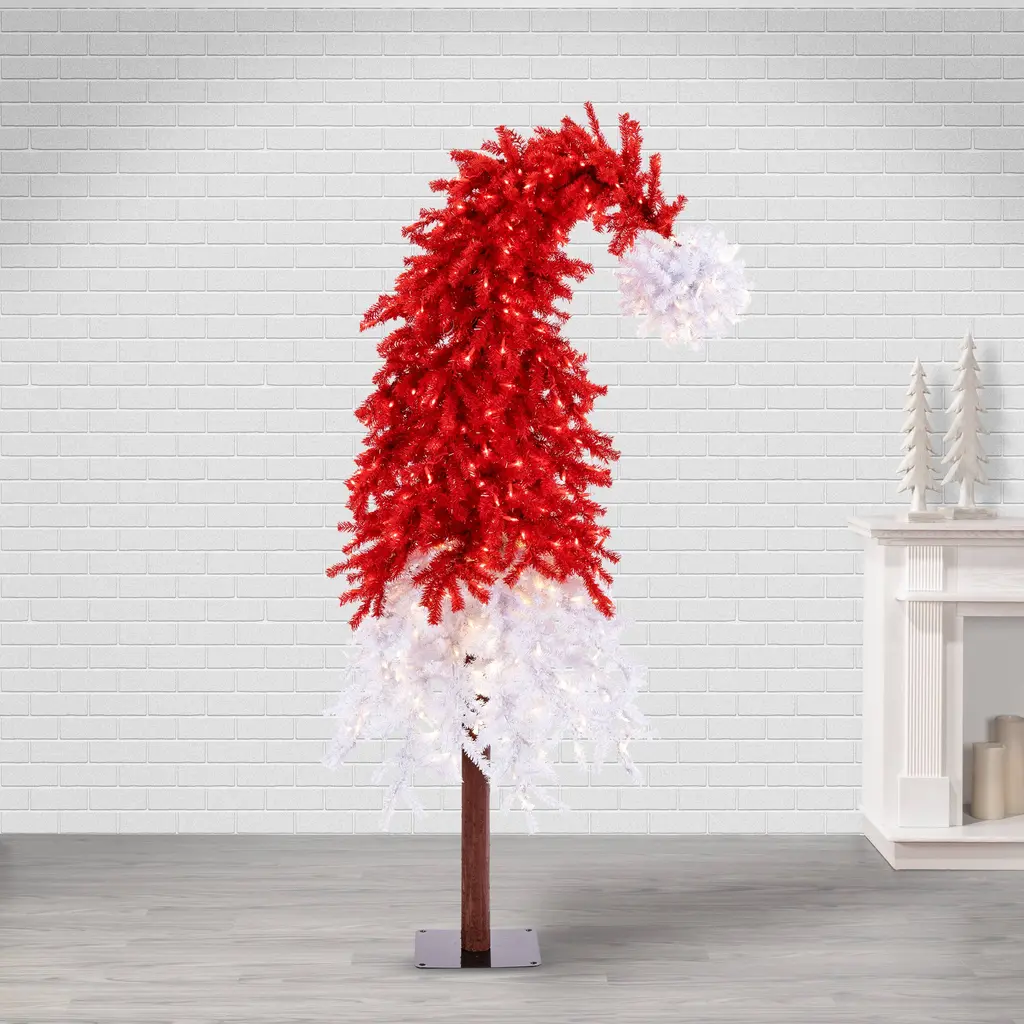 Celebrate the holiday season uniquely with our 7 Foot Santa Hat Christmas Tree, a whimsical addition to your festive decorations. This creatively designed tree mimics the iconic red and white of a Santa hat and features a lush body with 1275 tips, brilliantly illuminated by 200 warm white and 300 red LED lights. It's a perfect centerpiece that combines traditional Christmas colors with an innovative design.