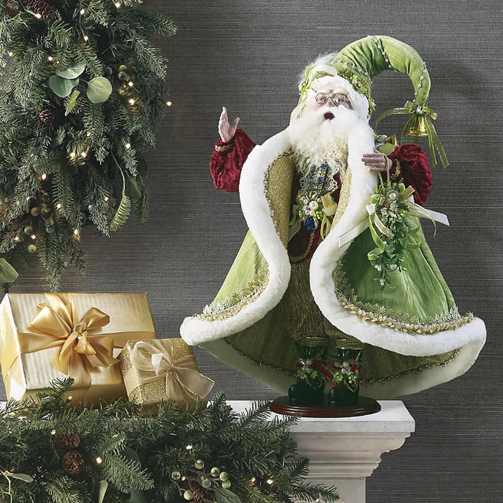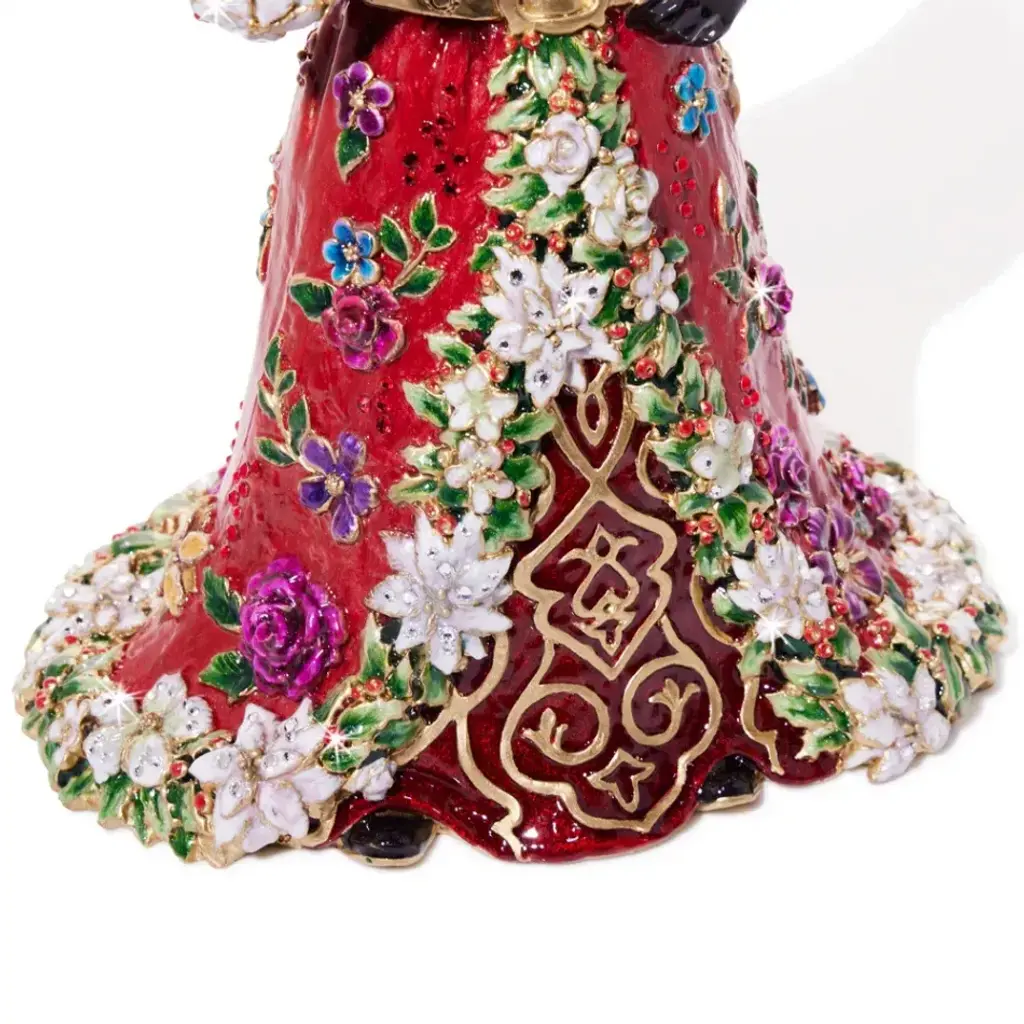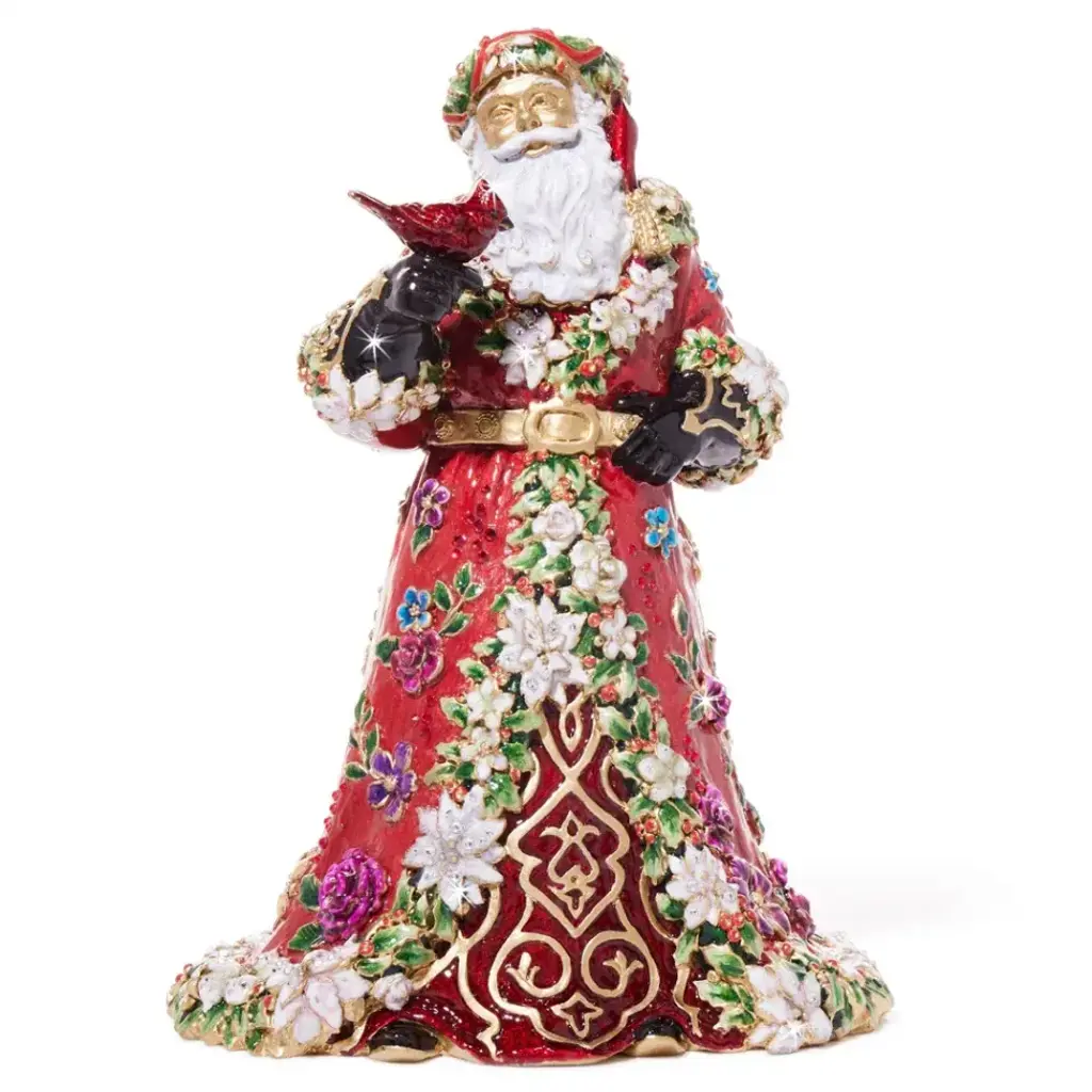 Let the exquisite Floral Santa become a captivating addition to your holiday décor. This figurine features intricate details, including a red robe adorned with white poinsettias and jewel-toned floral embellishments, accented with 14k gold. Crafted by master artisans, he holds a red cardinal symbolizing the spirit of the season. With unmatched detail and charming design, this St. Nick is sure to become a cherished centerpiece in your holiday display.