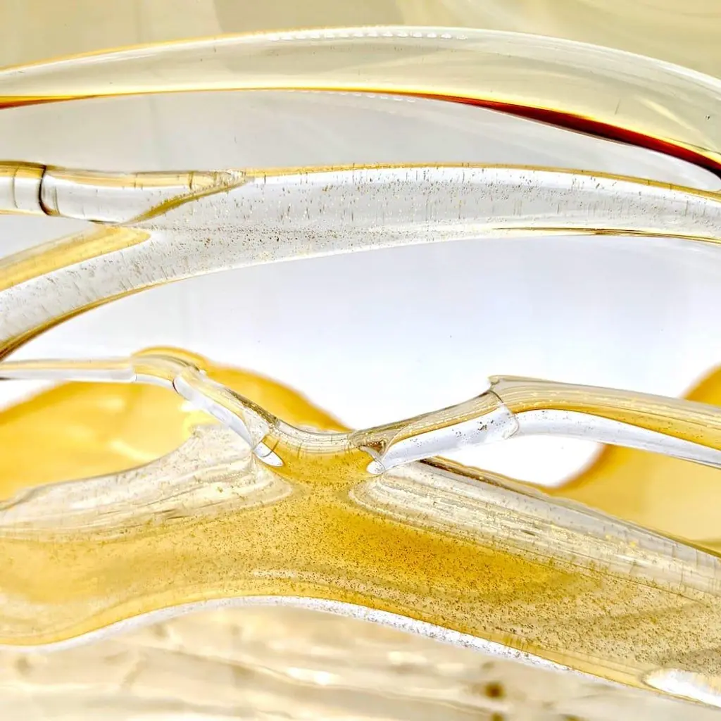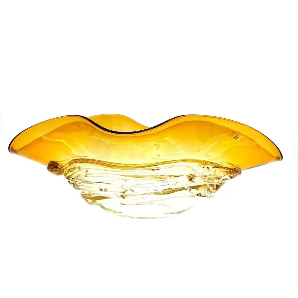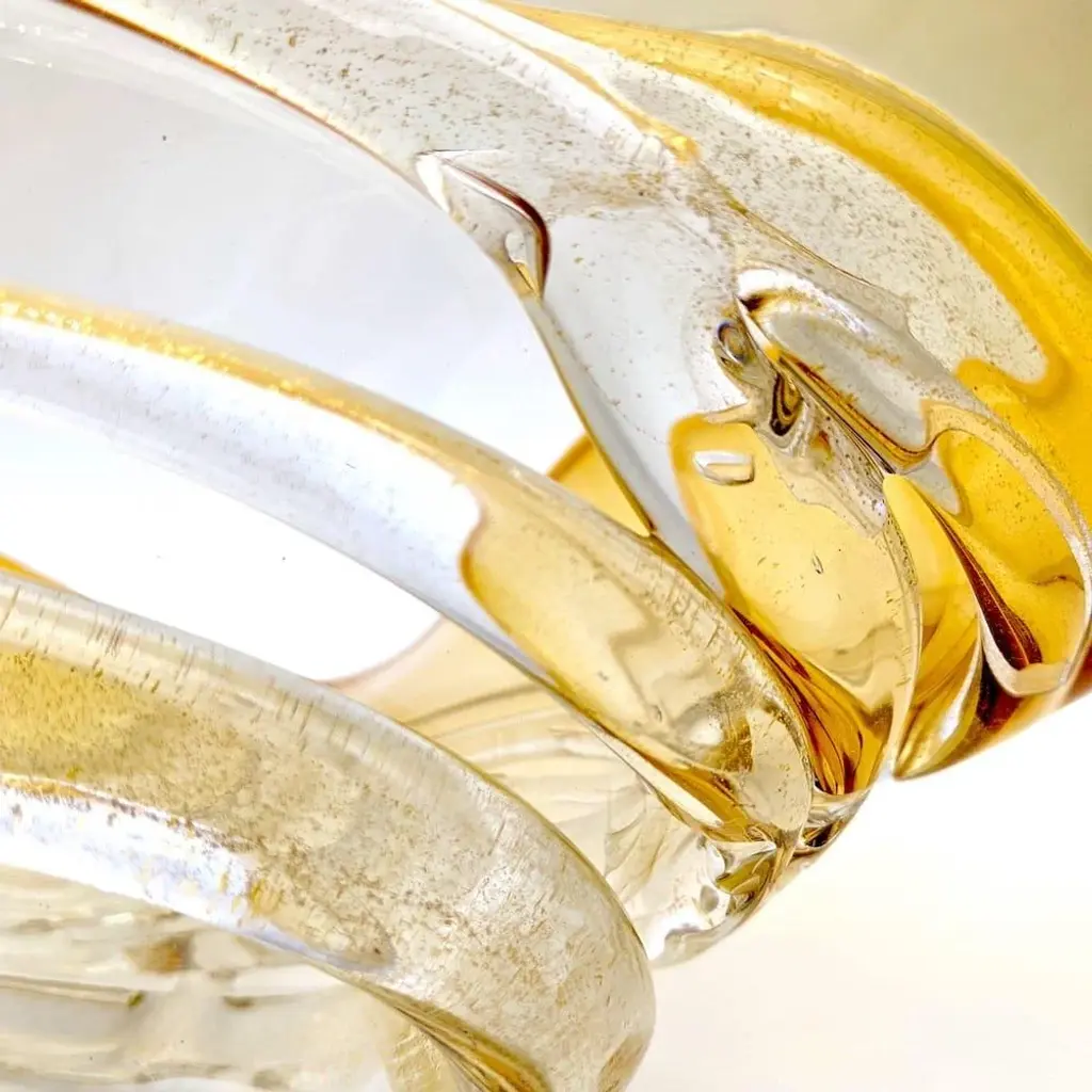 Elegant amber Murano glass centerpiece with crystal and gold leaf details. Suitable for classic or modern furnishings. The item bears the "Vetro Artistico® Murano" trademark which comes in the form of an adhesive sticker bearing the manufacturer's numerical code and the writing "Vetro Artistico® Murano" made of gold leaf. It is a mark of origin that certifies glass products made on the island of Murano in Venice. The Brand was established by law of the Italian State (Veneto Region lex. n. 70 of 12/23/1994) and is the only official guarantee of a glass product certainly made on the island of Murano. Labeled by Maker
