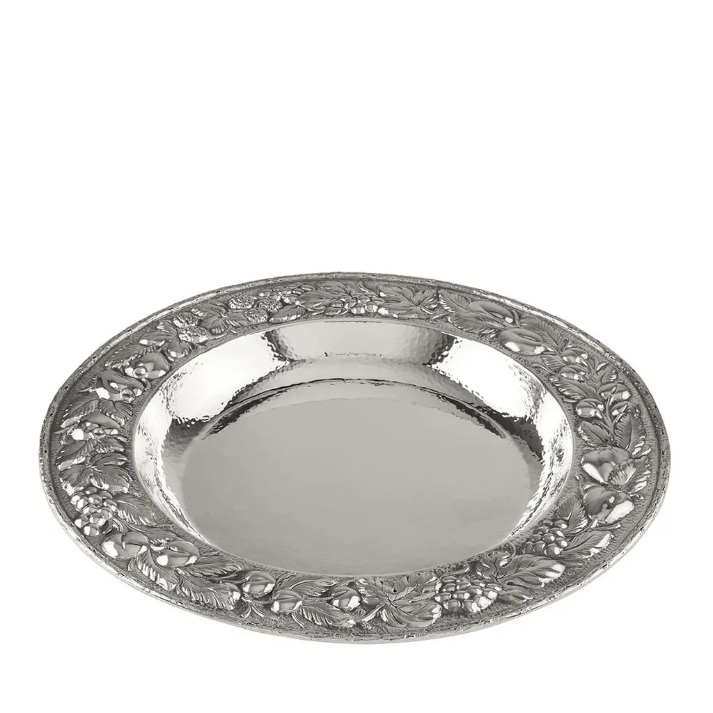 This elegant centrepiece is a deep dish entirely made in silver whose internal surface is textured with the Classic hammered surface, while the lip is intricately adorned with a magnificent chiselled decoration that depicts a garland of leaves, grapes and other fruit. This Classic piece is a timeless addition to a dining room and can be used in a variety of ways to serve small food on a table or to display flowers or small everyday items in an entryway.