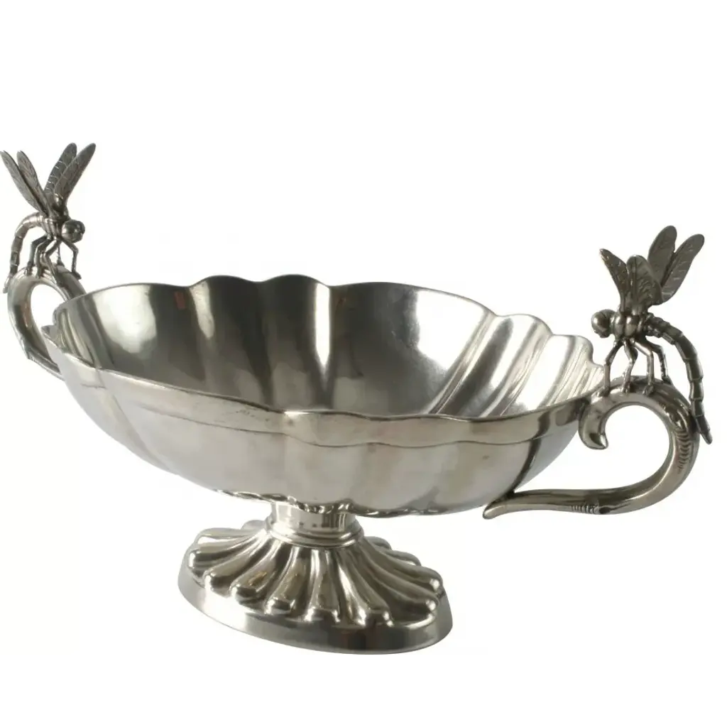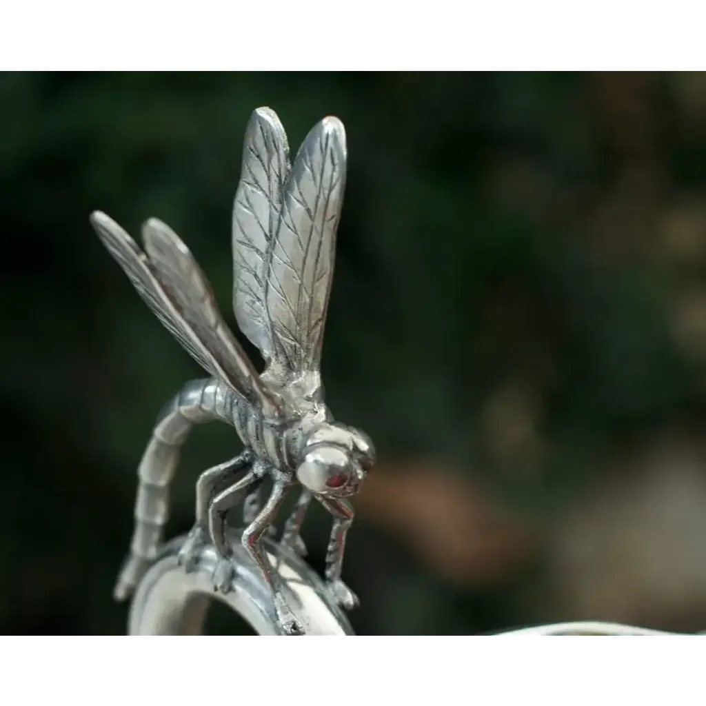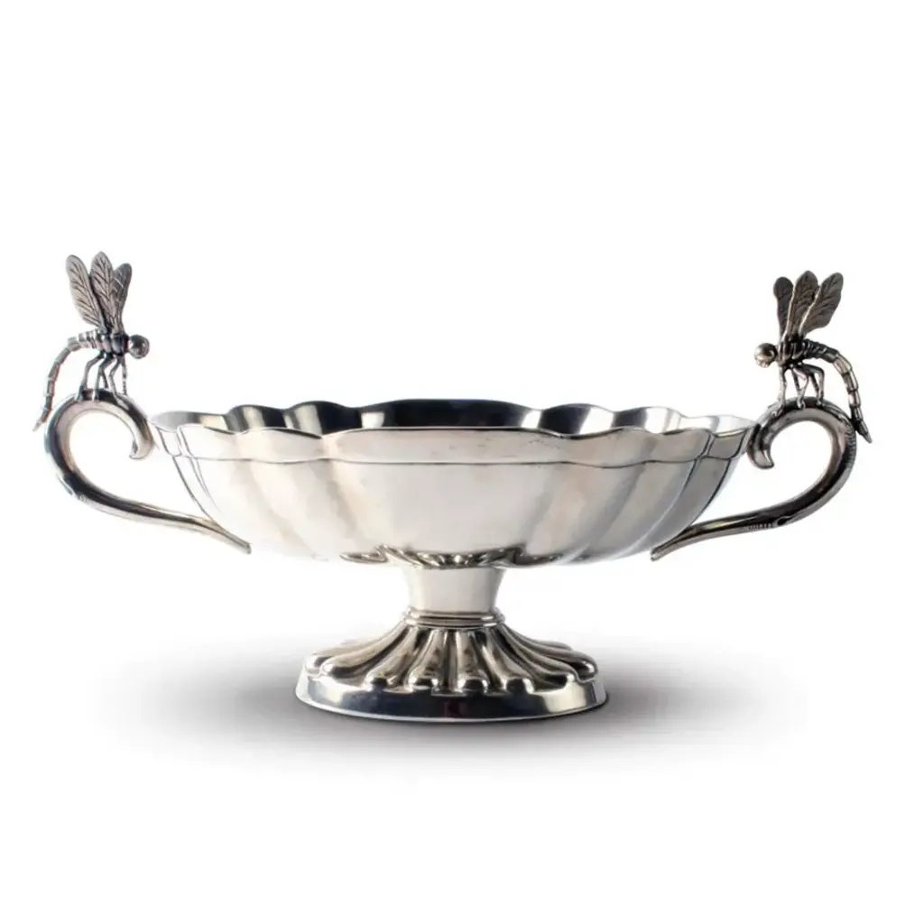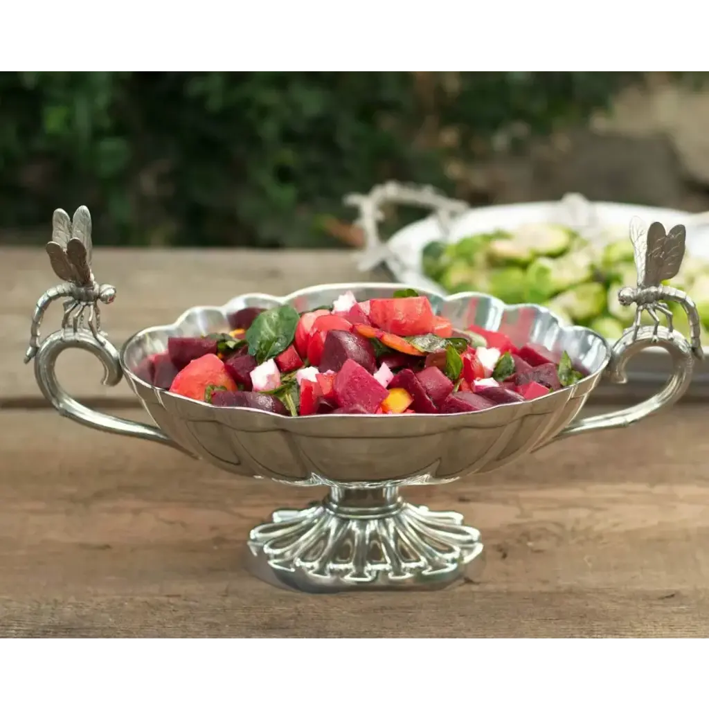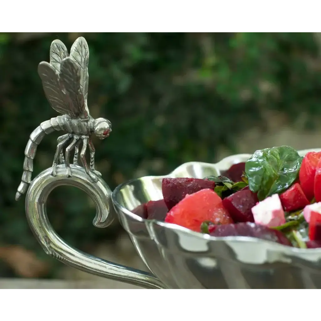 Dragonflies face off as they rest on each side of this attention-grabbing centerpiece from Vagabond House. Perched atop each handle, the creatures display remarkable realism in their intricate wings, wiry legs and curved abdomens. Scalloped edges on the rim and base of this pewter piece accentuate its symmetrical design. Vagabond House is a family-owned American company specializing in fine pewter tableware, servingware and giftware. Largely inspired by nature, their exclusive products are designed to be unique, functional heirlooms for those who seek to express tradition and style in both family and formal entertaining.