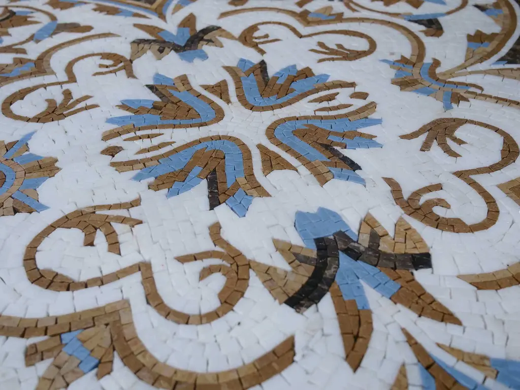 Introducing our exquisite Geometric Mosaic - Flowers & Circles, a stunning piece of art that effortlessly blends elegance with contemporary design. This handcrafted masterpiece features two large, gracefully intertwined circles adorned with an array of delicate flower shapes, all set against a pristine white background. Each element of this mosaic has been meticulously crafted from high-quality marble stones, ensuring durability and a luxurious finish that remains timeless.The Geometric Mosaic - Flowers & Circles is perfect for adding a unique centerpiece to your living space, whether it's on your walls or floors. Its intricate design draws the eye, inviting admiration and conversation while seamlessly integrating into a variety of decor styles. Each flower representation within the circles symbolizes beauty and growth, making it not just a decorative piece, but one that inspires positivity and a sense of serenity in your home.Imagine this beautiful mosaic gracing your entryway, bathroom, or living room, transforming the ambience with its elegant charm. The versatility of our Geometric Mosaic - Flowers & Circles allows it to enhance any surface, from a bold feature wall to a sophisticated floor design. Because our mosaics are entirely handmade, every piece is unique, showcasing the artisanship and care that goes into its creation. The use of natural marble stones not only provides a rich texture and depth but also ensures that it stands the test of time, remaining a cherished part of your decor for years to come.Elevate your interior design with the Geometric Mosaic - Flowers & Circles and create a visually captivating space that reflects your style and personality. Order yours today and experience the transformative power of handcrafted artistry!